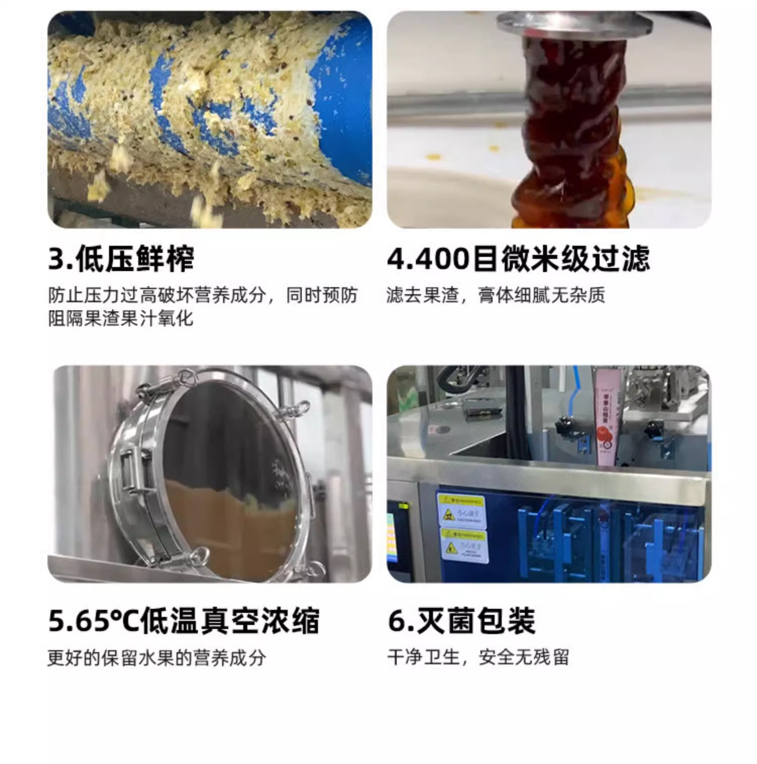 低压鲜榨,防止压力过高破坏营养成分。400目微米级过滤,滤去果渣,膏体细腻。