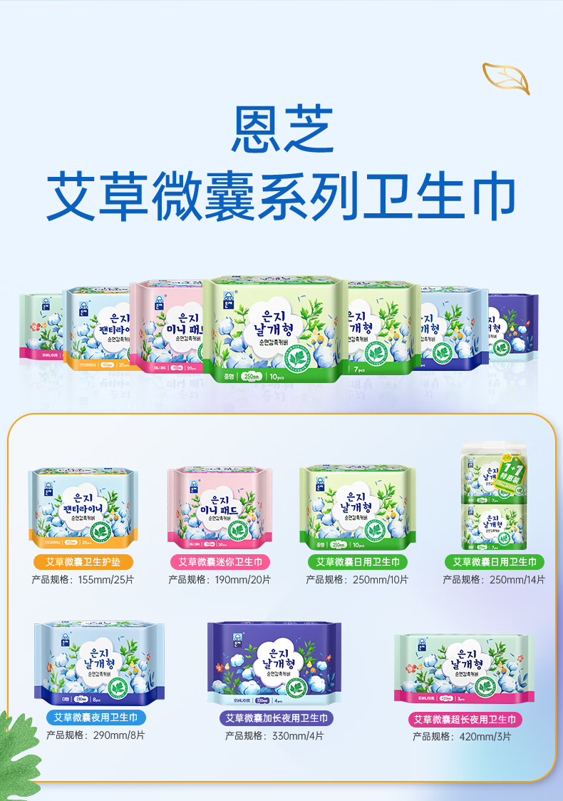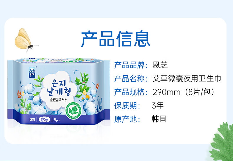 【2包装】恩芝韩国进口夜用卫生巾艾草植萃微囊私护抑菌超薄姨妈巾290mm*8片/包