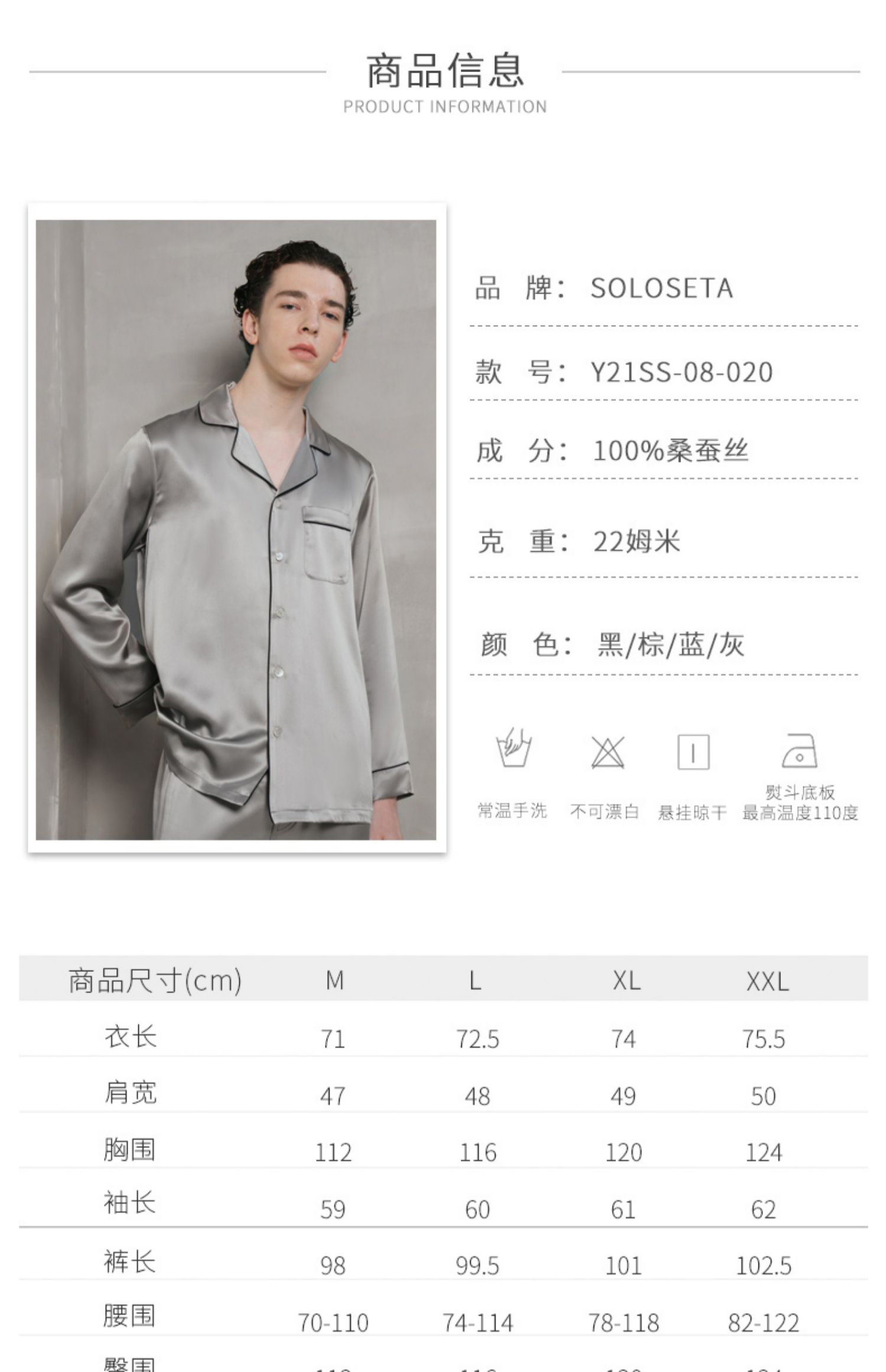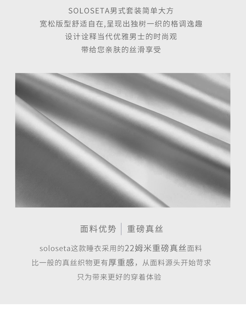 - soloseta专注于真丝织物,灵感源自意大利语,中文含义为“只做真丝”的意思。让睡衣变时尚,居家和外出瞬间切换,使其更具有出街,度假,参加宴会等功能。