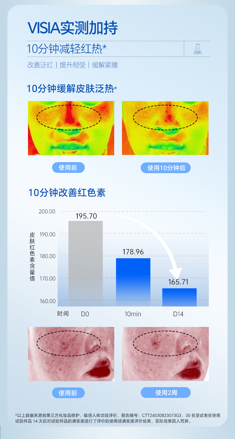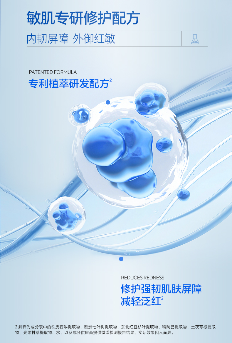 不仅具有修红效果,更能够强化肌肤屏障功能。其富含的修护成分能够加速细胞基底功能,促进受损肌肤的修复与再生,使肌肤更加坚韧、有弹性