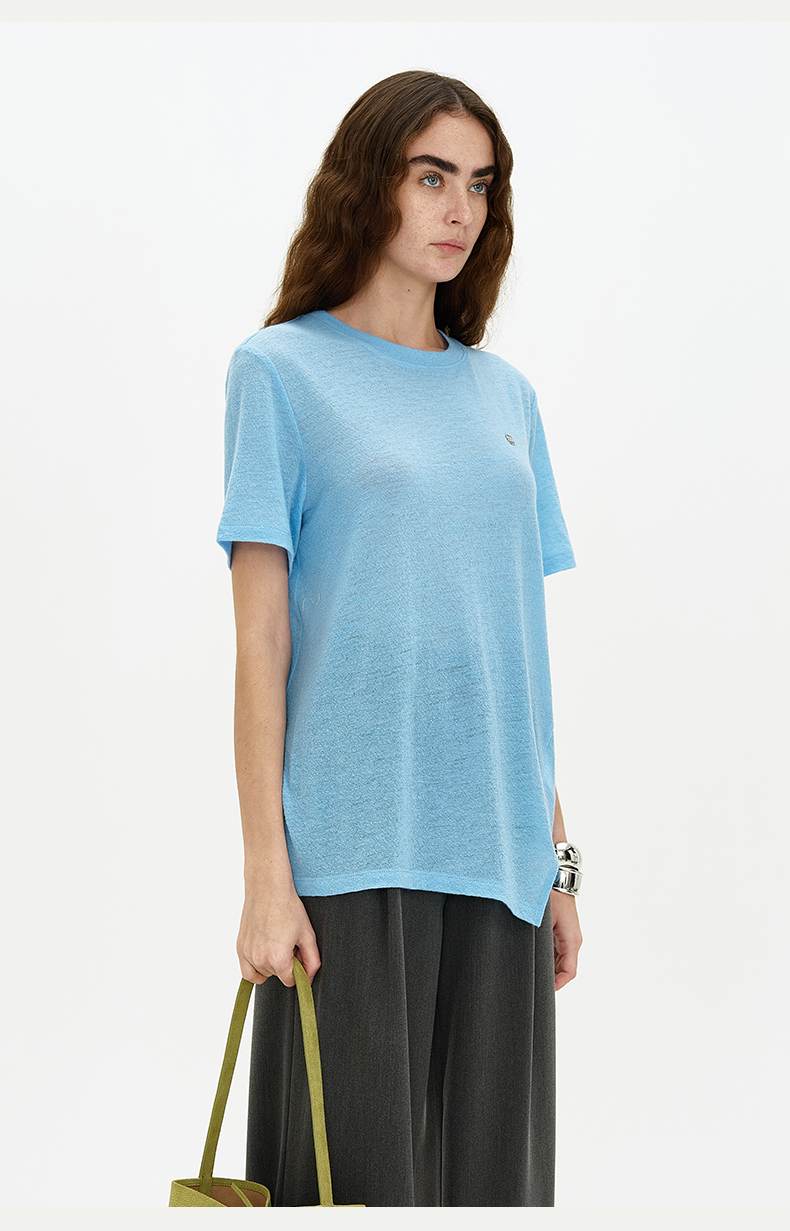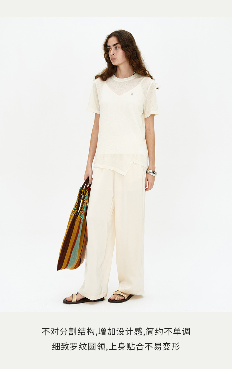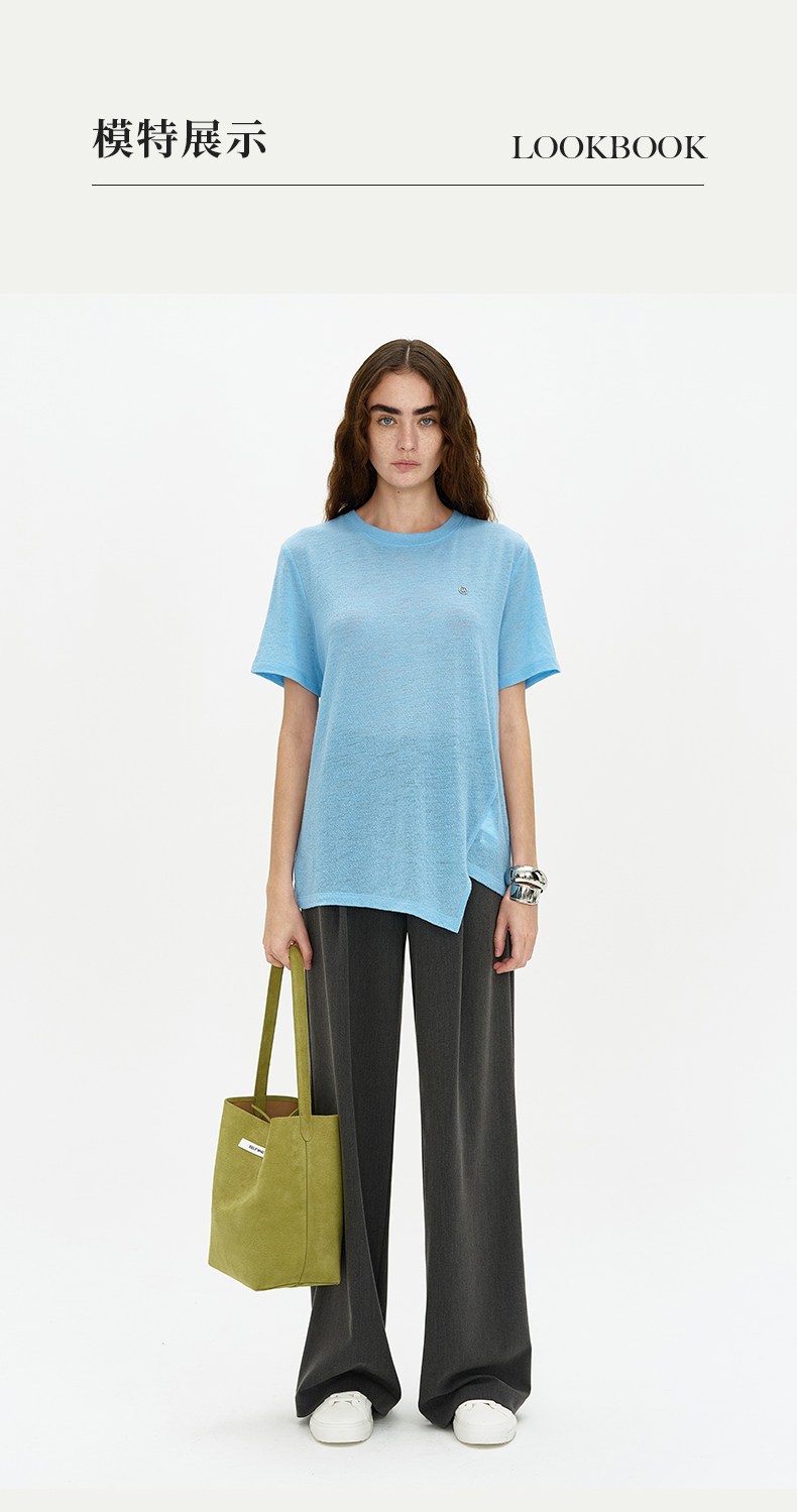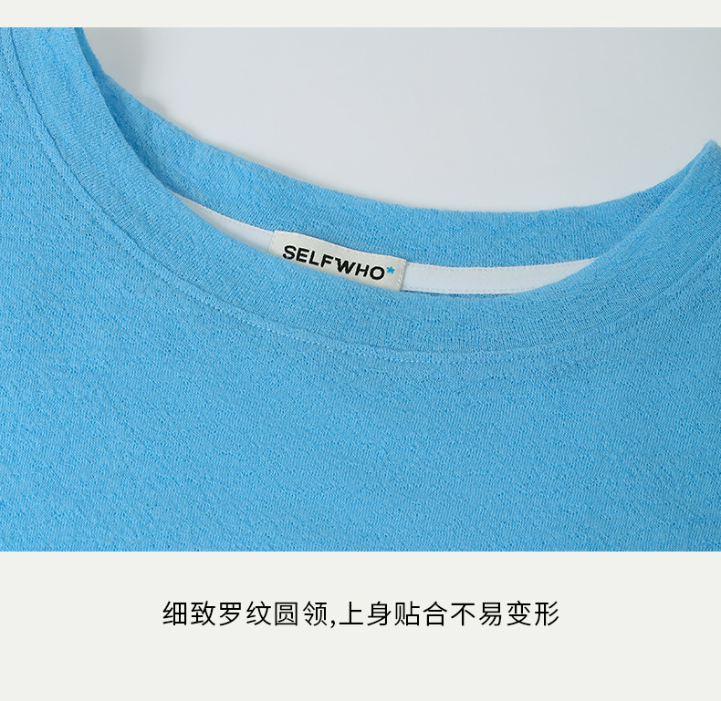SELFWHO 纯羊毛T恤2024夏新款罗纹圆领亲肤柔软透气正肩短袖上衣