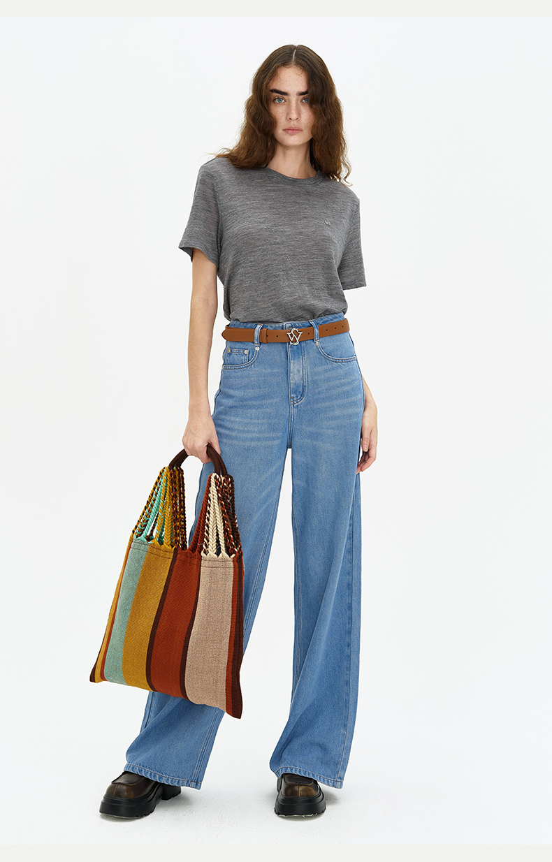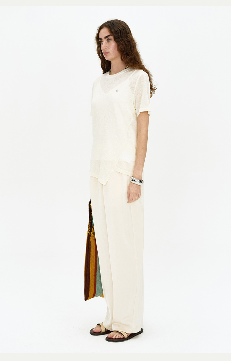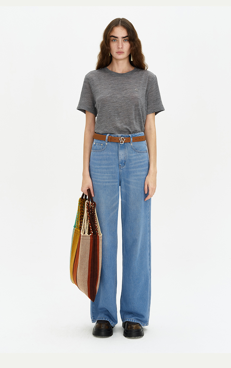 SELFWHO 纯羊毛T恤2024夏新款罗纹圆领亲肤柔软透气正肩短袖上衣