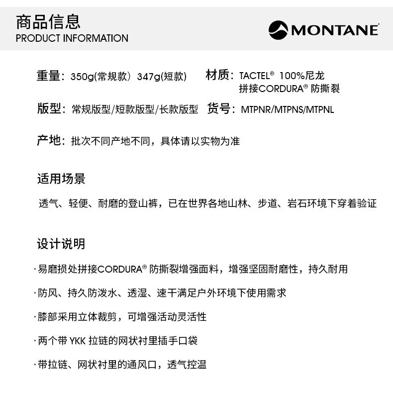 MONTANE 盟泰恩TERRA徒步裤男 防水防风轻量耐磨户外长裤 透气软壳裤登山