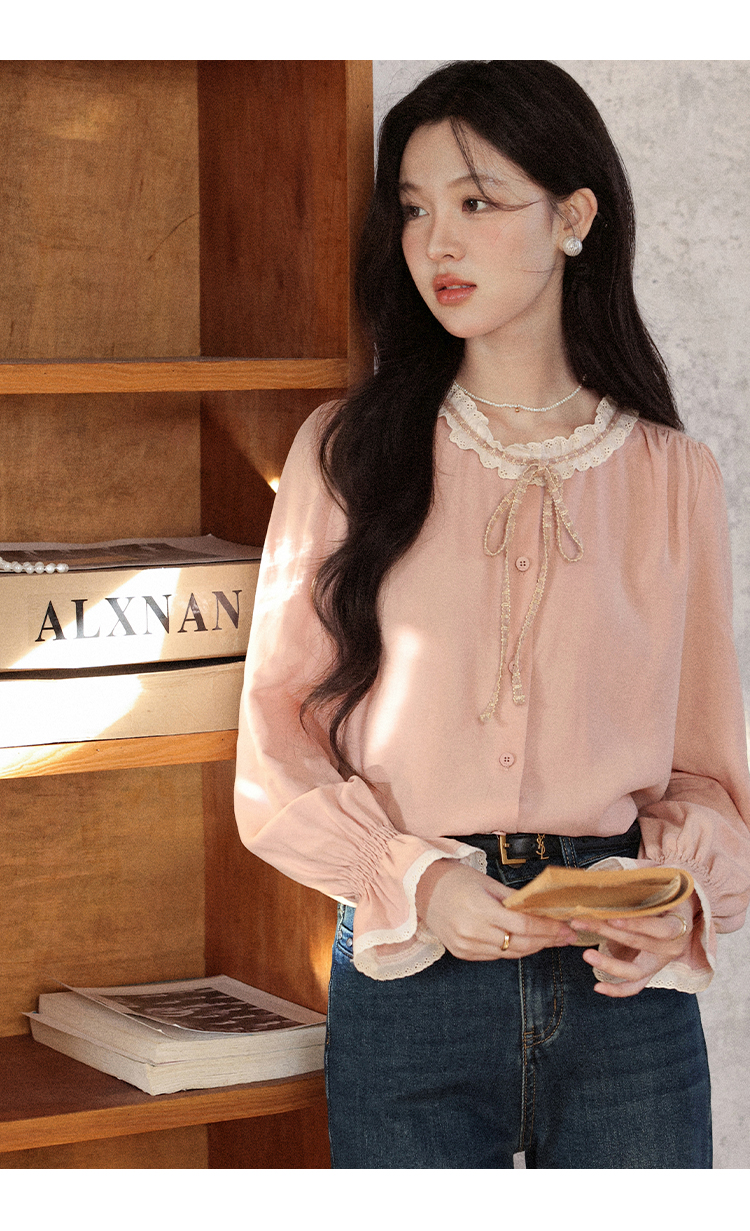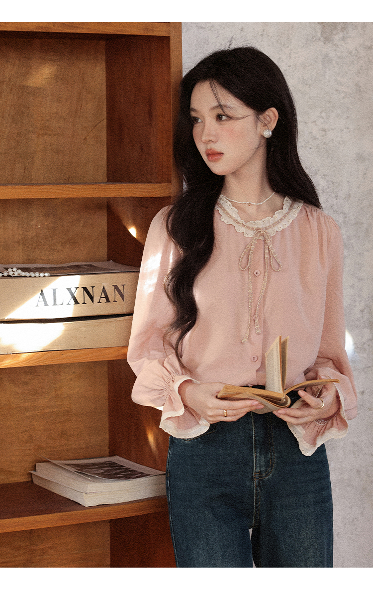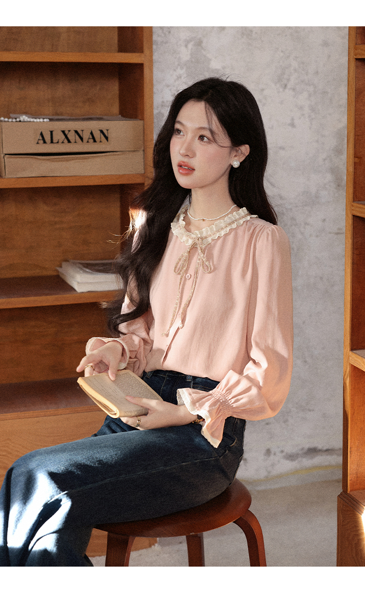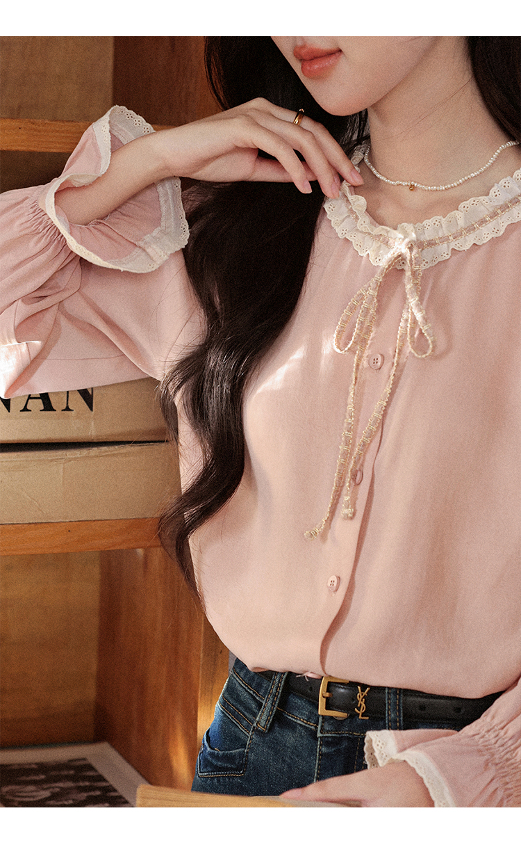 【6折秒杀】鹿向南「樱花糖霜」木耳边粉色内搭衬衫秋季新款长袖法式开衫女士