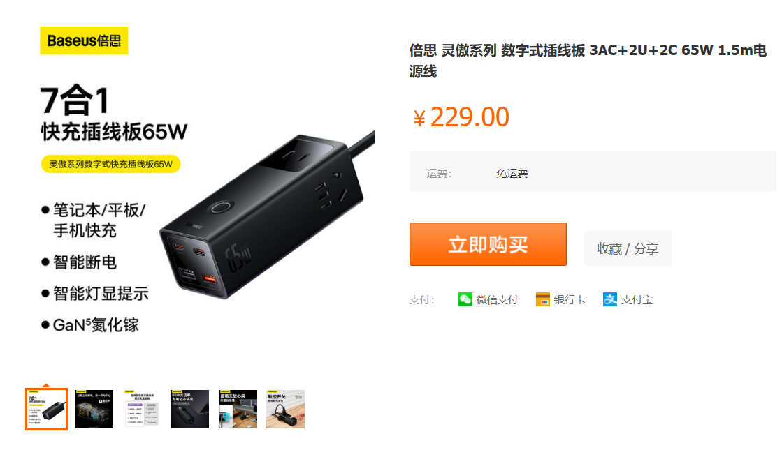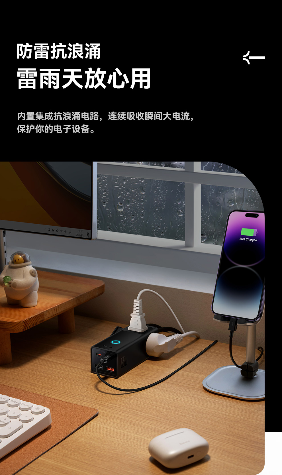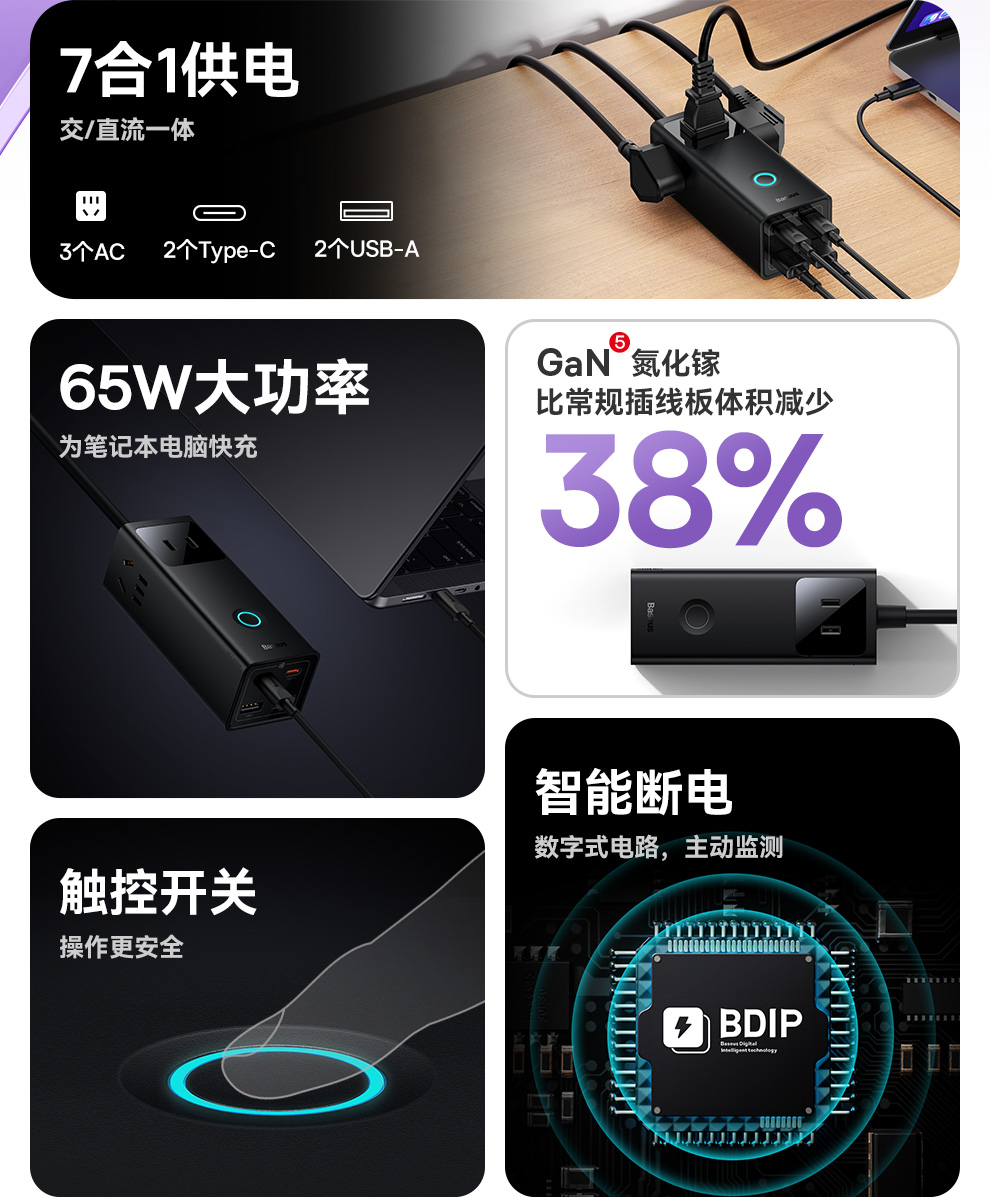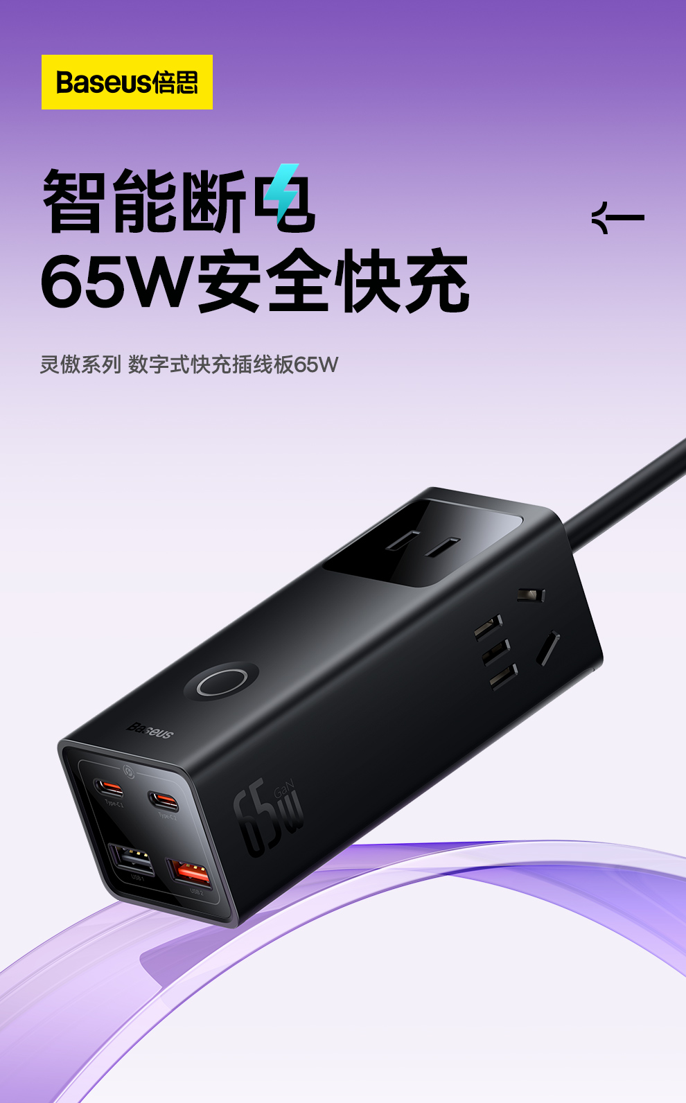 倍思 灵傲系列 数字式插线板 3AC+2U+2C 65W 1.5m电源线