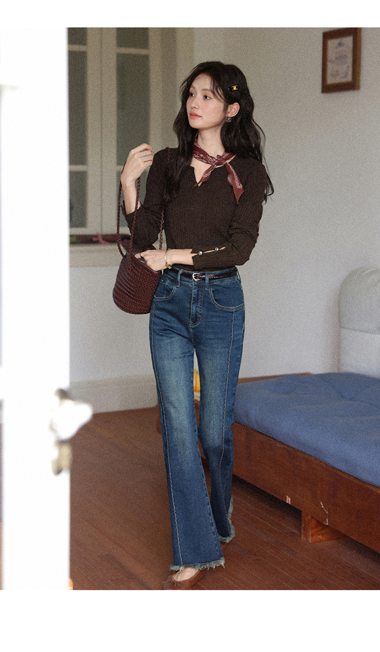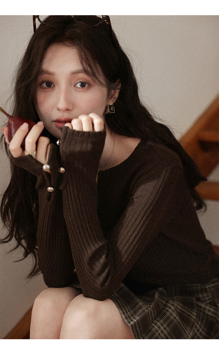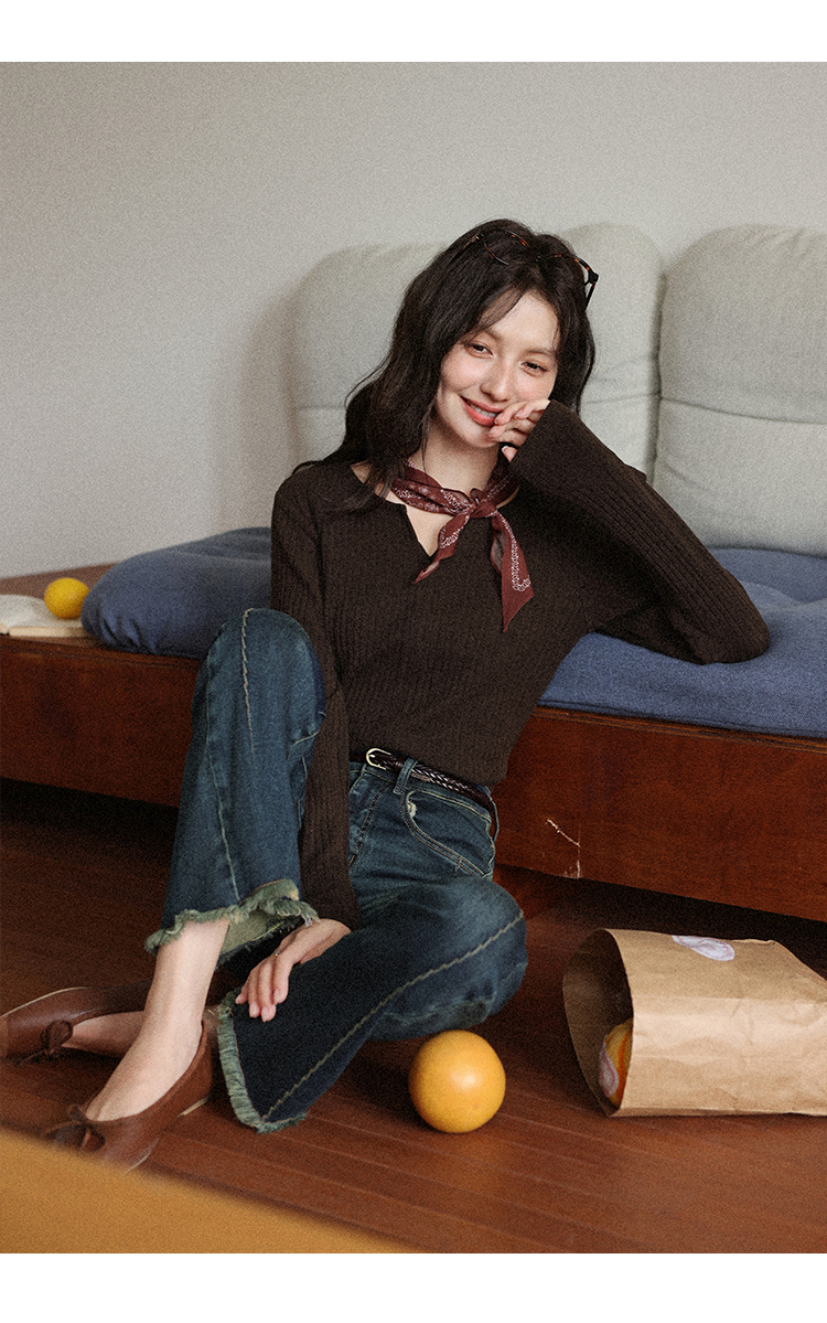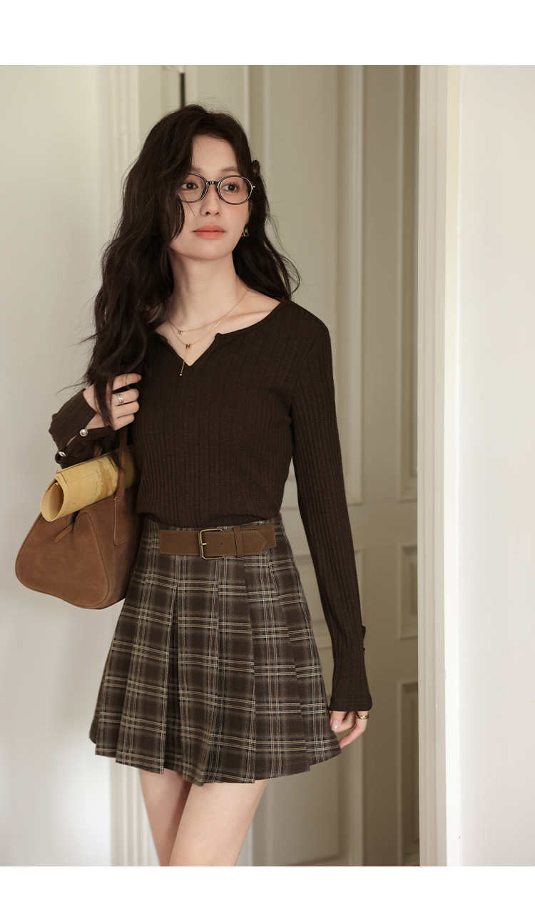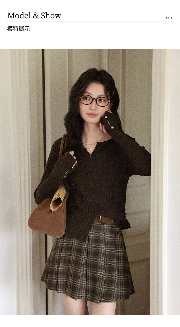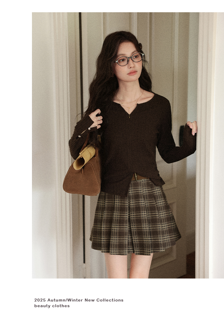 鹿向南「心跳节拍」气质咖色V领针织衫长袖T恤女早秋修身显瘦上衣