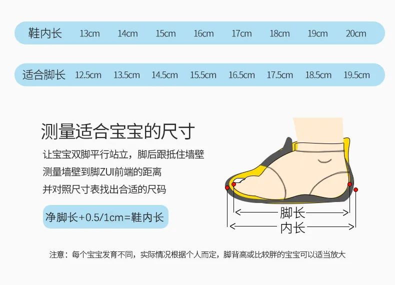 尺码洞洞鞋做了13-20cm的内长尺码,孩子可以根据脚长+1厘米来选购