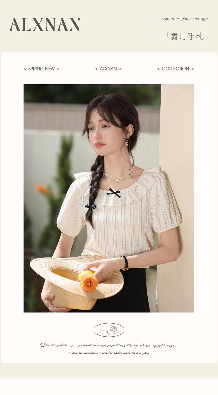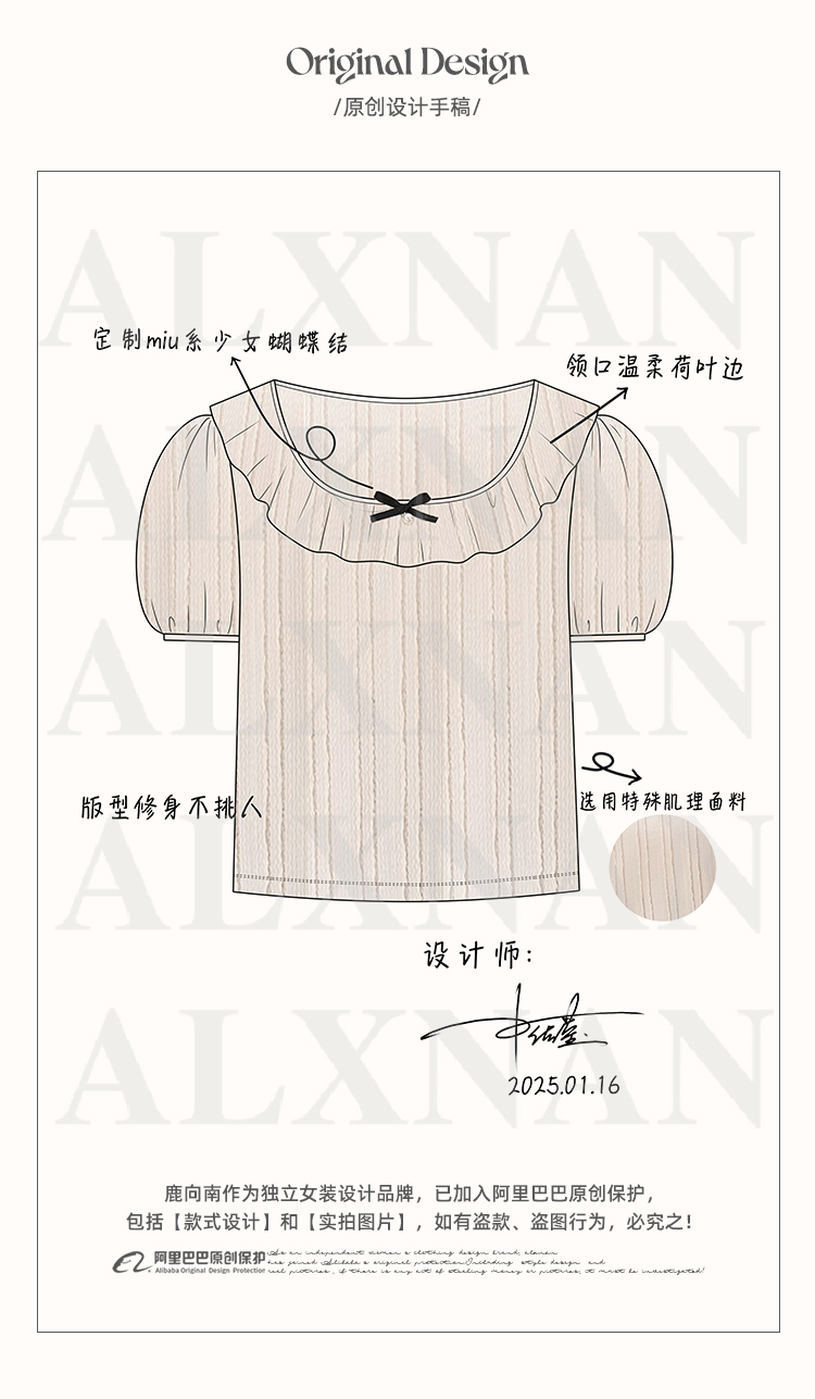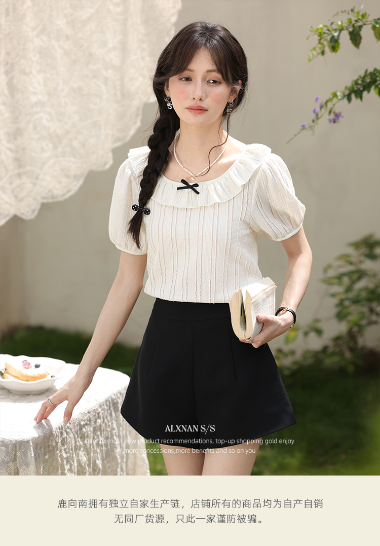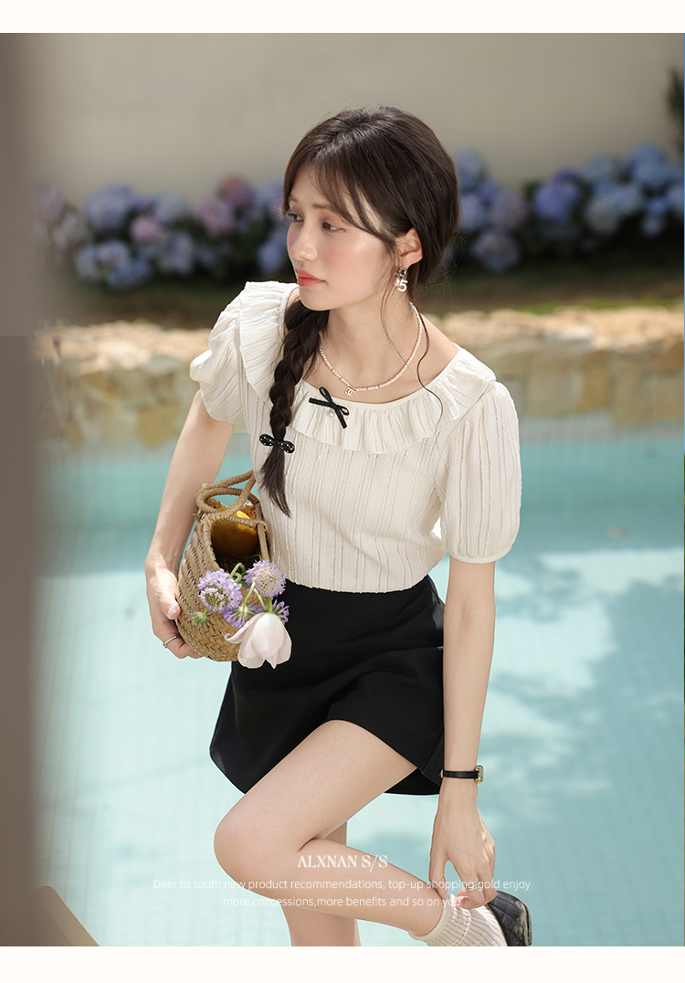 鹿向南「雾月手札」法式荷叶边拼接t恤女夏季新款设计感短袖上衣