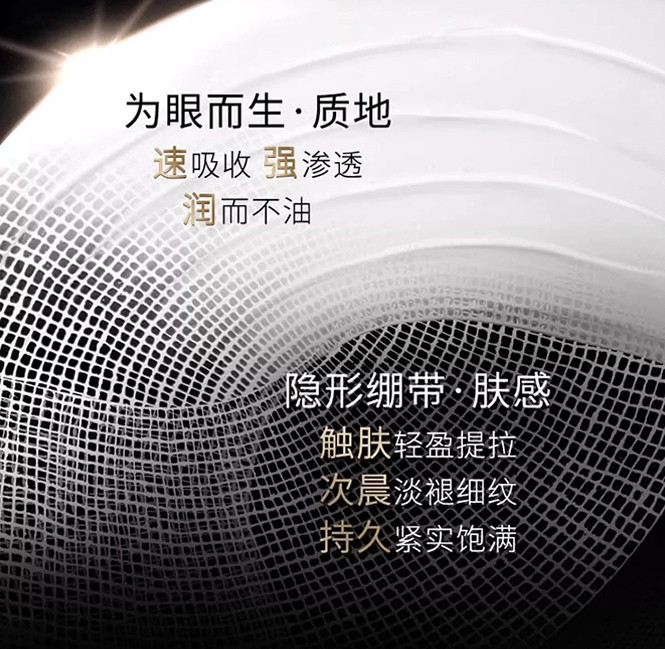 直接把30%的玻色因首度运用到眼部护理,再加上泛醇、四重玻尿酸组合出击,分层、分路径的去解决上面的问题。做到提拉、抚纹、紧实。