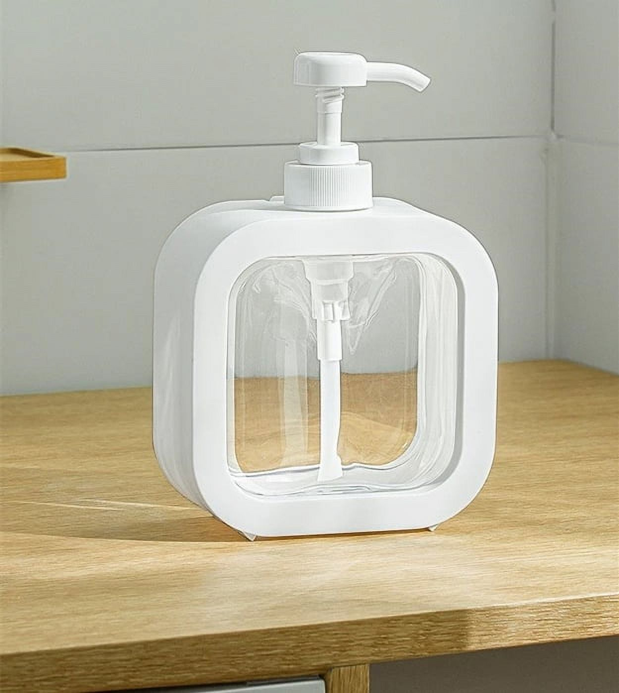 优雅设计:极简的白色设计能衬托任何浴室装饰,且在台面上占用空间极小。透明肥皂分配器配备了白色加固外壳,不仅外观精美,还大幅降低了掉落时断裂的风险。