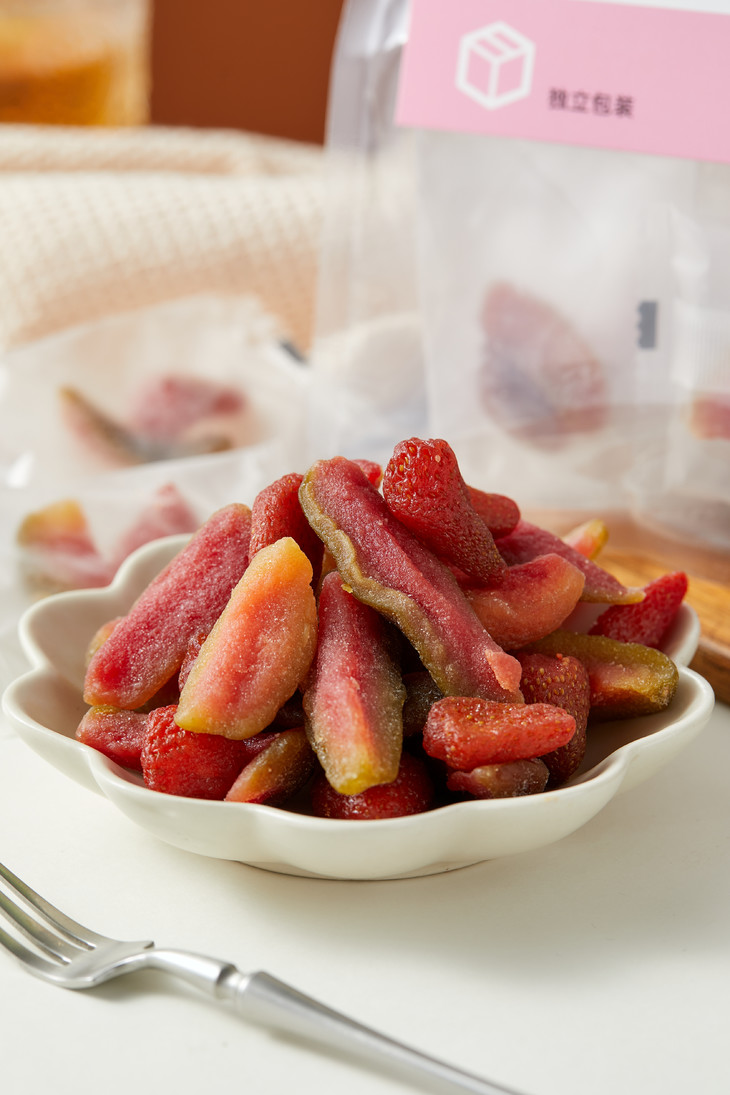 选用个大味甜的丹东草莓 一颗颗草莓红艳欲滴,初绽芳容 让果子充分的积累了香味和风味 层次分明,一口惊艳,两口沦陷! 用如此草莓烘干而成的草莓干, 自然也是极品中的极品。