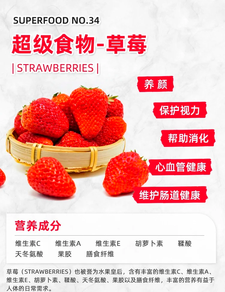 作为自然界明艳的“营养红宝石” 草莓的维生素C含量远超橙子、柠檬 是抗氧化和皮肤健康的“主力军” 还富含花青素、胡萝卜素和维生素A 简直是从美容到预防的小能手