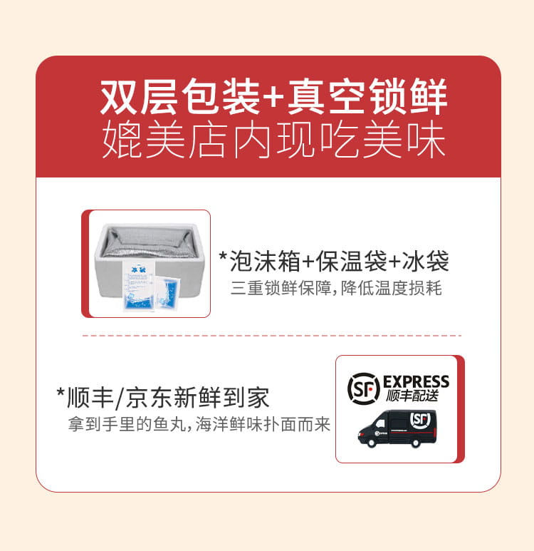 为了让大家能吃到新鲜的潮汕鱼丸,鱼丸都是采用双层包装+真空锁鲜,加上生鲜专用的泡沫密封保温箱和足量的冰袋,直接安排顺丰/京东极速到家的。