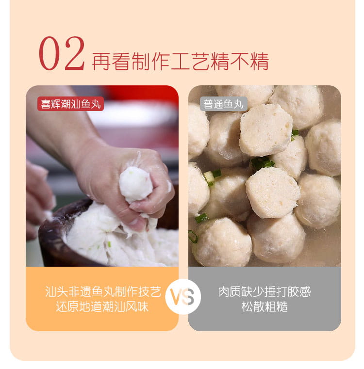 制作过程由汕头鱼丸制作技艺非遗传承人监制,优质海鱼肉经过上千次精细搅打,方能制成一颗颗弹牙脆爽的喜辉潮汕鱼丸。