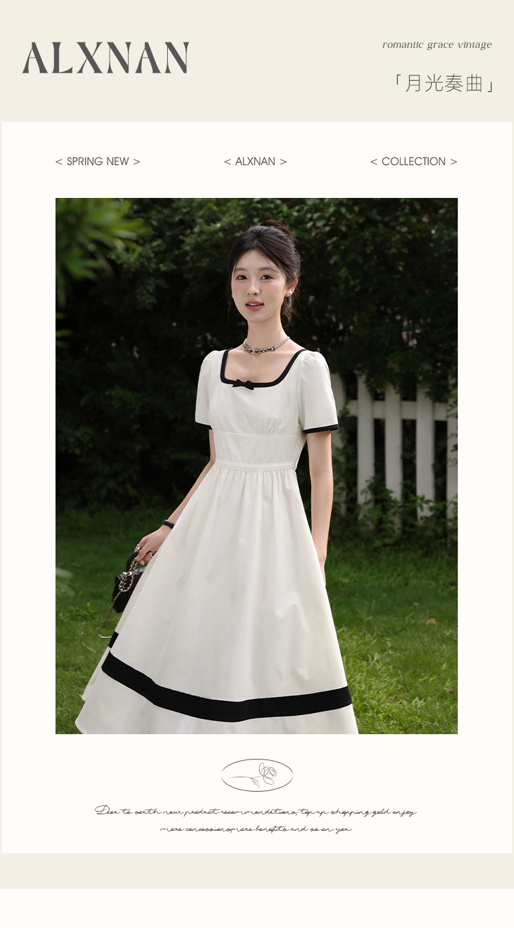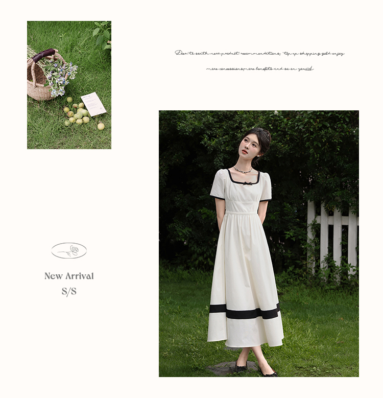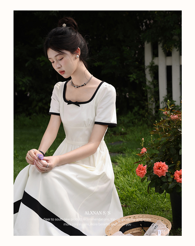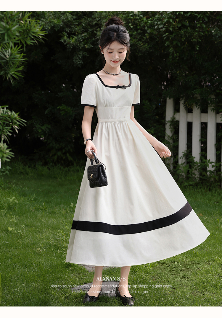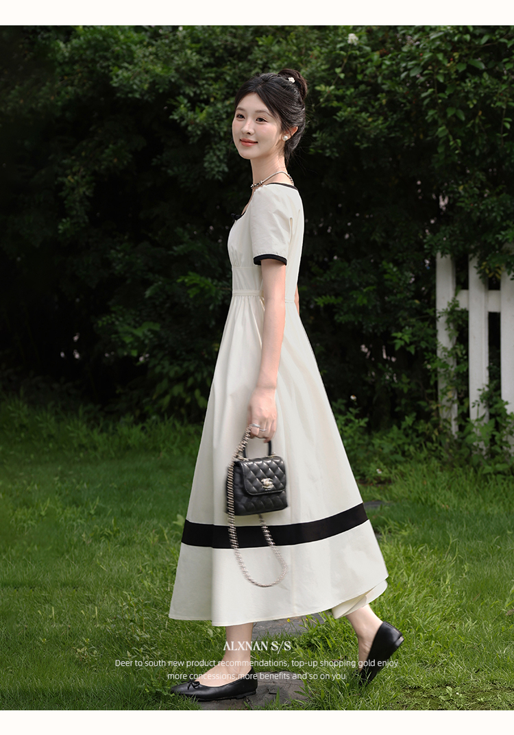 【6折秒杀】鹿向南「月裁雪裳」白色法式方领短袖连衣裙女夏拼色收腰A字长裙QJD00362