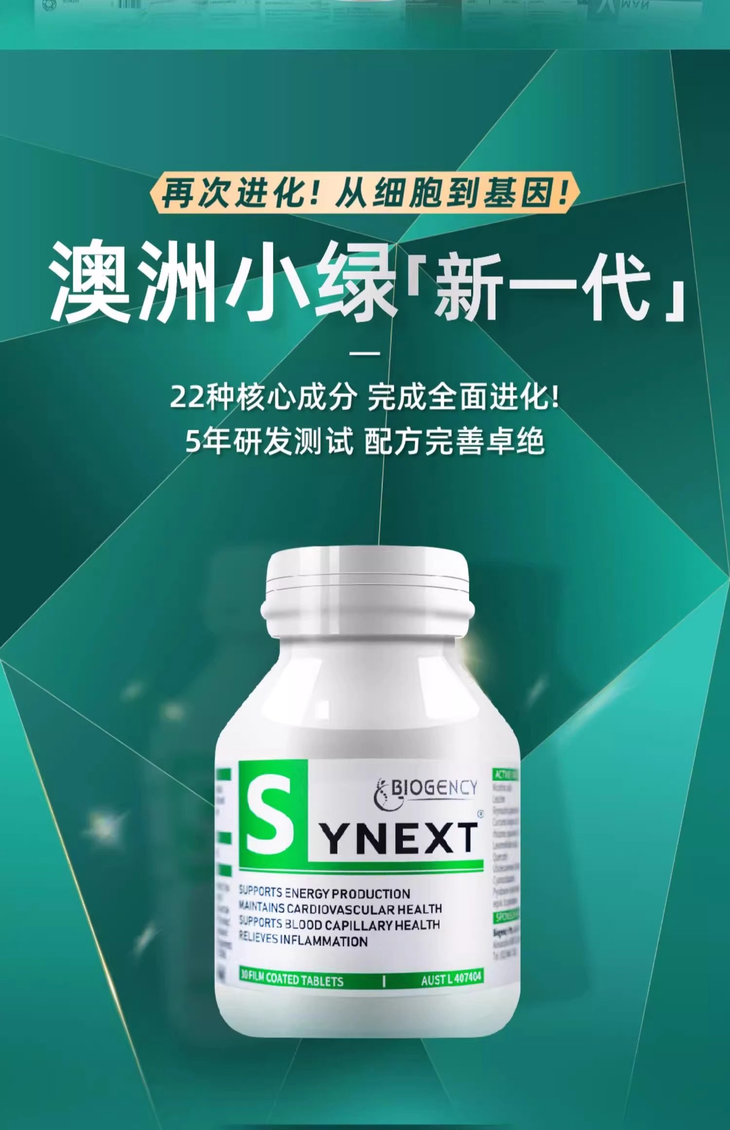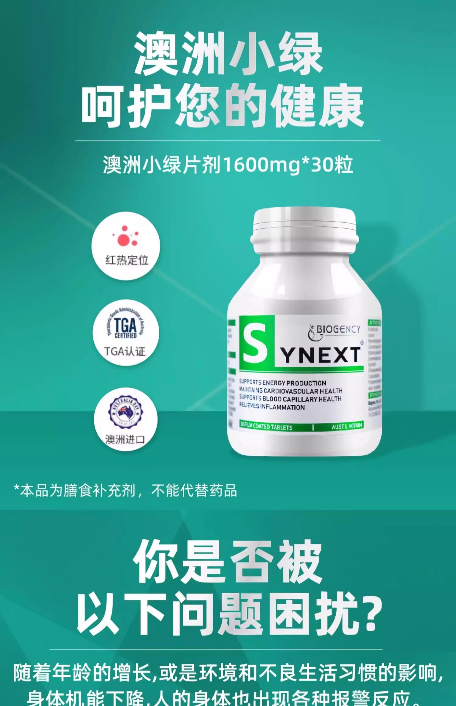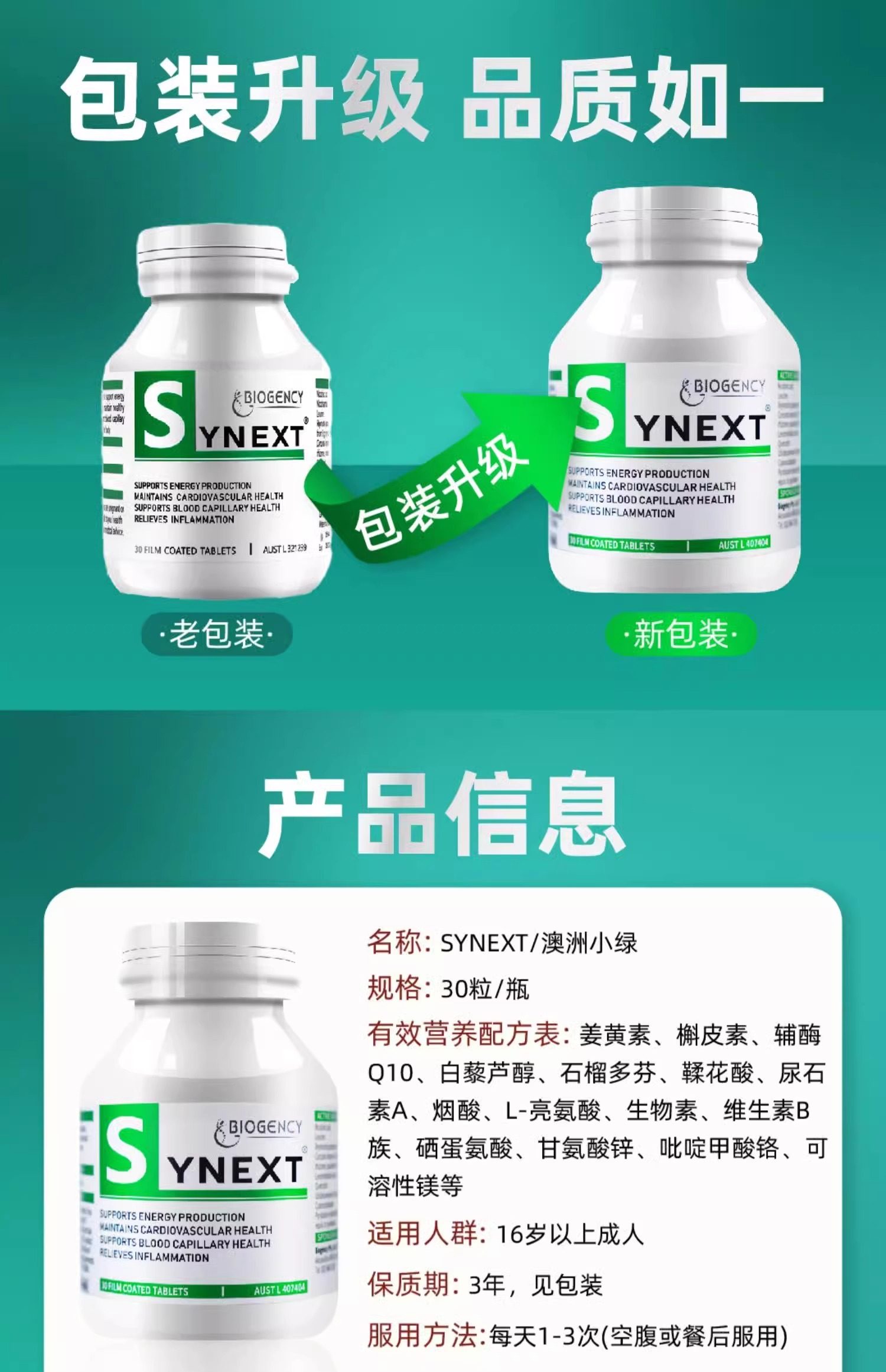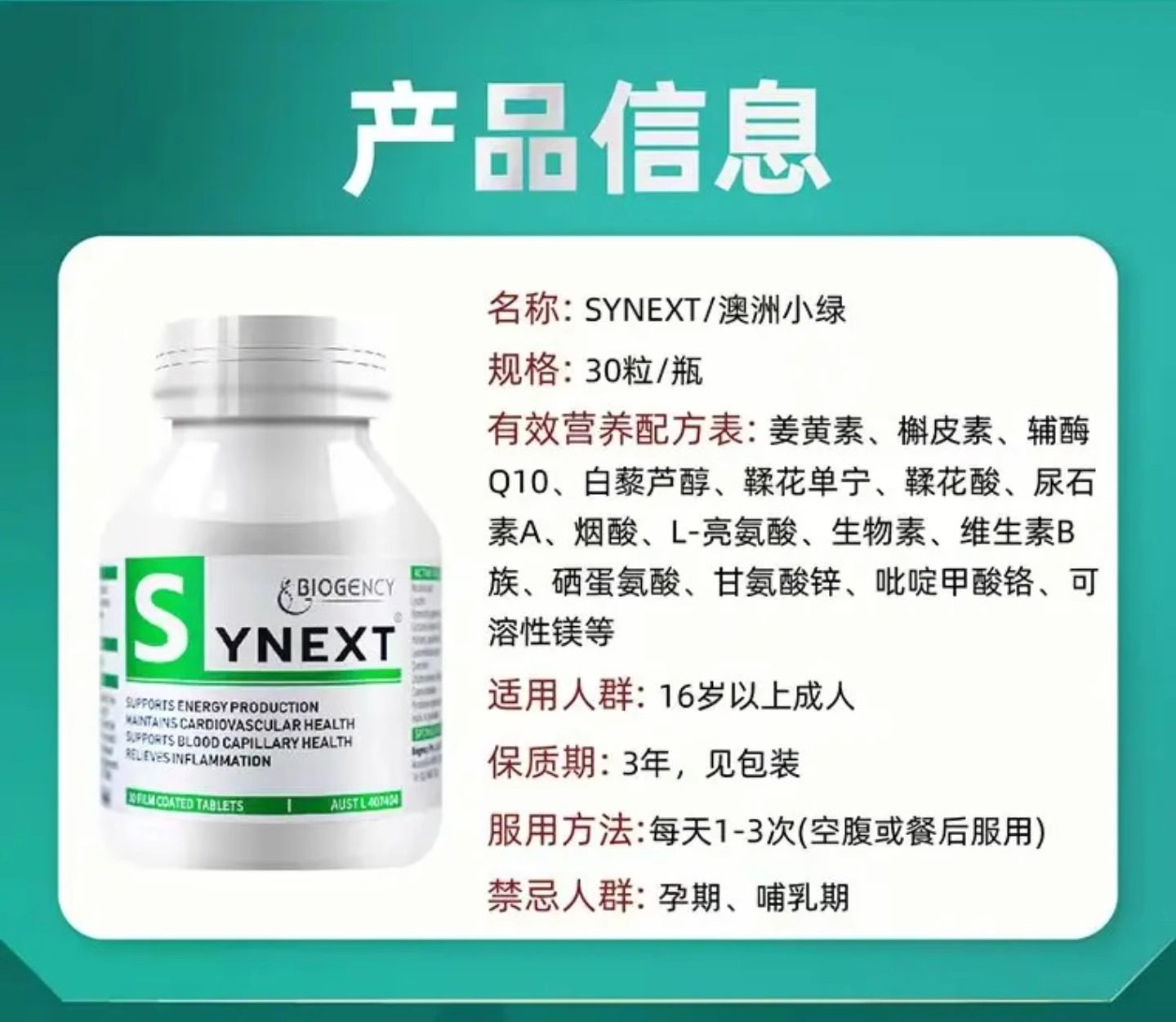 澳洲Synext新一代小绿瓶辅酶q10姜黄槲皮素复合维生素营养补充剂