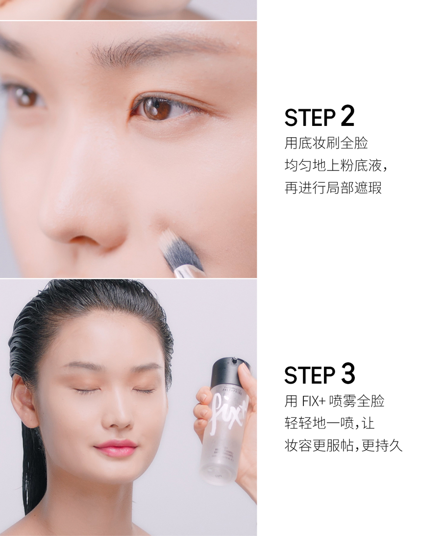 用海绵或选择其中一款粉底刷——粉底刷或魔术底妆刷(两者均分开销售)涂抹于洗净、滋润后的肌肤上。