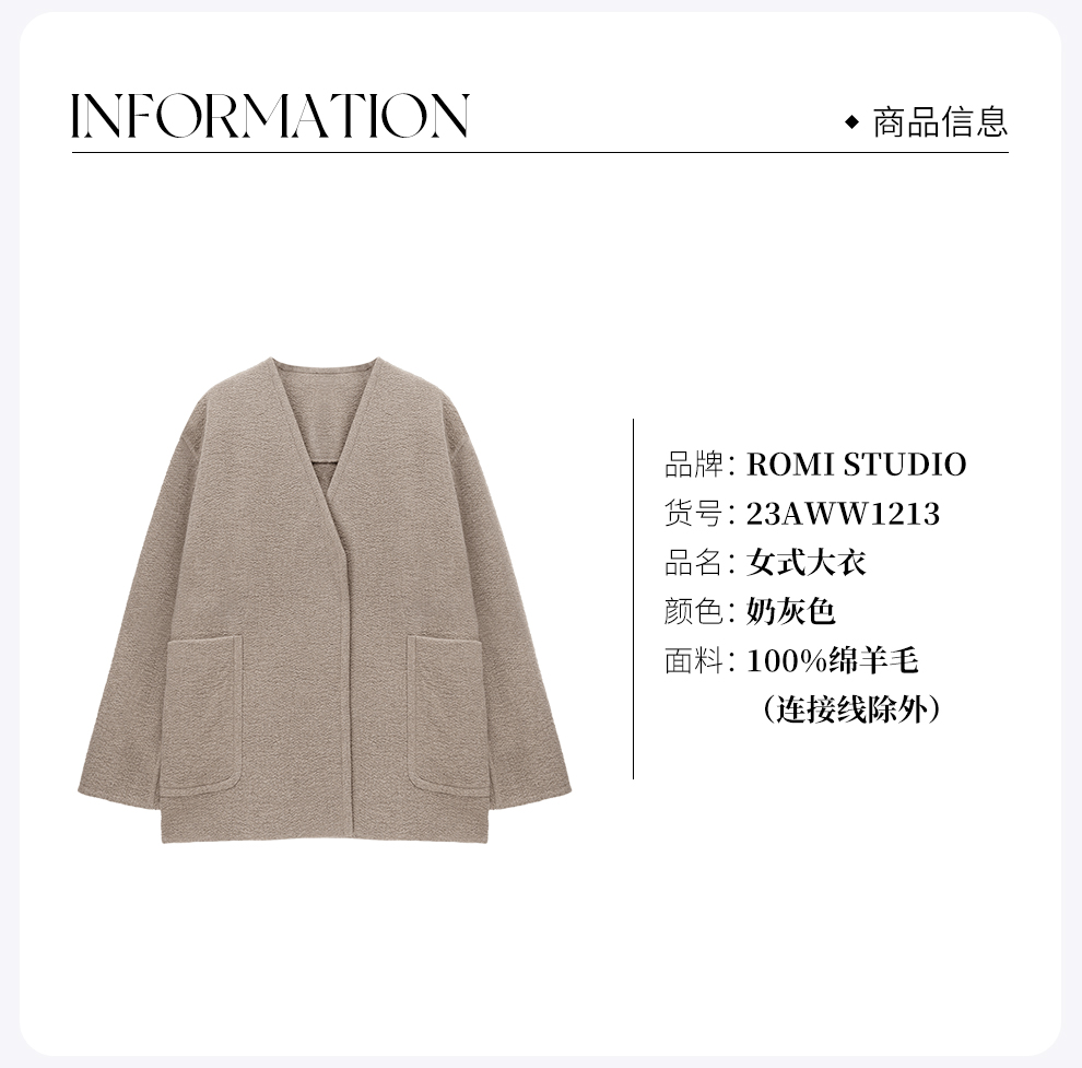 ROMI STUDIO“贵妇系列”100%绵羊毛肌理感无领廓形大衣23AWW1213