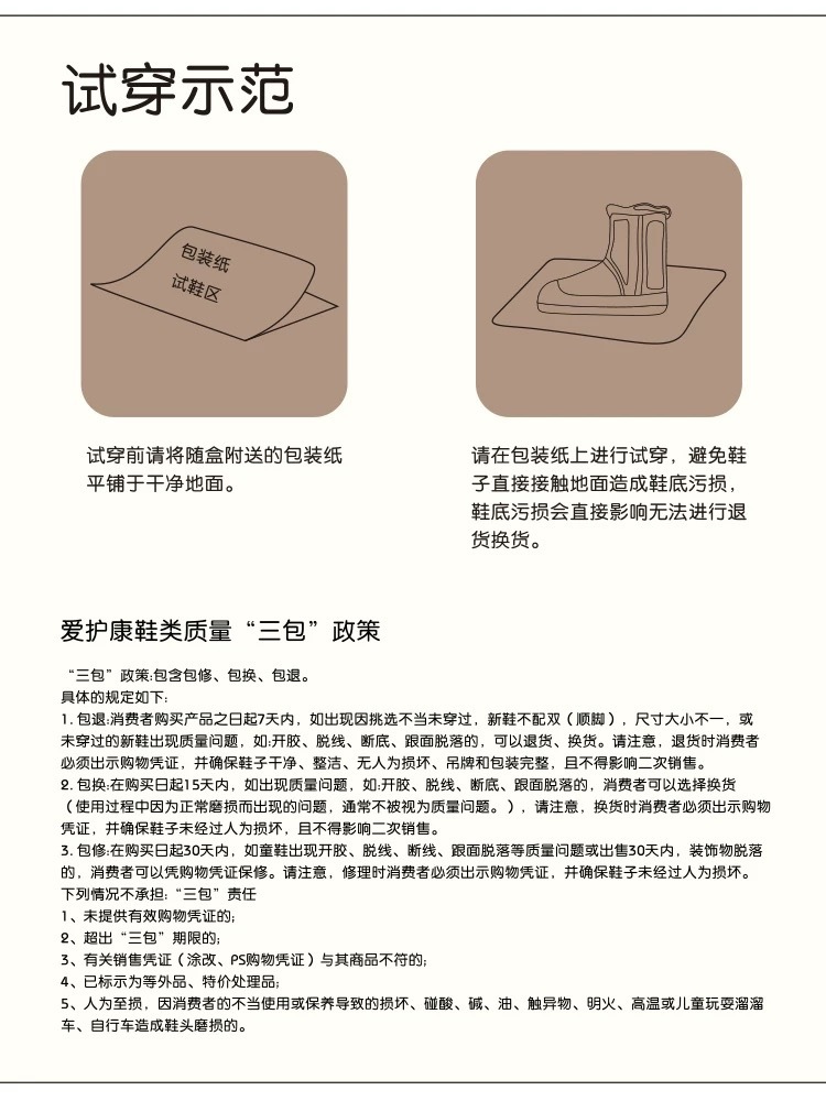 【售后规则】 1.拦截/拒收:货物一旦发出,不支持拦截退款,拦截拒收扣5元,因客户原因导致的【临时退单】或【拒收】产生的运费,则由客户自行承担拦截运费 2.是否支持7天无理由:支持,如质量问题需要换货,由客户垫付运费自行寄回,收到退货验收无误后报销运费。如码数问题需要换货,运费由客户承担,同时保证不影响二次销售,鞋盒上不允许写取件码。到付件拒收。 3.发货包装:鞋盒配外包装袋。退换货不要在鞋子或者产品上写取件码! 4.售后标准:如有少发、破损、质量问题等,请及时把【验收产品】和【快递面单】一起拍照反馈,缺一不可。