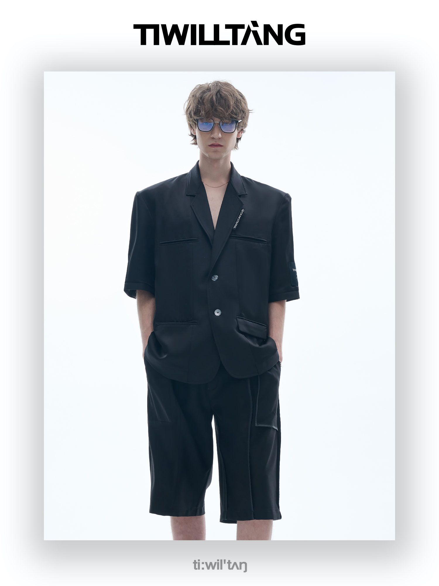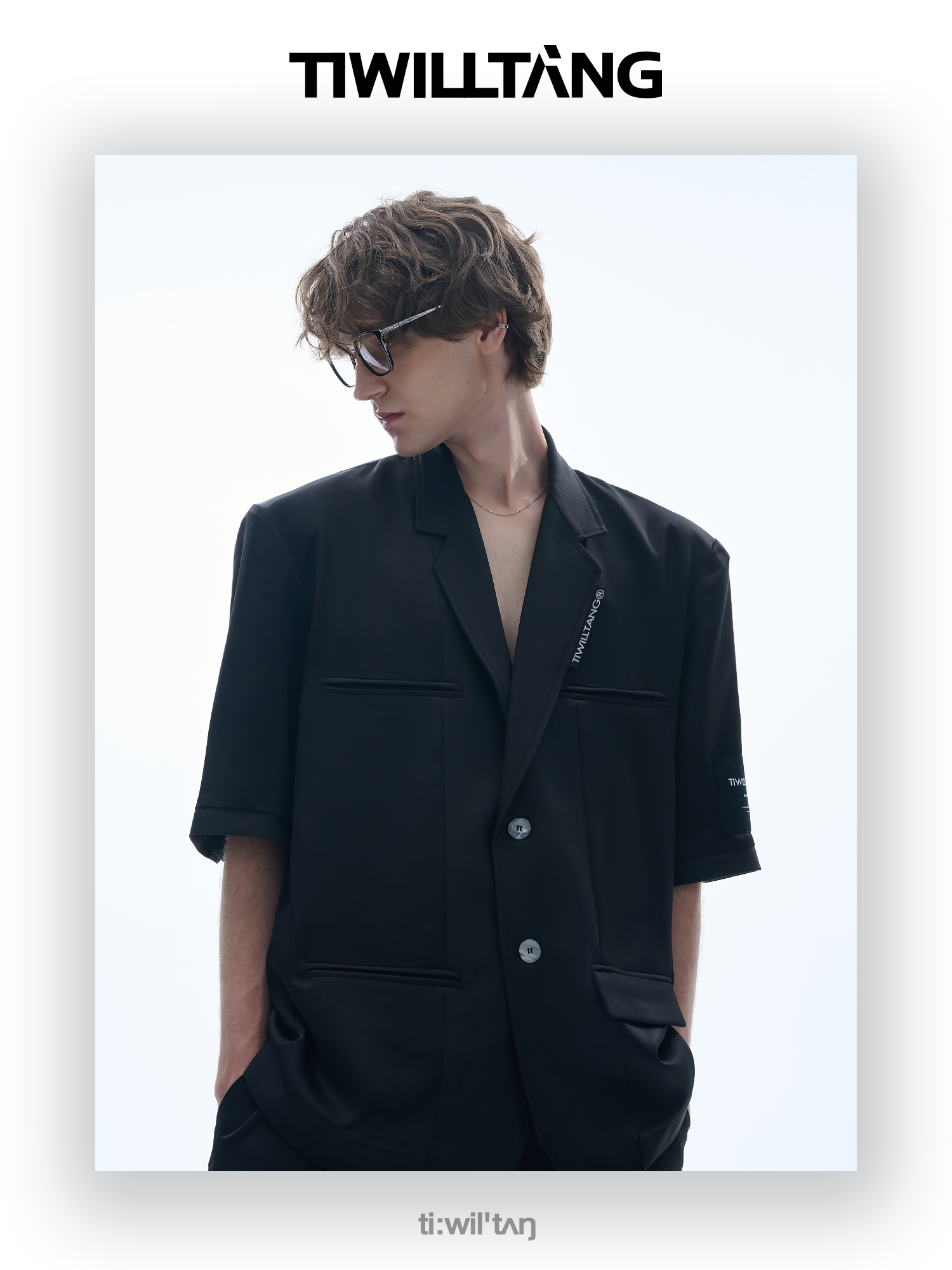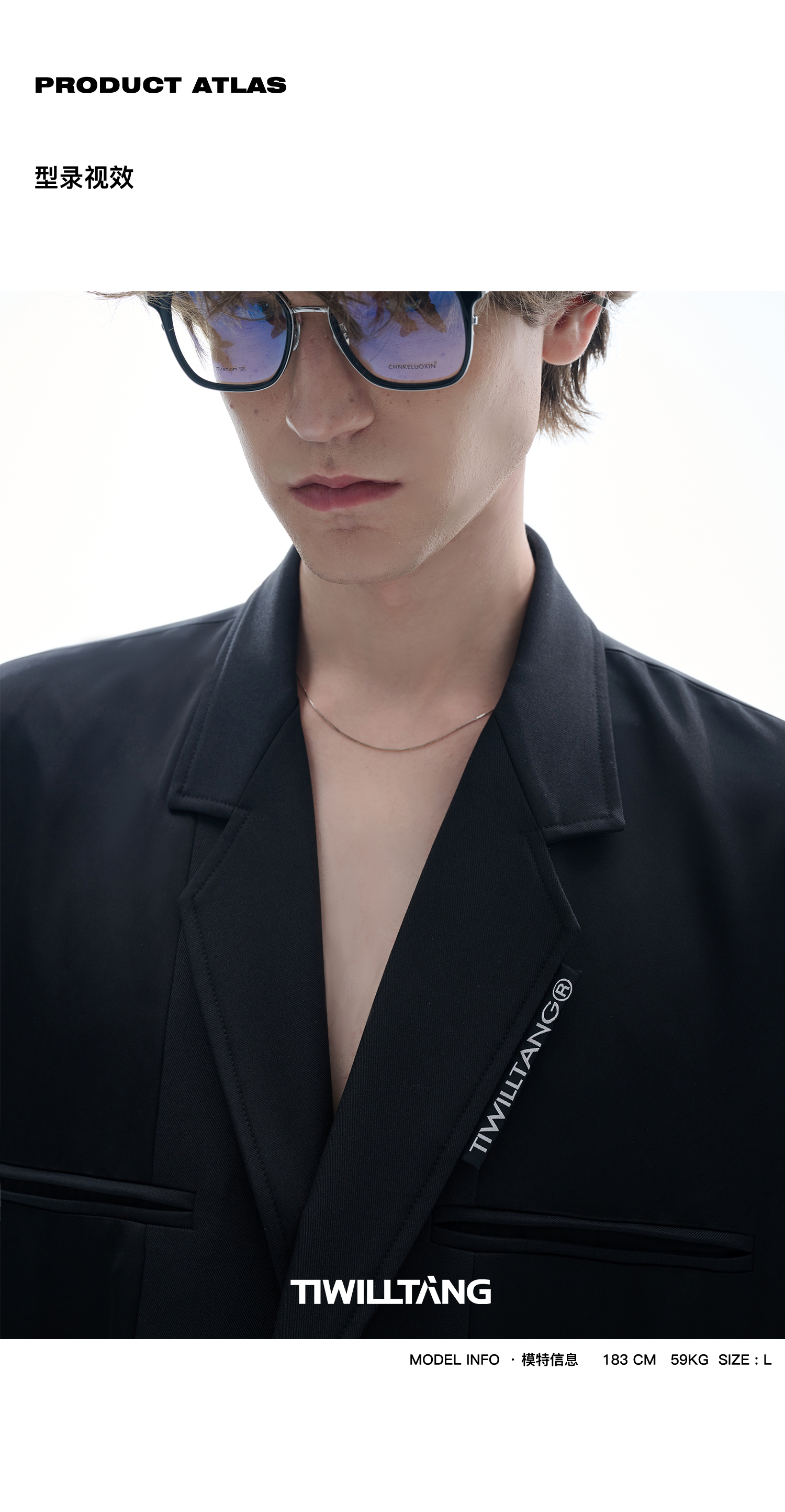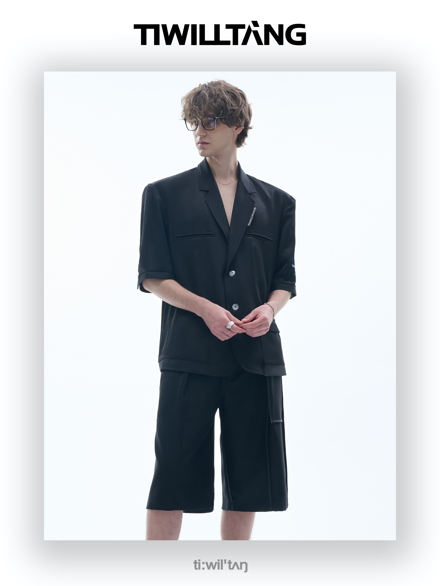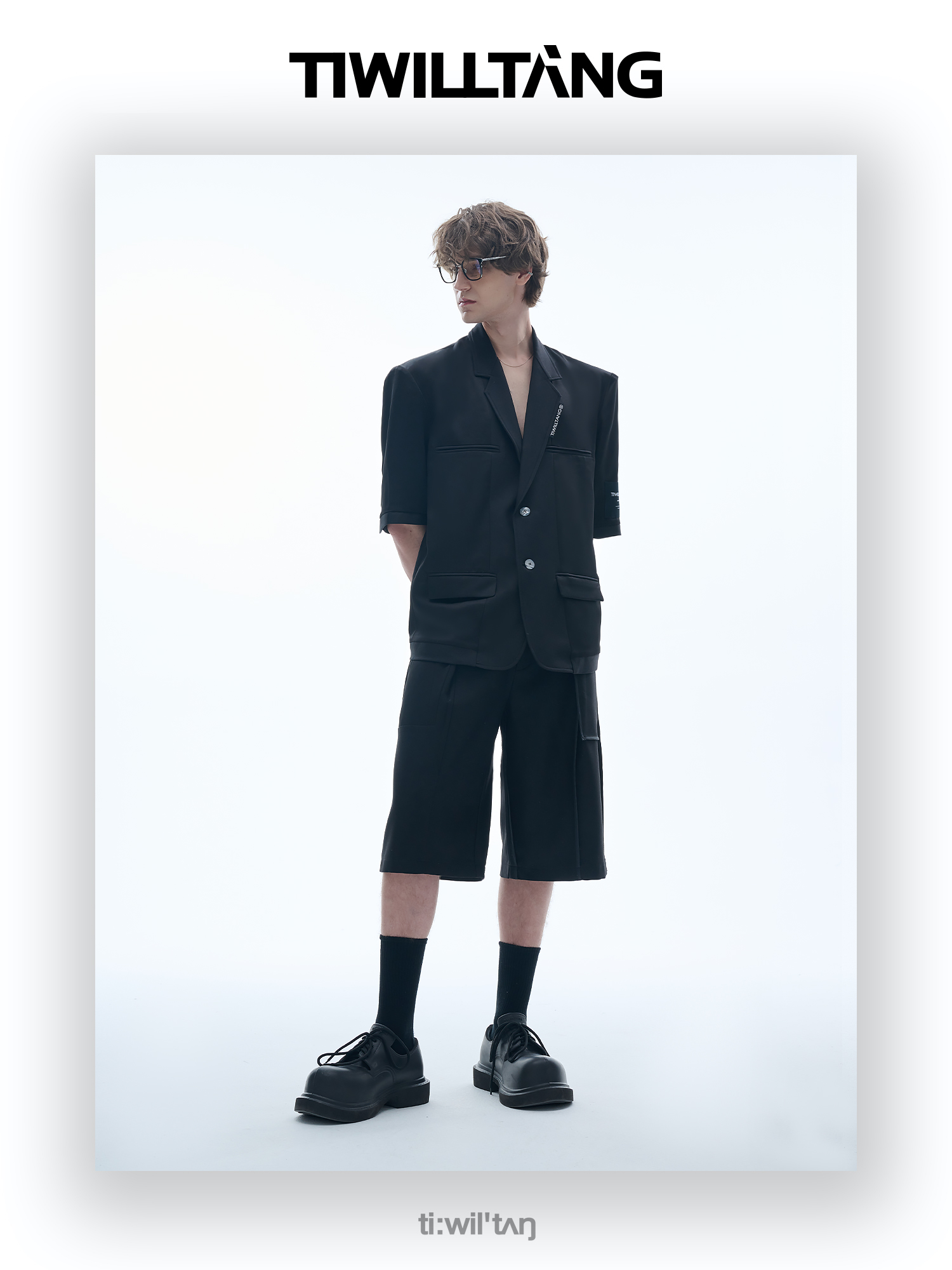 启世录TIWILLTANG“溶韵烬涉”缎面拼接西装套装夏季黑色外套男