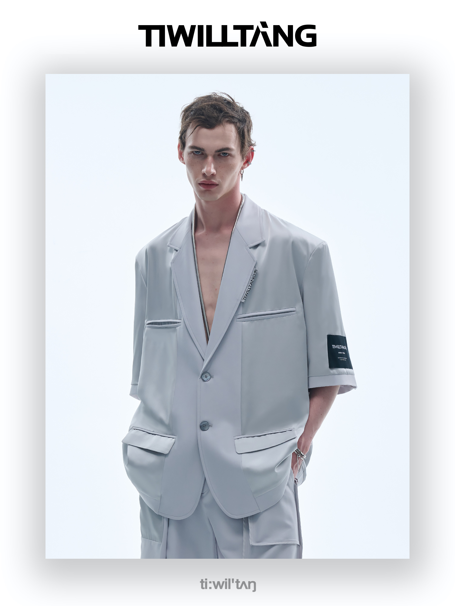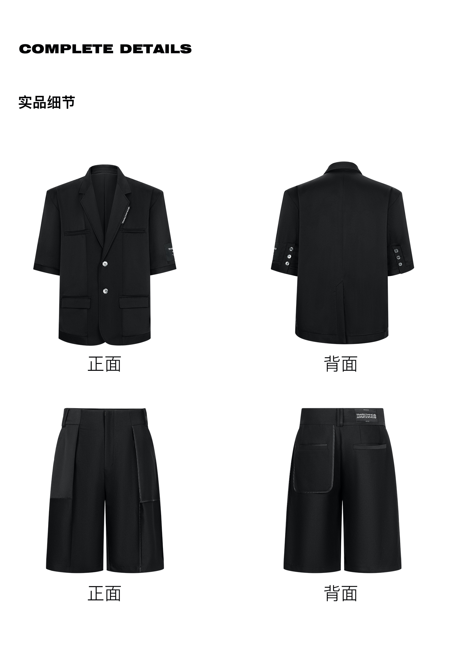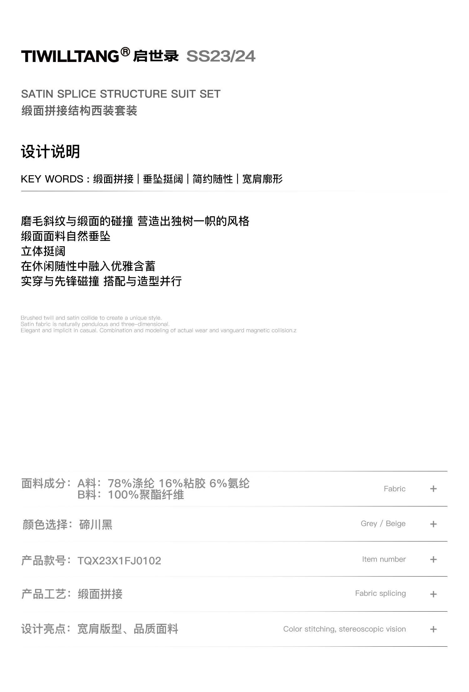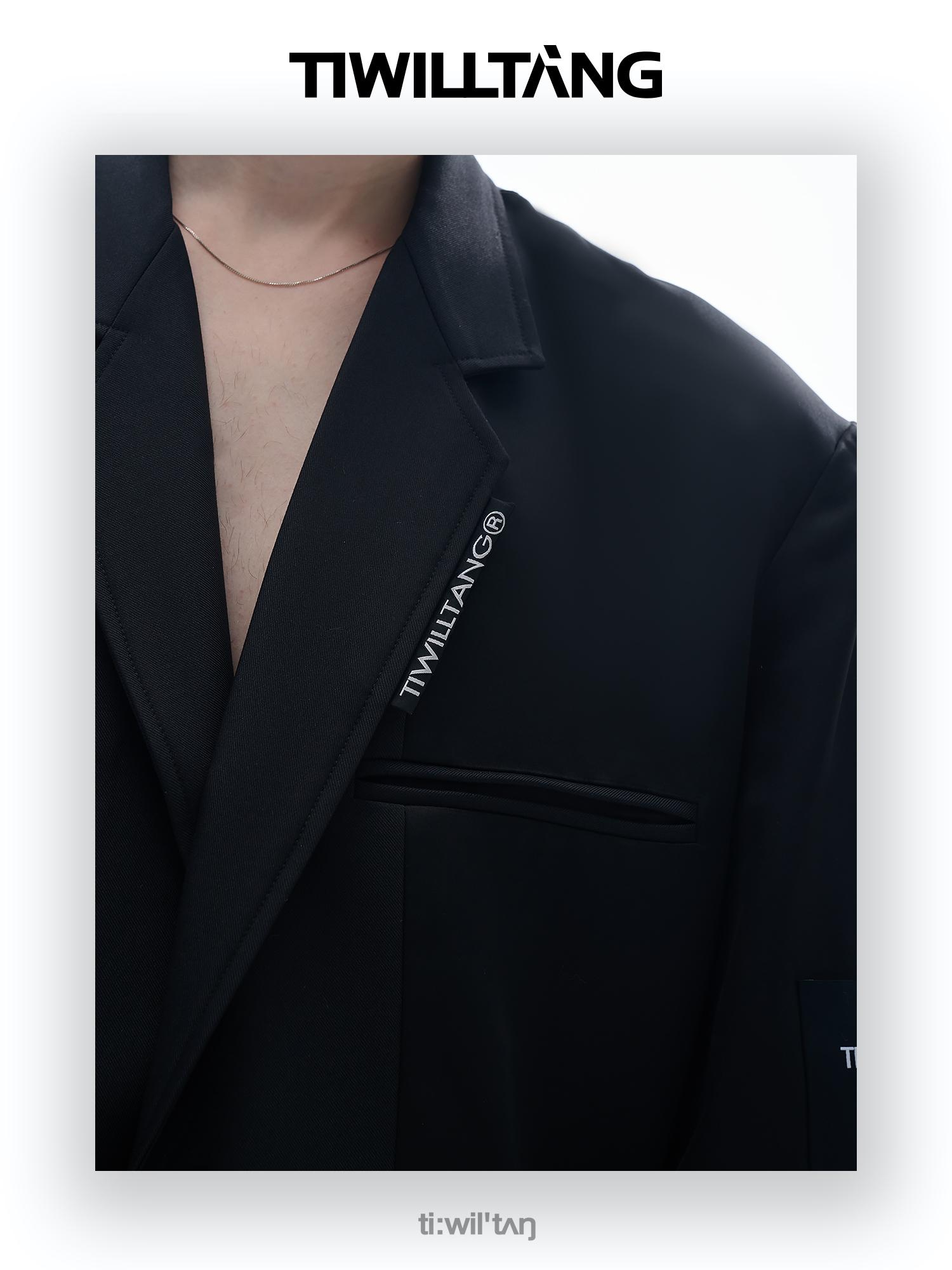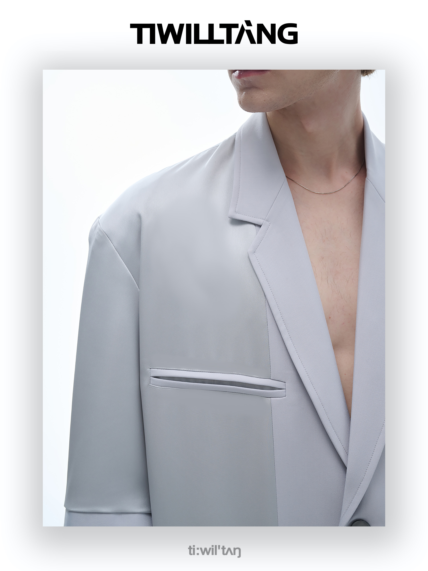 启世录TIWILLTANG“溶韵烬涉”缎面拼接西装套装夏季黑色外套男