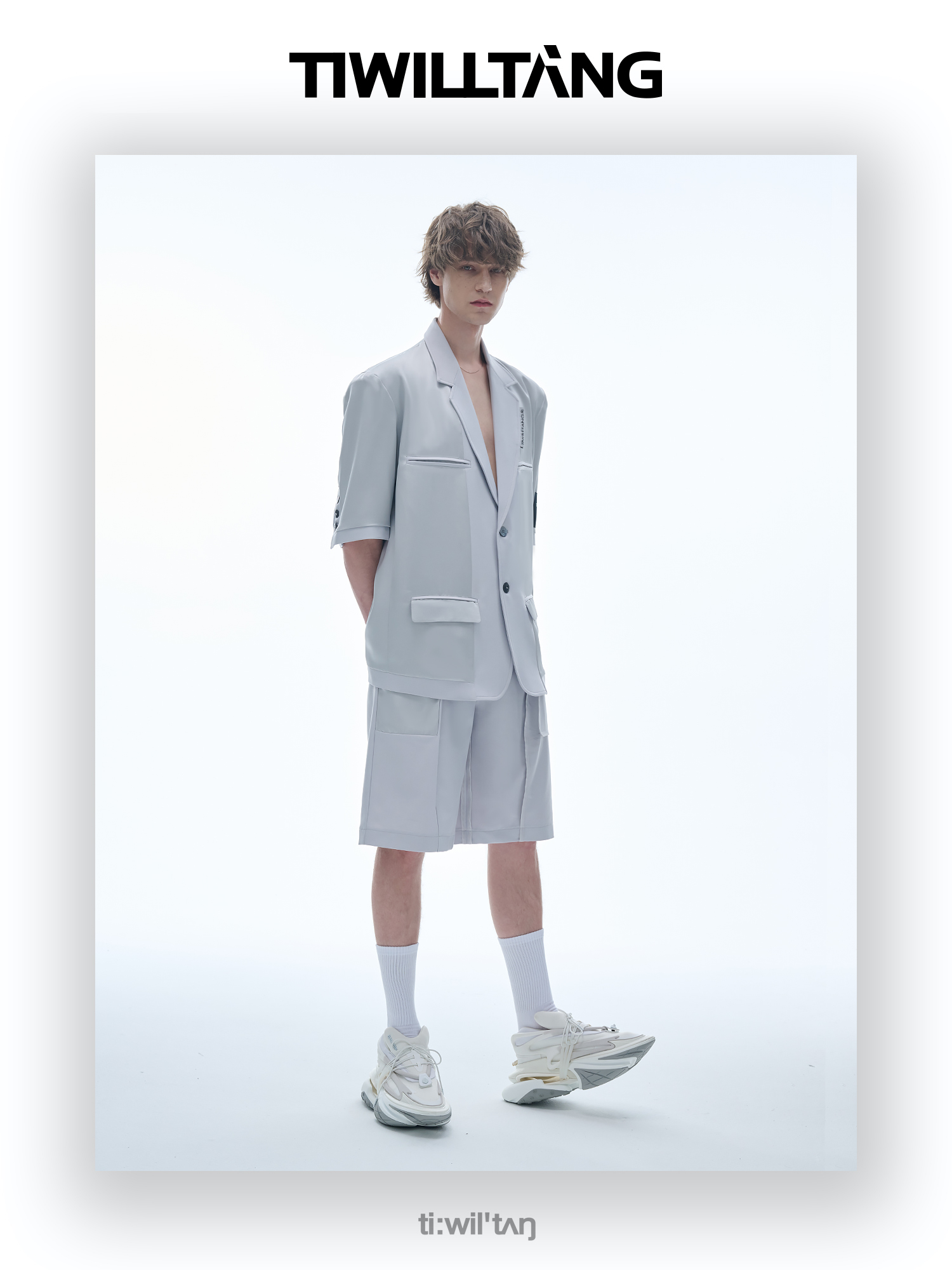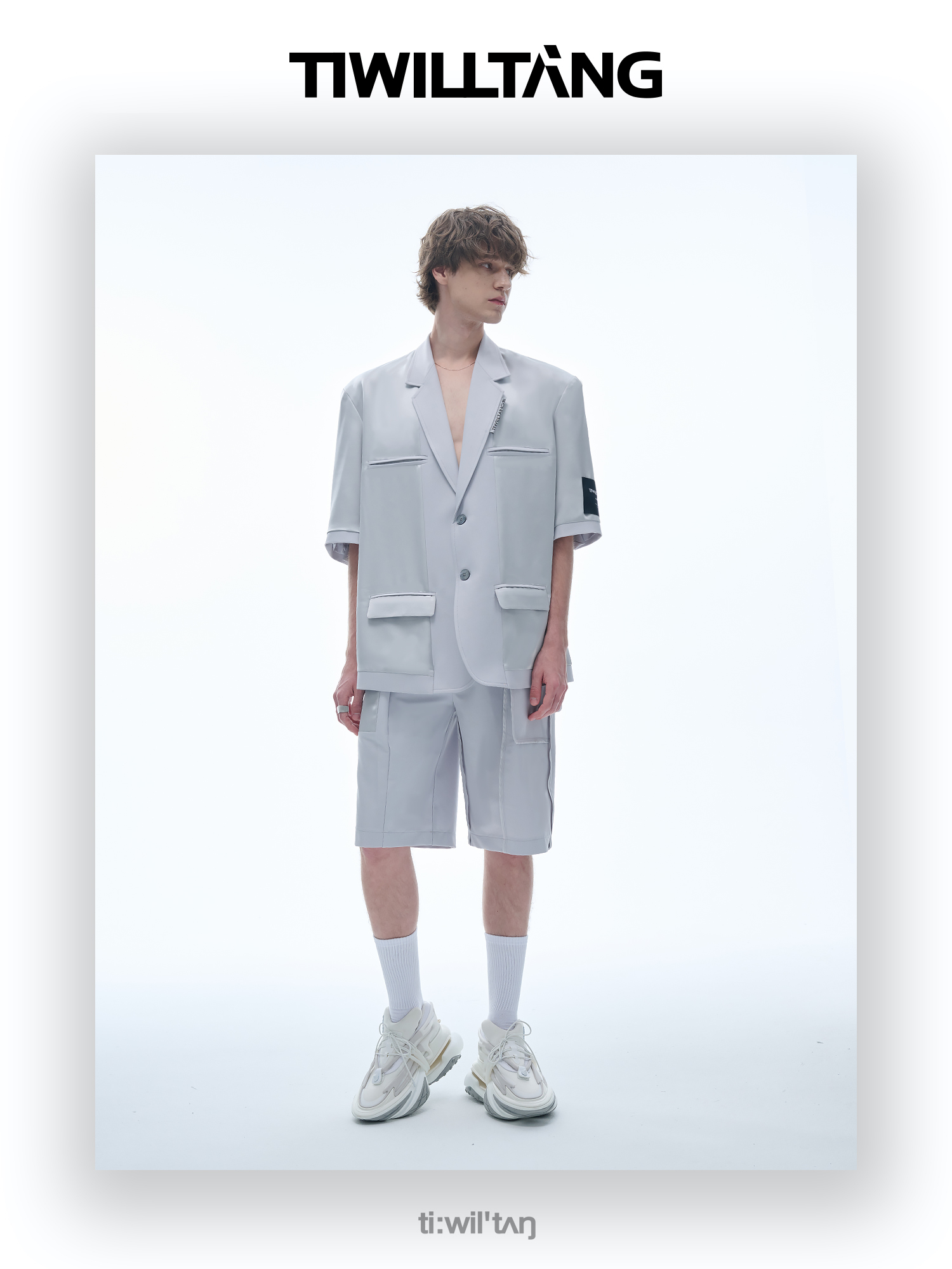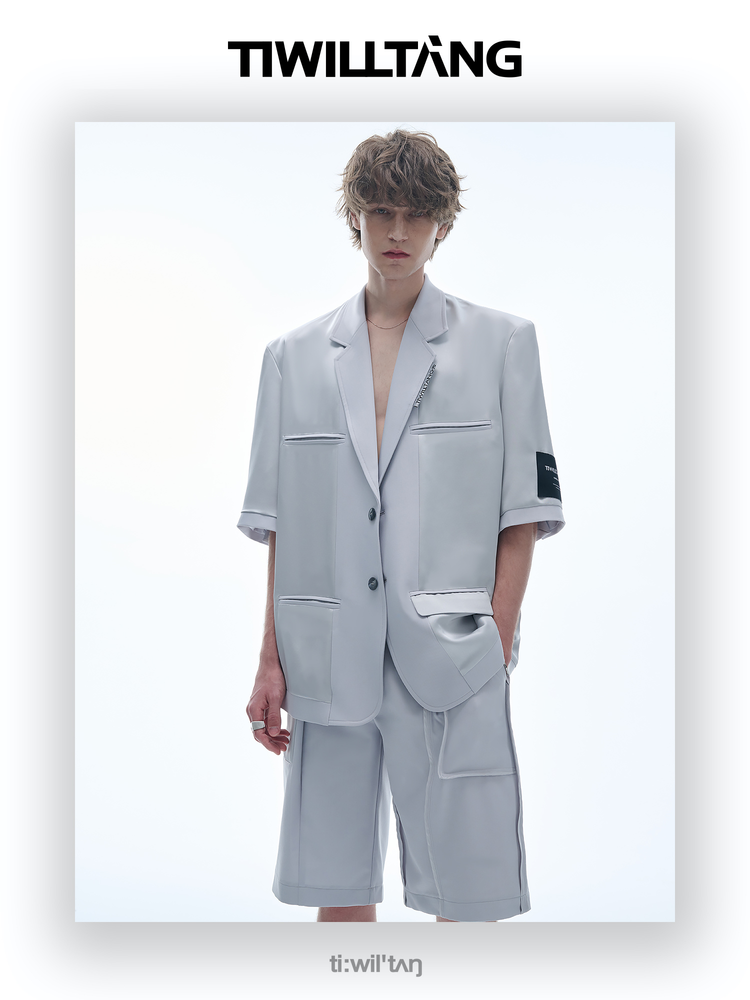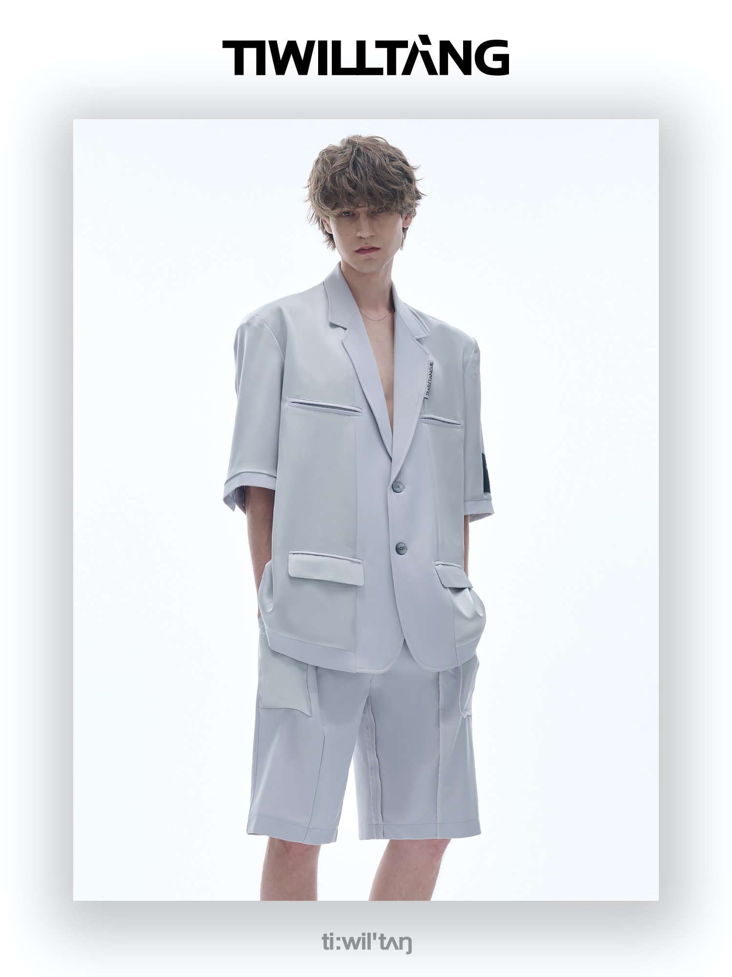 启世录TIWILLTANG“溶韵烬涉”缎面拼接西装套装夏季黑色外套男