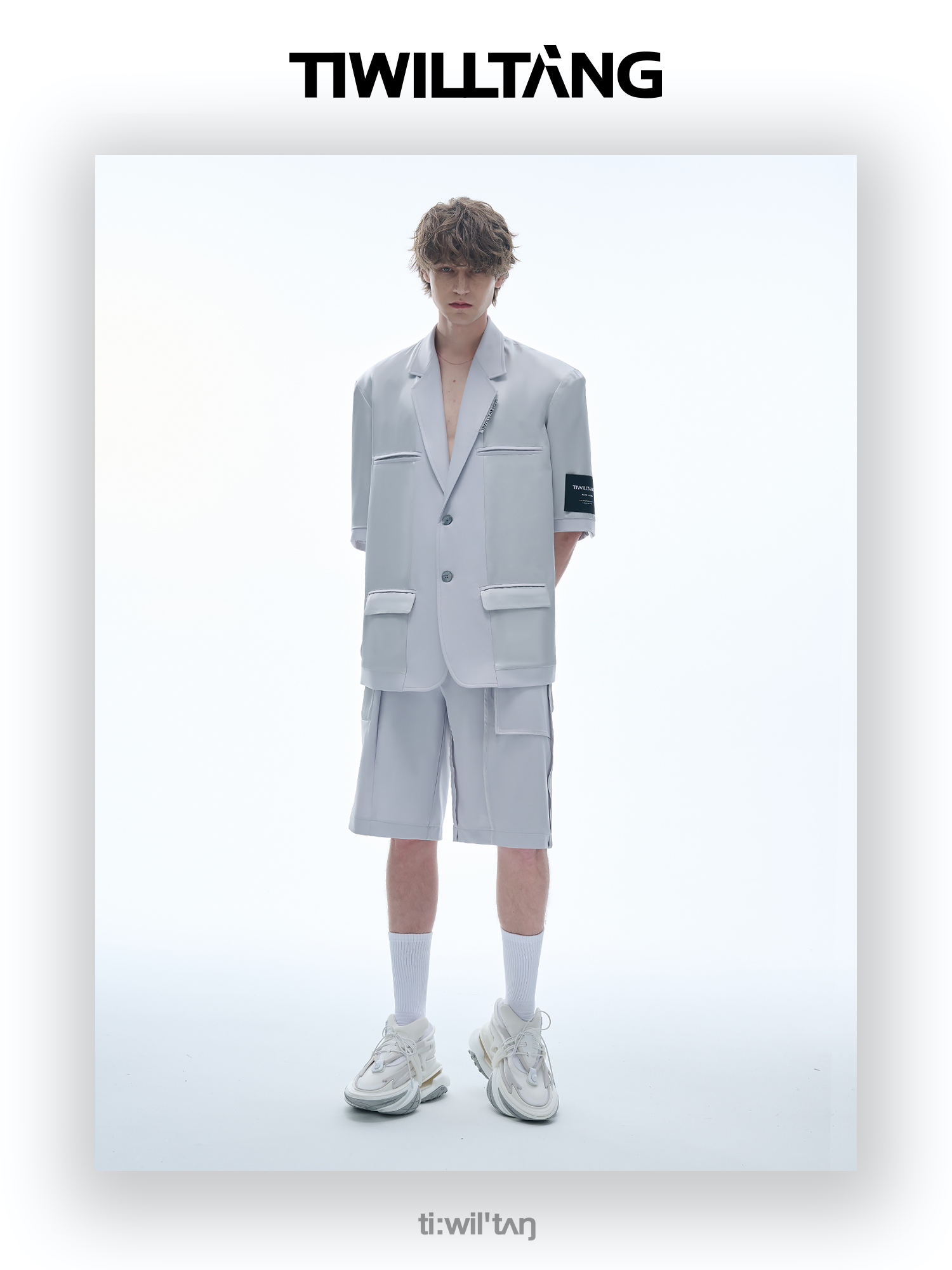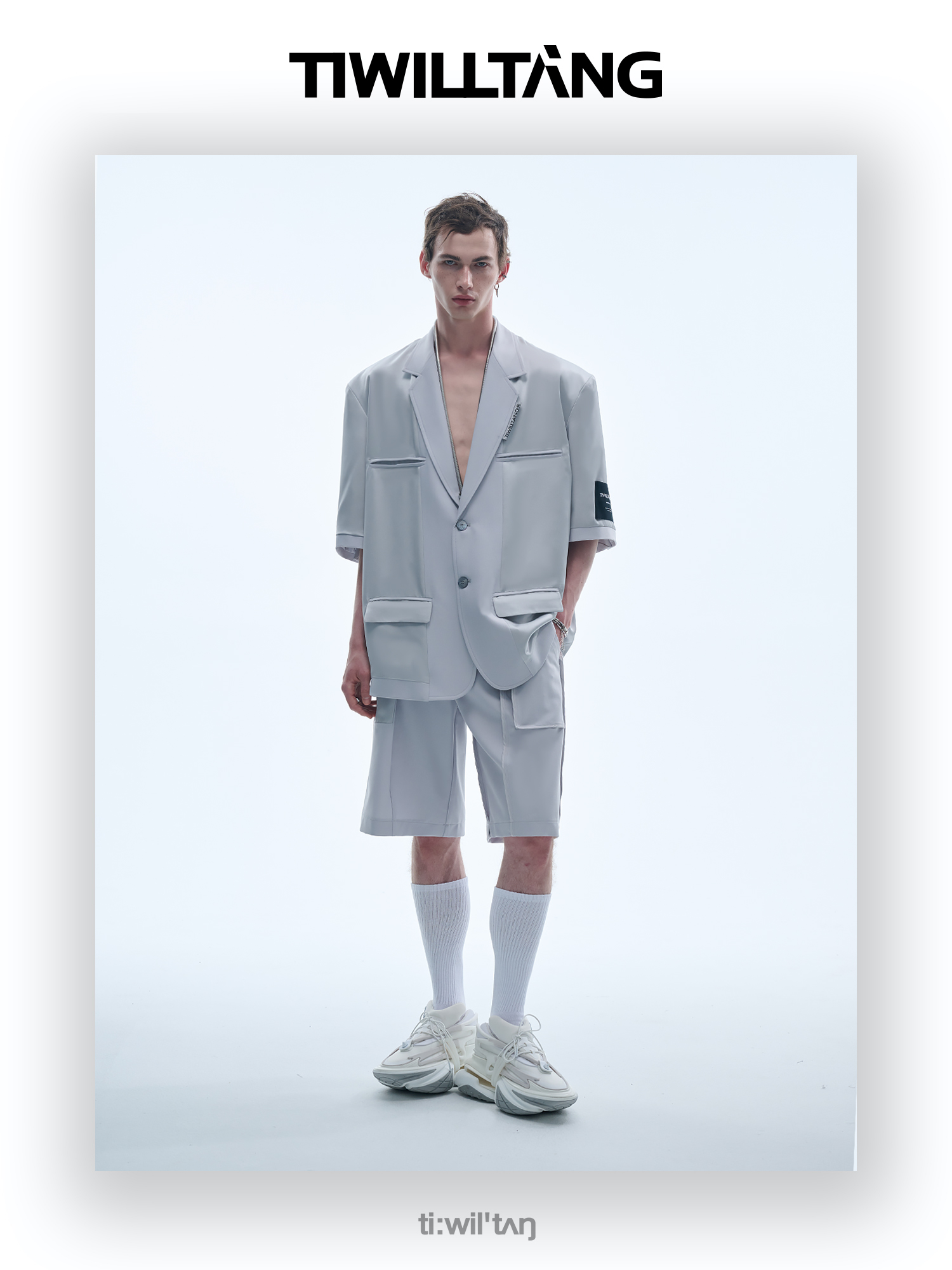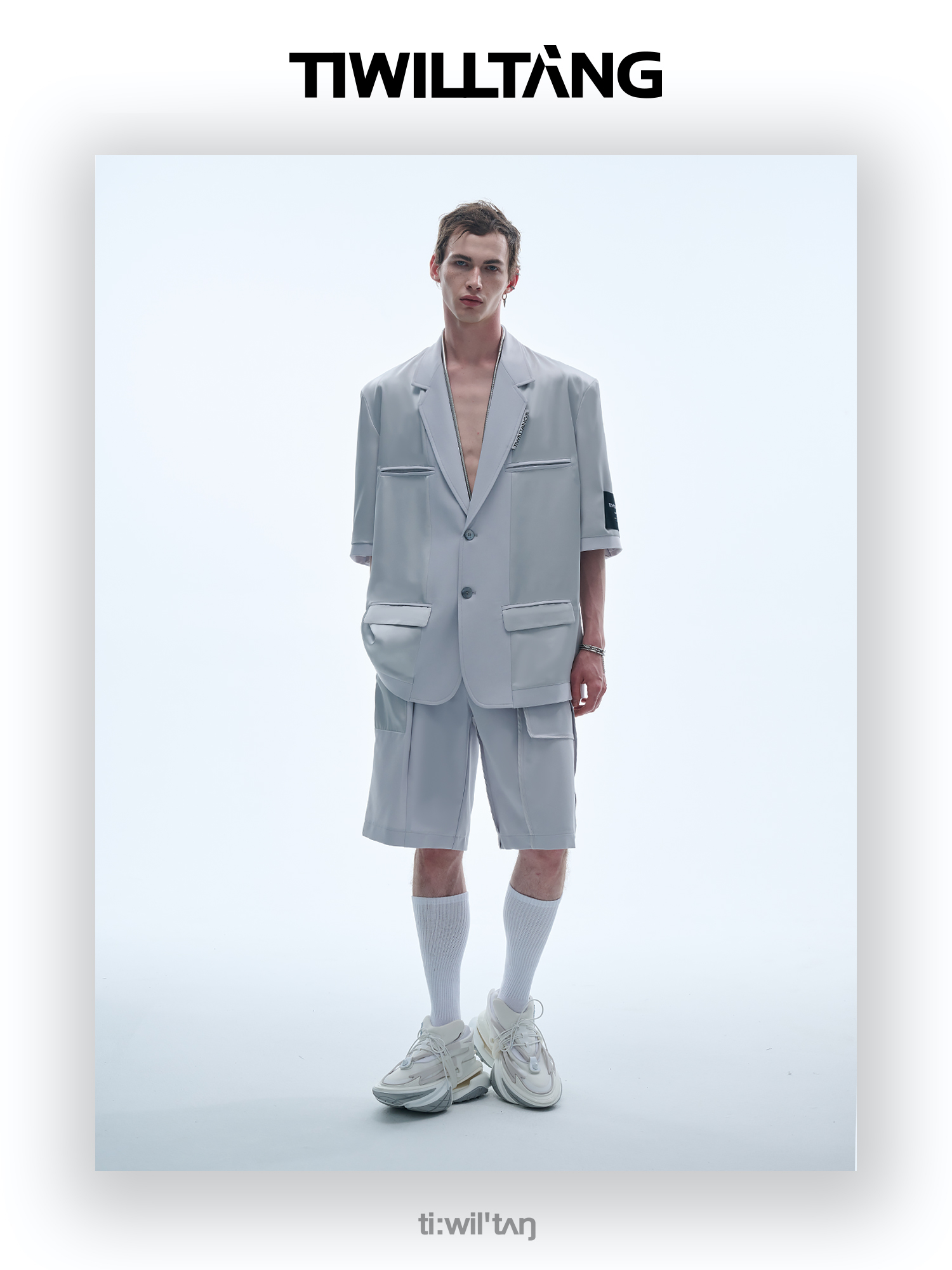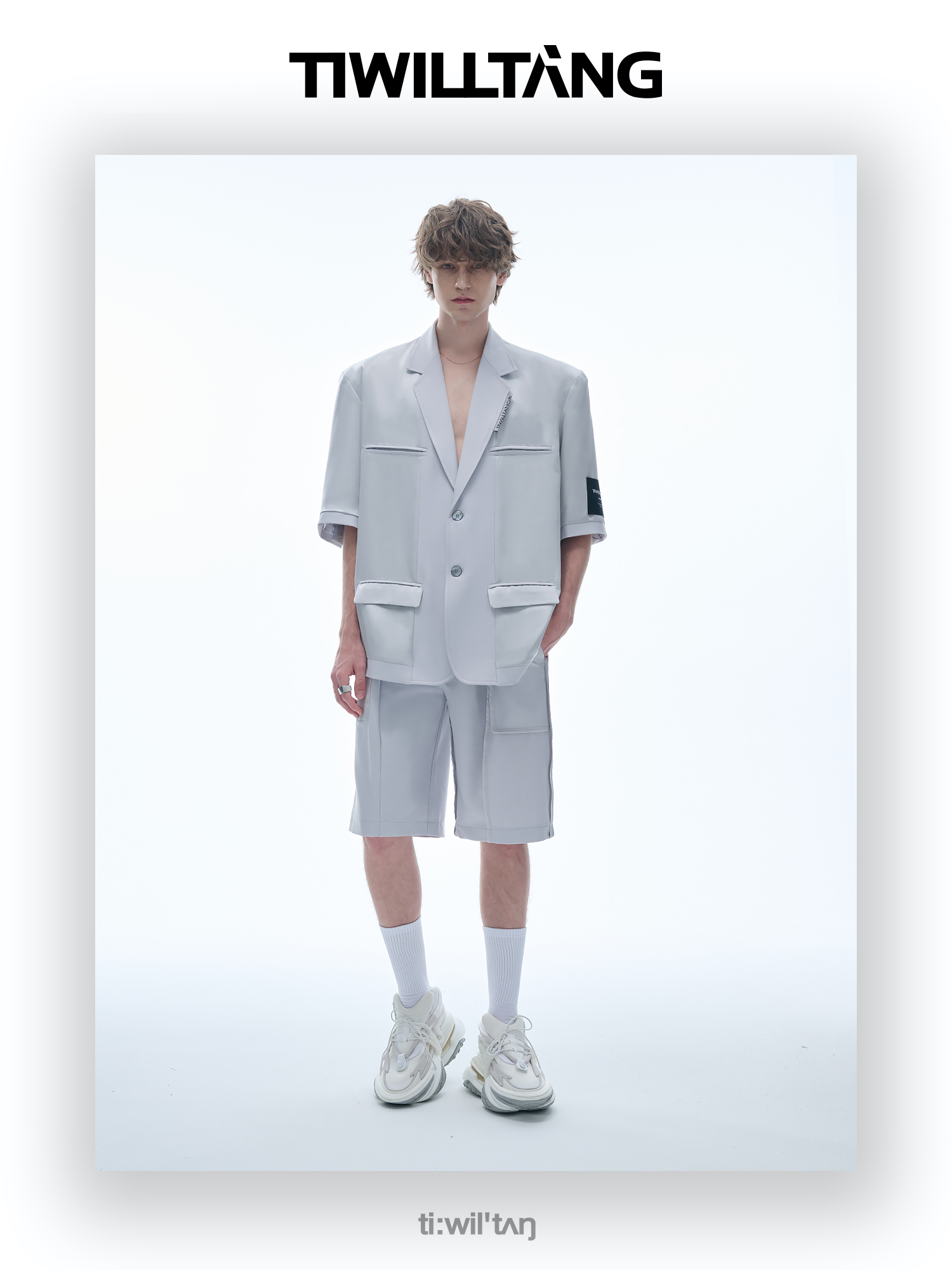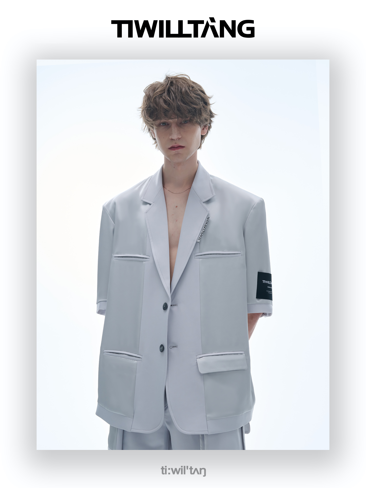 启世录TIWILLTANG“溶韵烬涉”缎面拼接西装套装夏季黑色外套男
