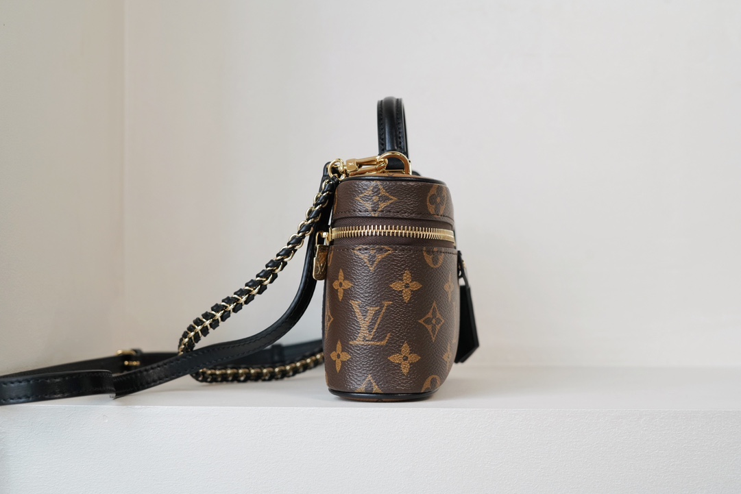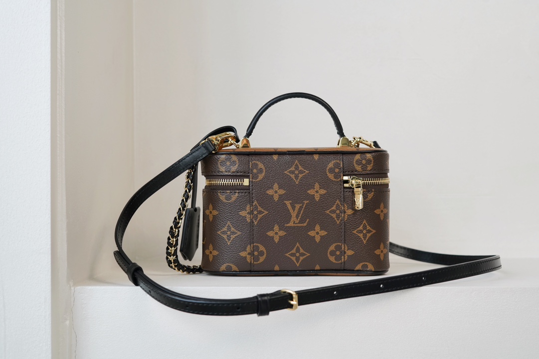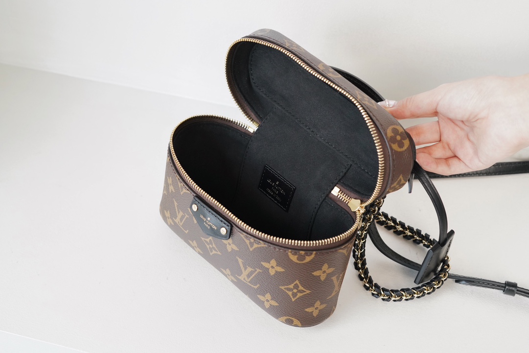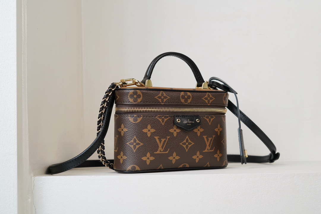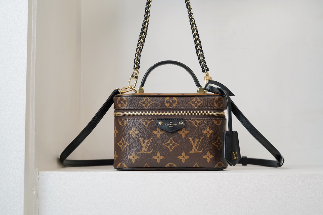 链条包系列 VANITY CHAIN POUCH 手袋 Vanity Chain Pouch 手袋向经典化妆箱汲取灵感,以Monogram 帆布诠释旅行精神。顶部手柄和可拆卸编织链条融入皮革元素,与包身的简明线条相互映衬。𝐋𝐯铭纹挂锁和皮革钥匙包延续标志性细节;黑色植鞣革配花比传统的时髦而且没那么容易脏。