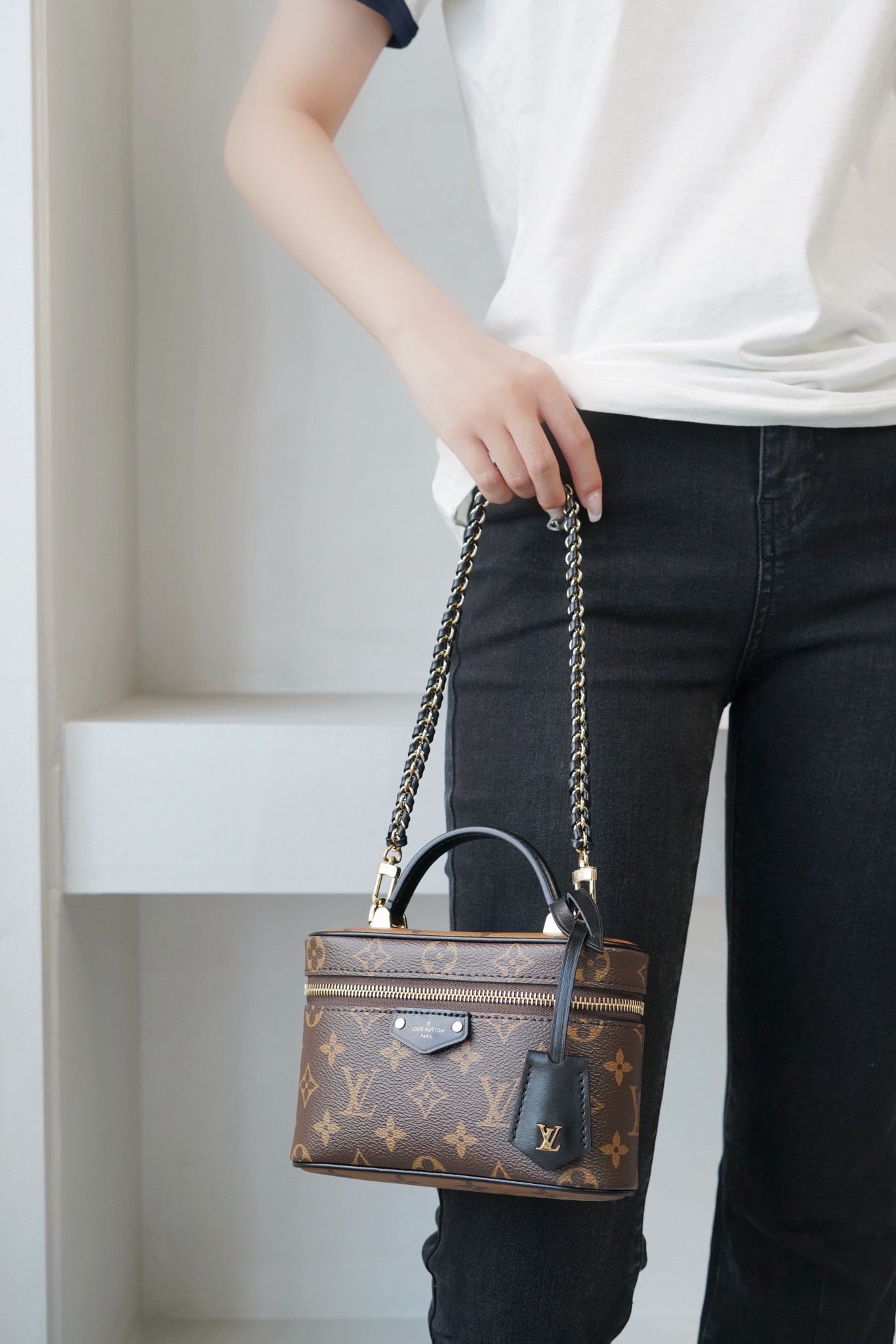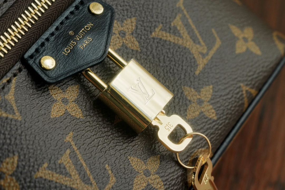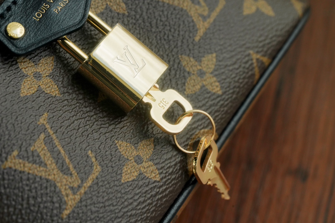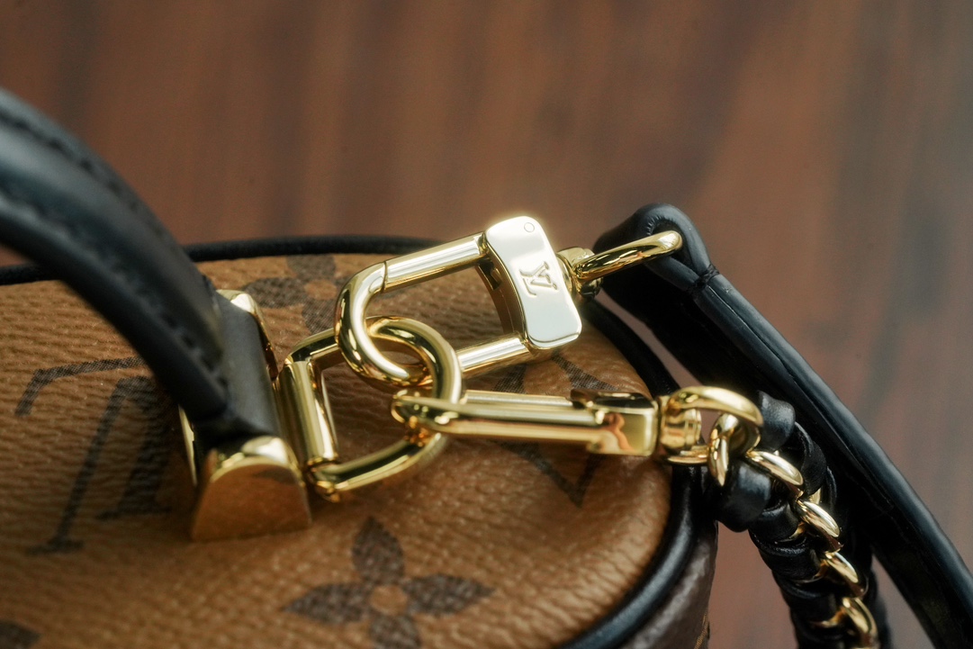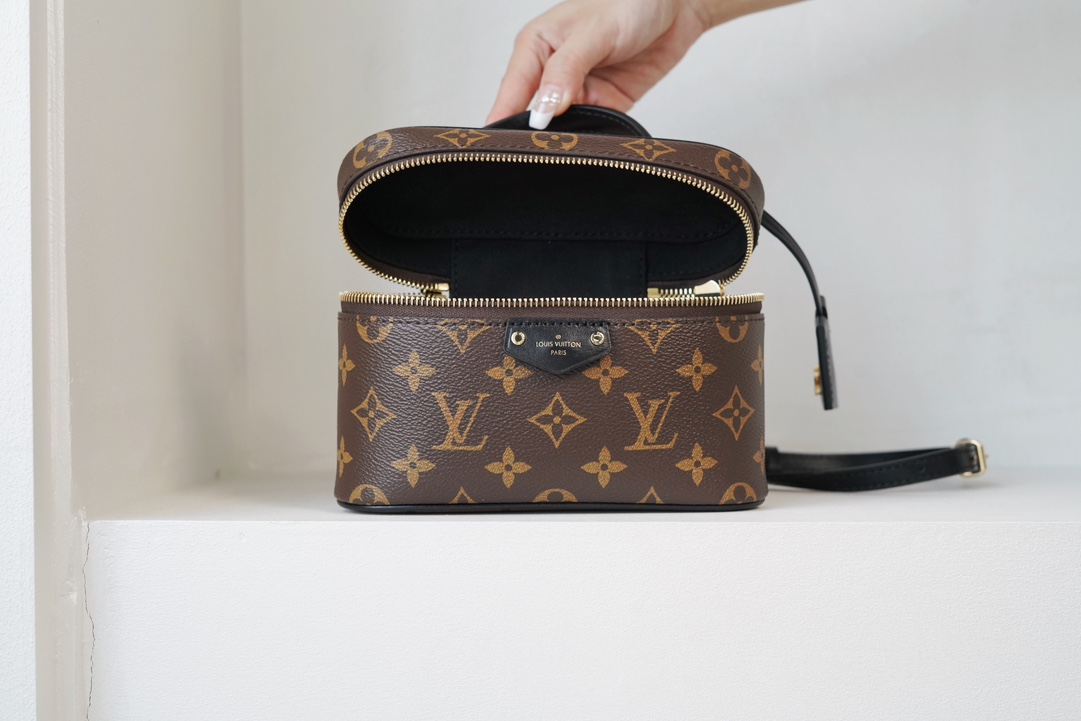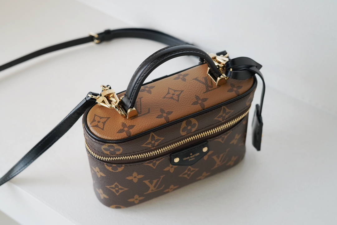 链条包系列 VANITY CHAIN POUCH 手袋 Vanity Chain Pouch 手袋向经典化妆箱汲取灵感,以Monogram 帆布诠释旅行精神。顶部手柄和可拆卸编织链条融入皮革元素,与包身的简明线条相互映衬。𝐋𝐯铭纹挂锁和皮革钥匙包延续标志性细节;黑色植鞣革配花比传统的时髦而且没那么容易脏。