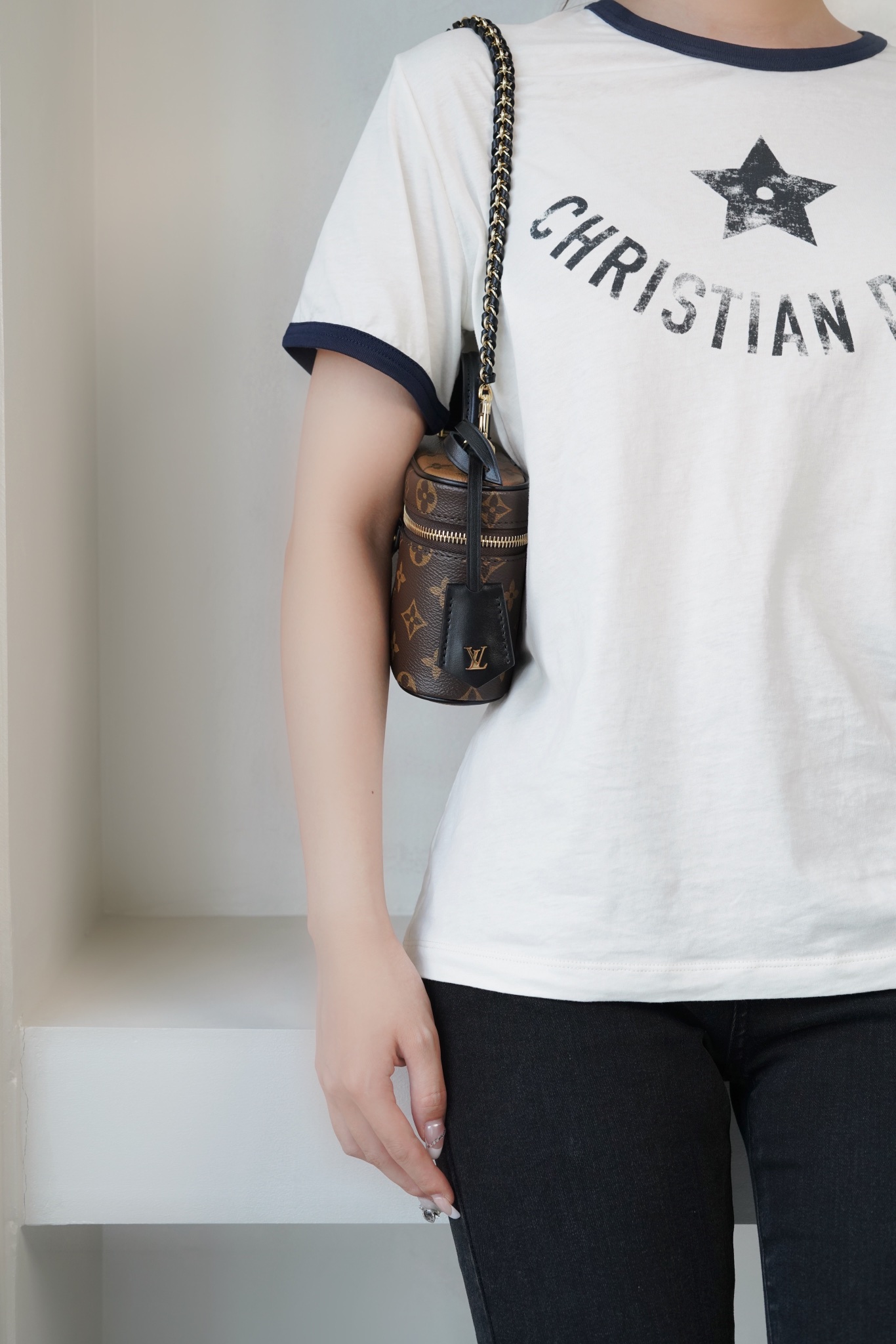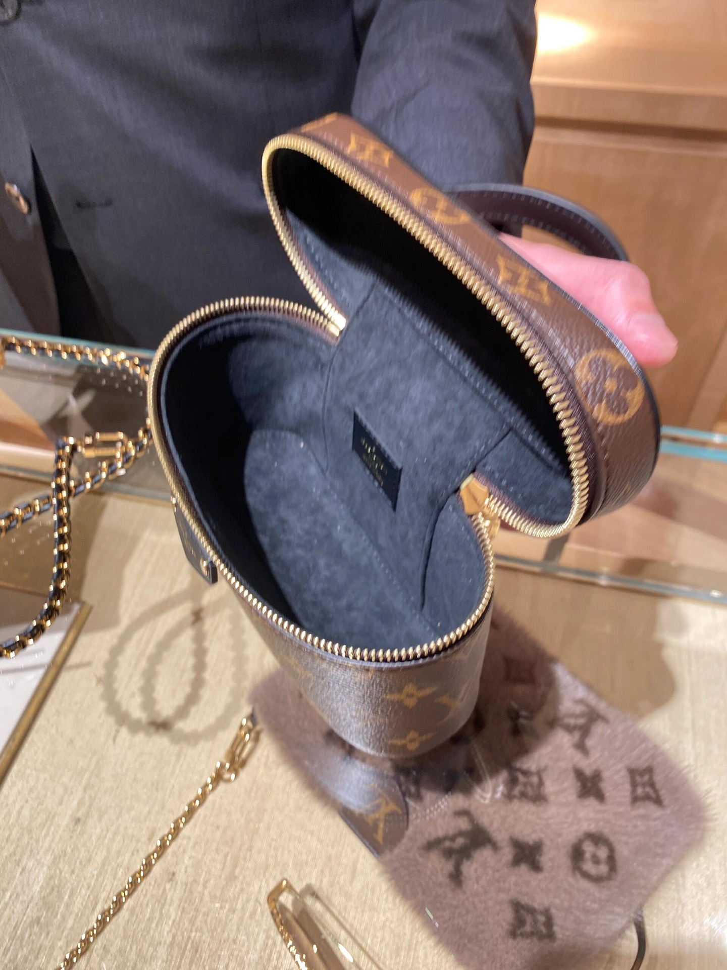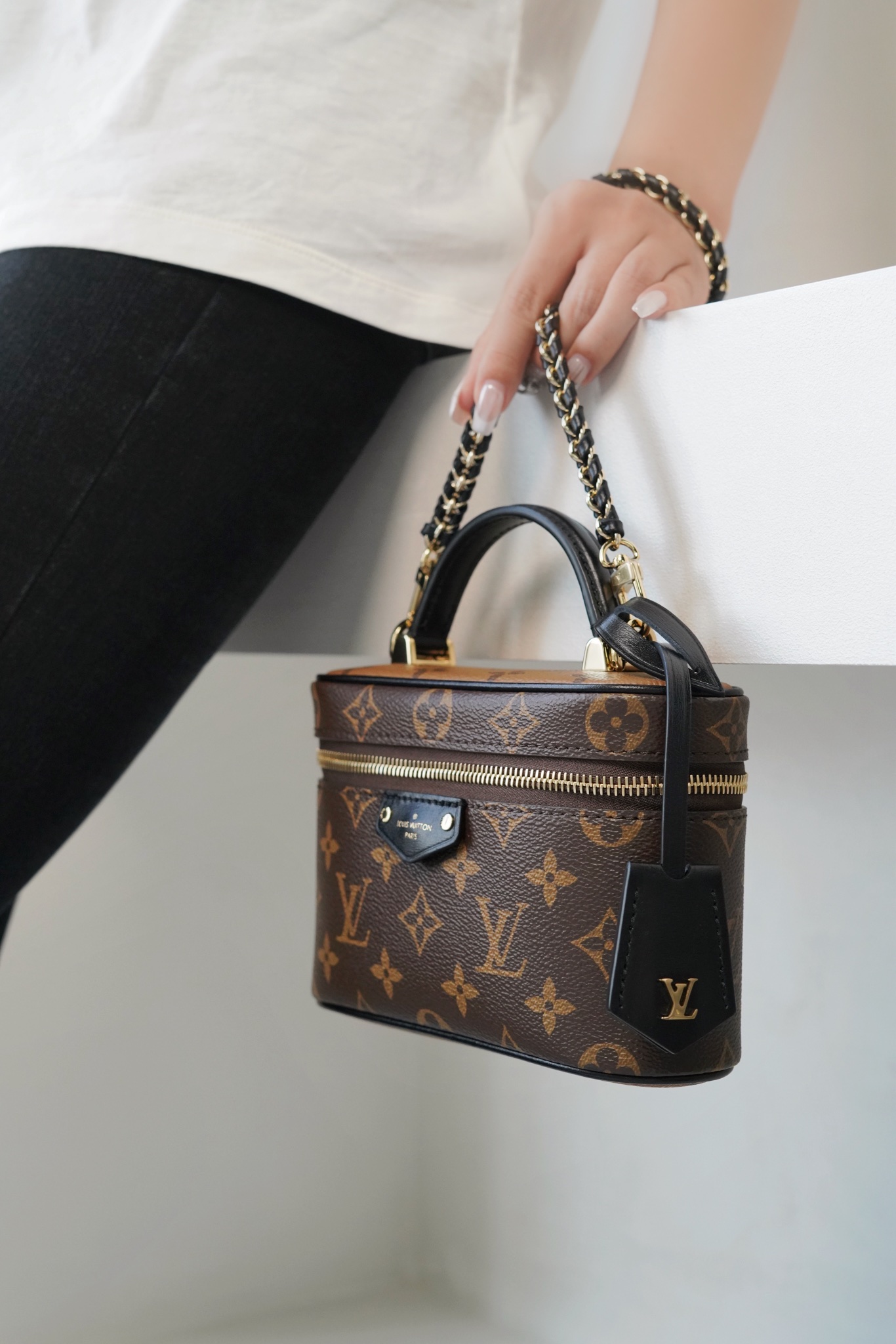 链条包系列 VANITY CHAIN POUCH 手袋 Vanity Chain Pouch 手袋向经典化妆箱汲取灵感,以Monogram 帆布诠释旅行精神。顶部手柄和可拆卸编织链条融入皮革元素,与包身的简明线条相互映衬。𝐋𝐯铭纹挂锁和皮革钥匙包延续标志性细节;黑色植鞣革配花比传统的时髦而且没那么容易脏。