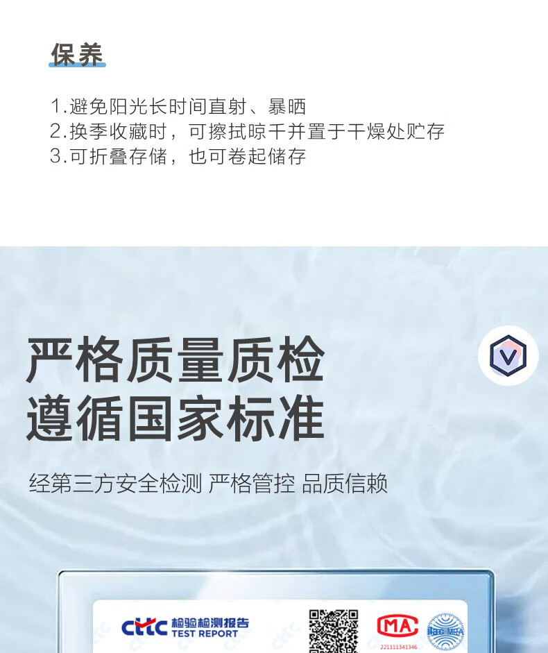 1.遇短期不使用本品(一般7-10天)或换季收藏时,请至阳光下晒1-2小时后,放于包装内,储藏即可