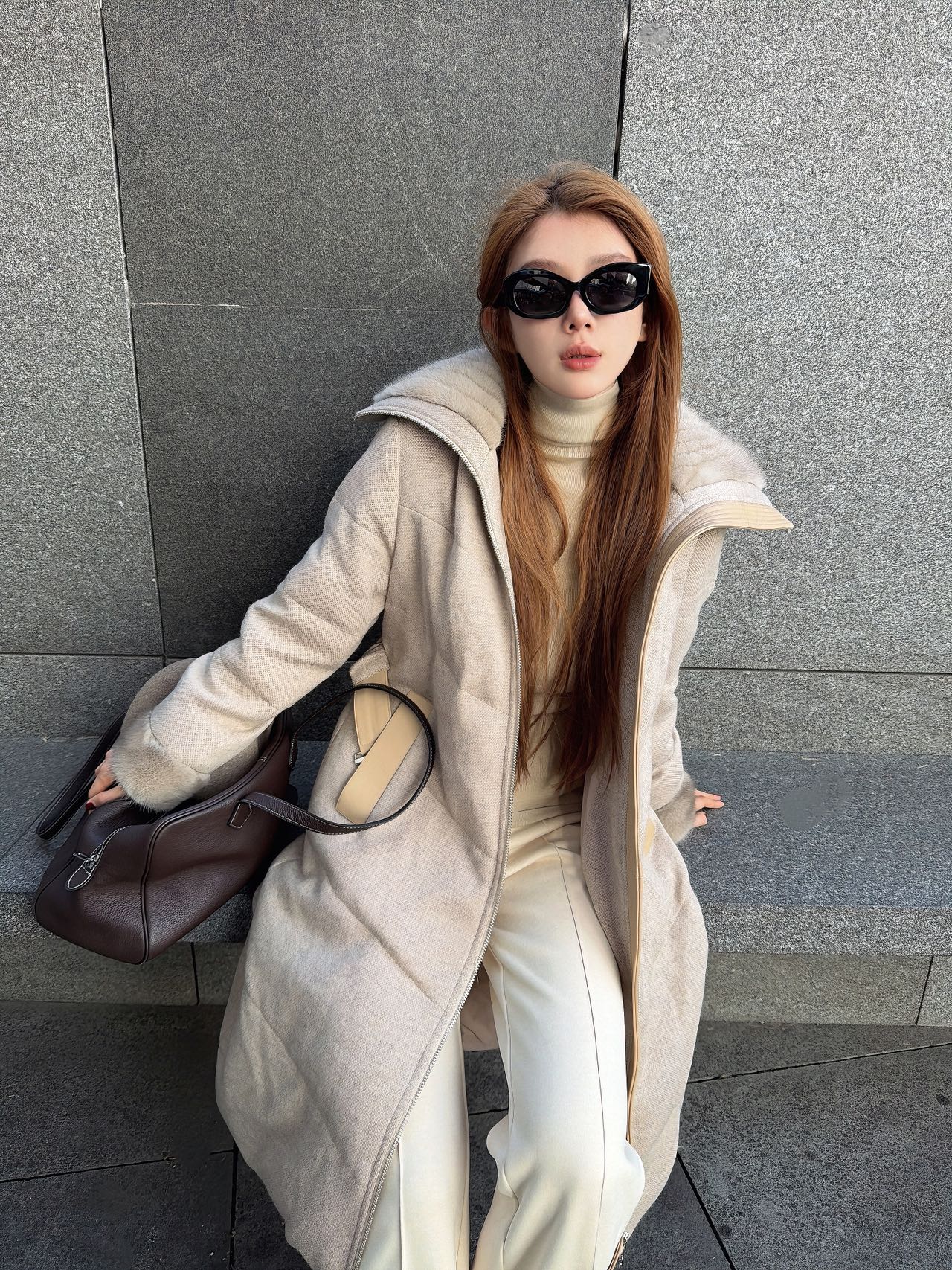 • 收纳方式:长期收纳时需使用专用防尘袋悬挂,避免重压导致毛领变形或羊绒起皱