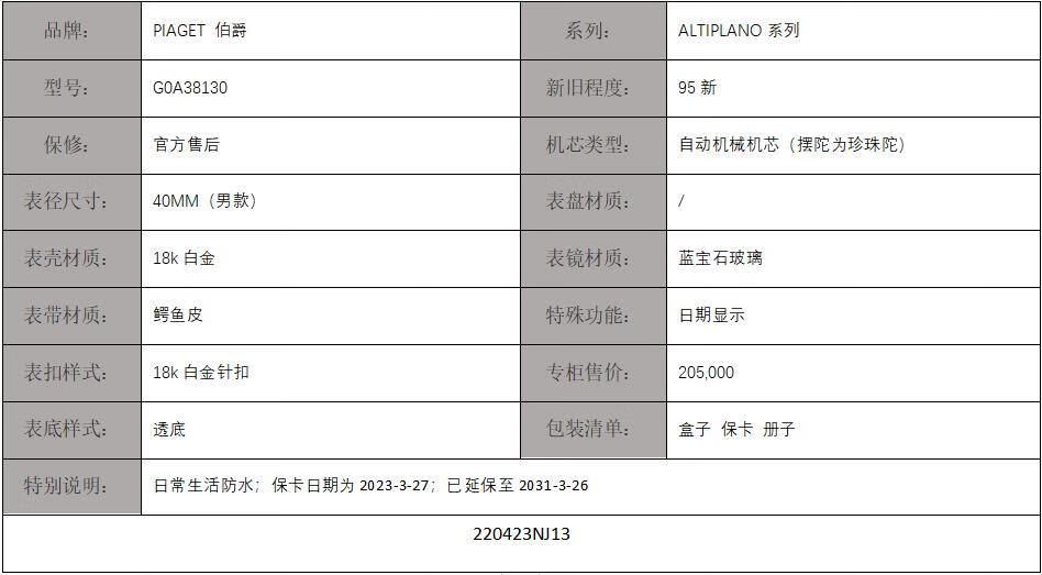 【95新正品】PIAGET 伯爵ALTIPLANO系列18k白金40MM日期显示自动机械机芯(摆陀为珍珠陀)男款G0A38130 220423NJ13
