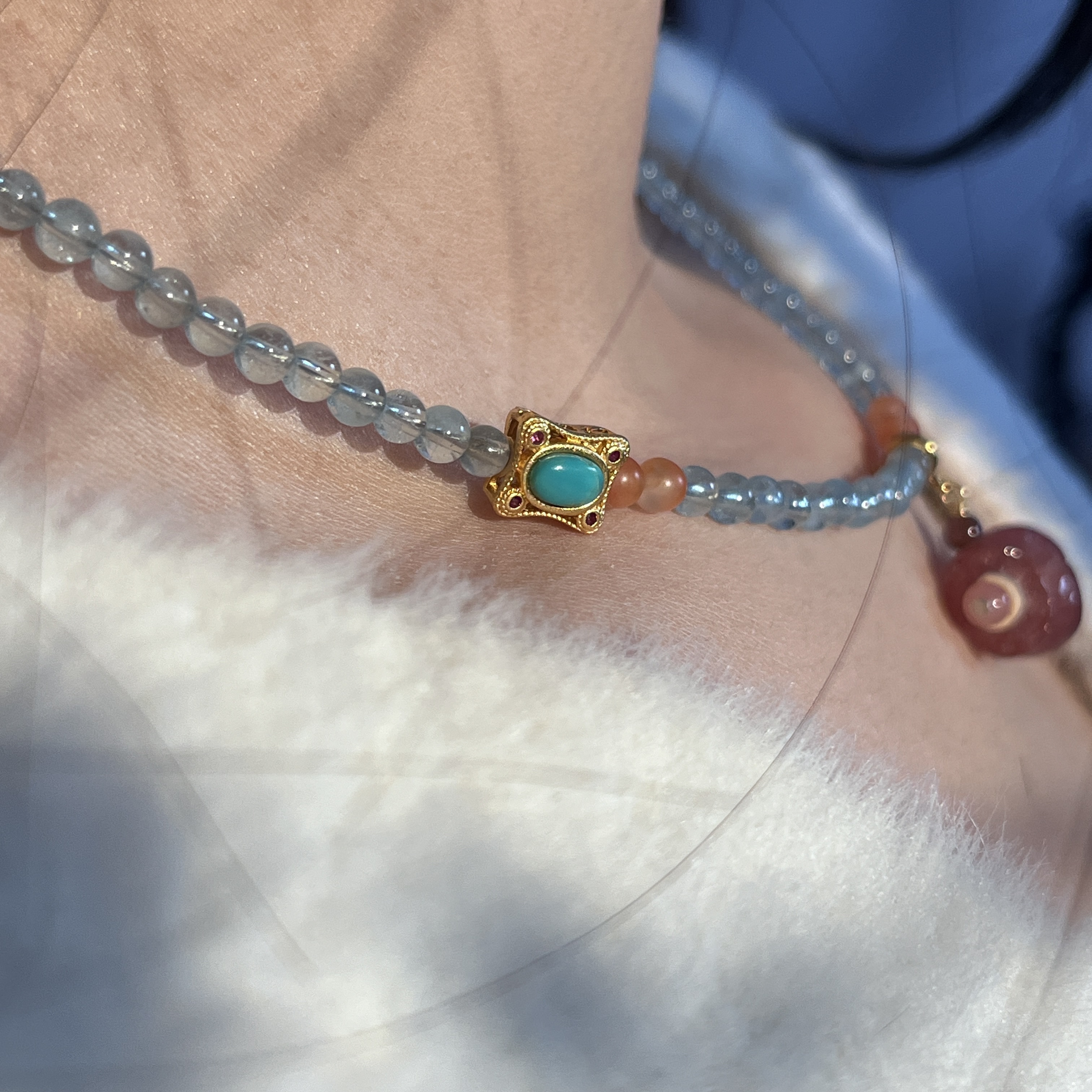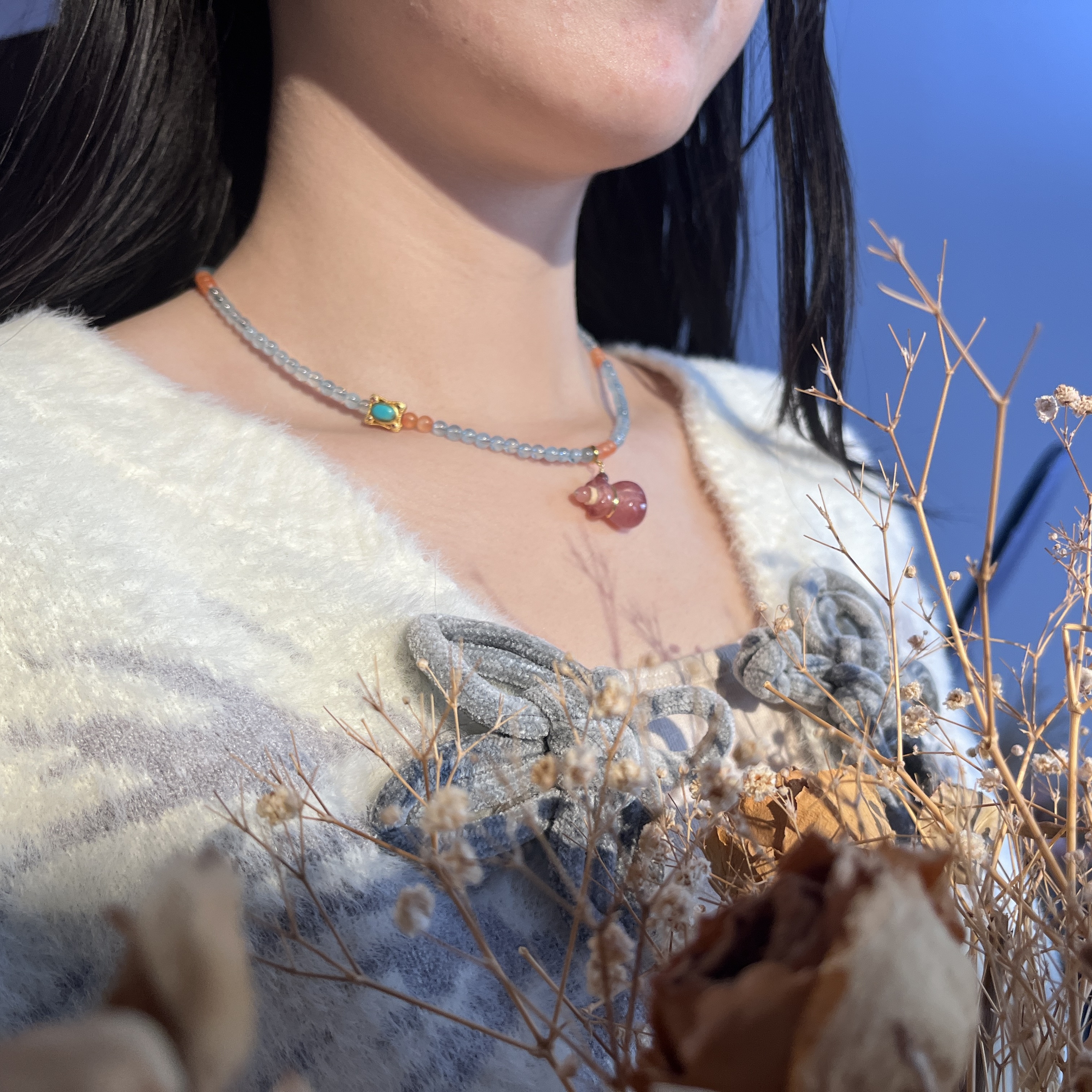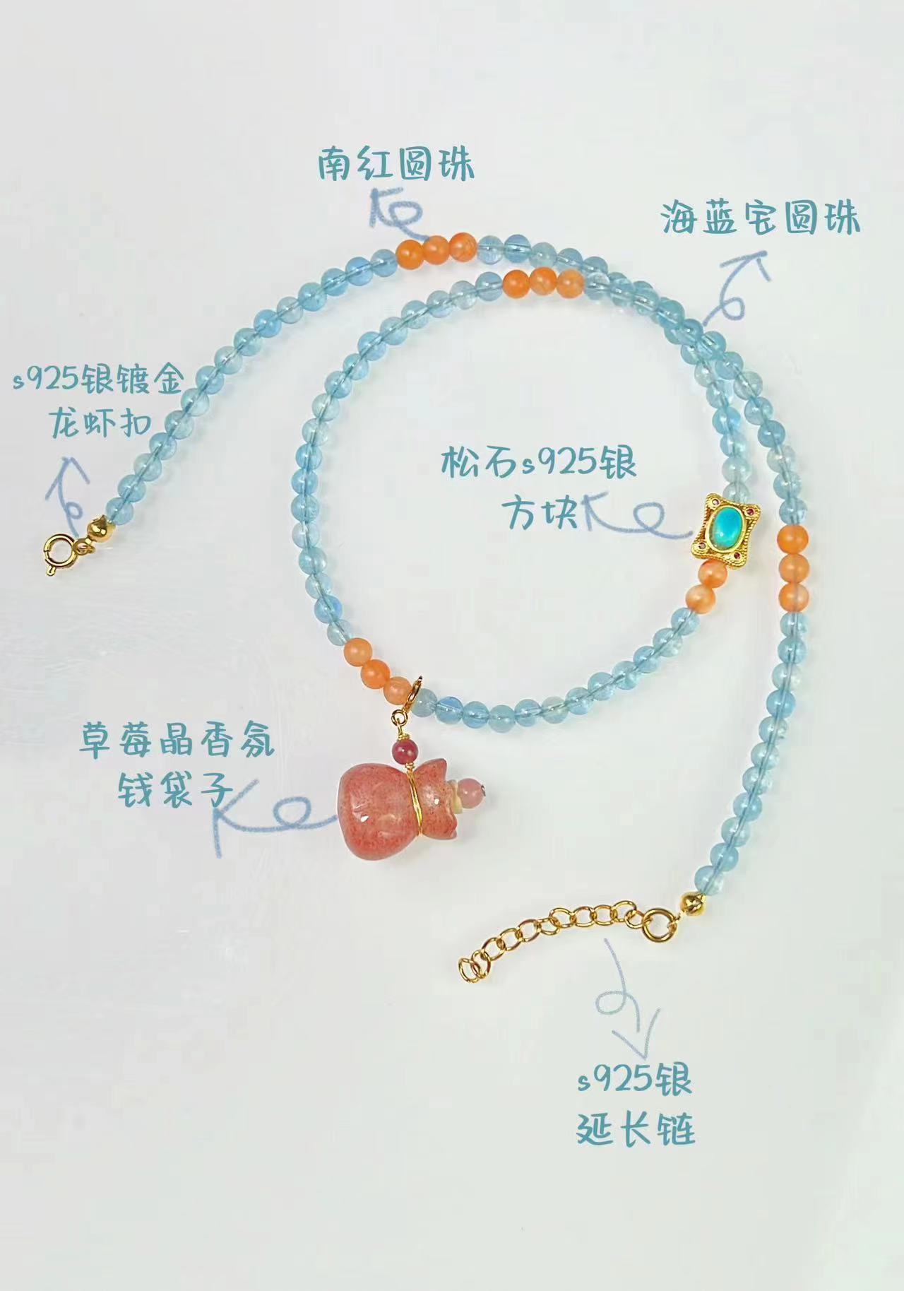[蓝海幽梦精油香氛项链]通透明媚的天然海蓝宝水晶项链搭配南红和草莓晶香氛瓶【长度(cm):40+3(延长链)】