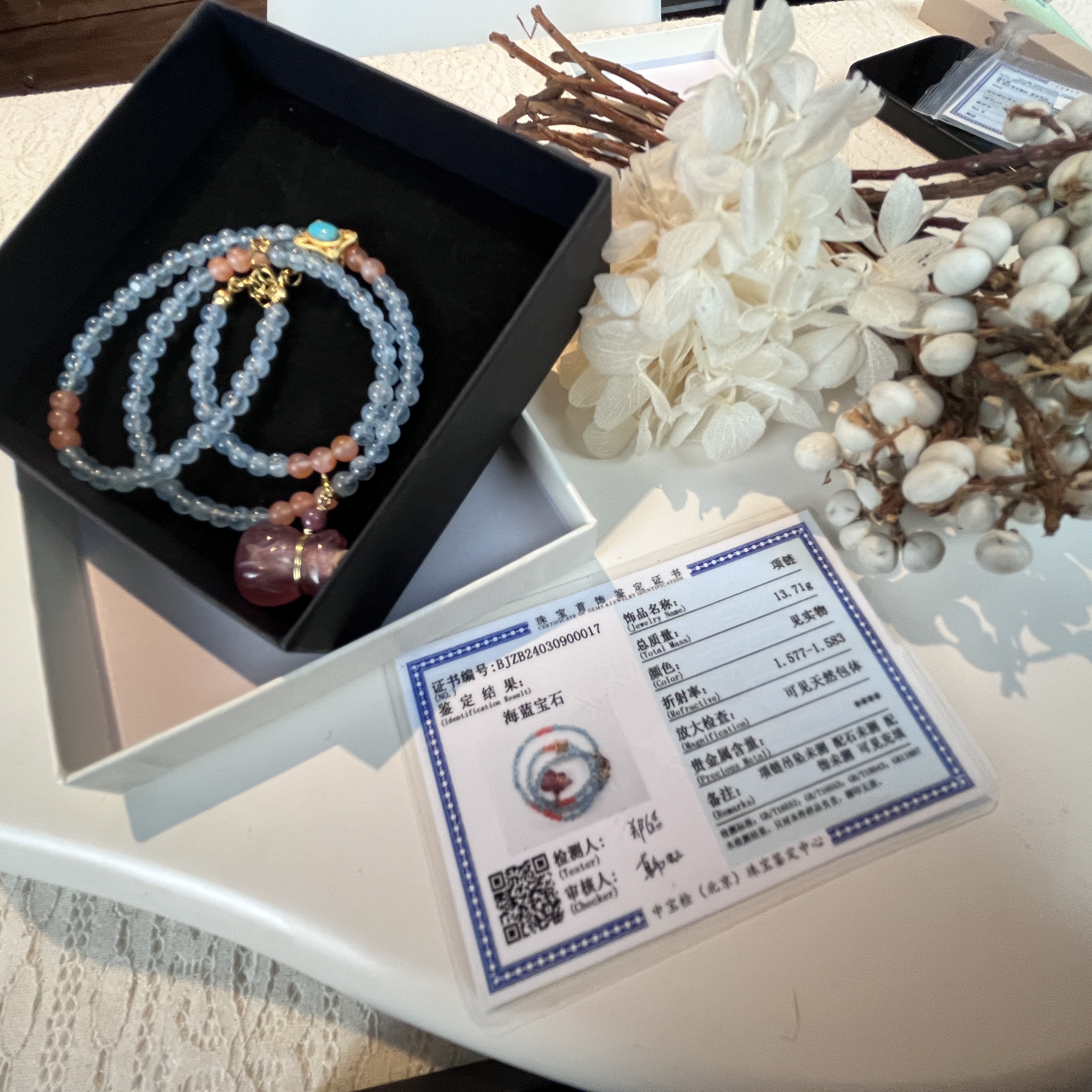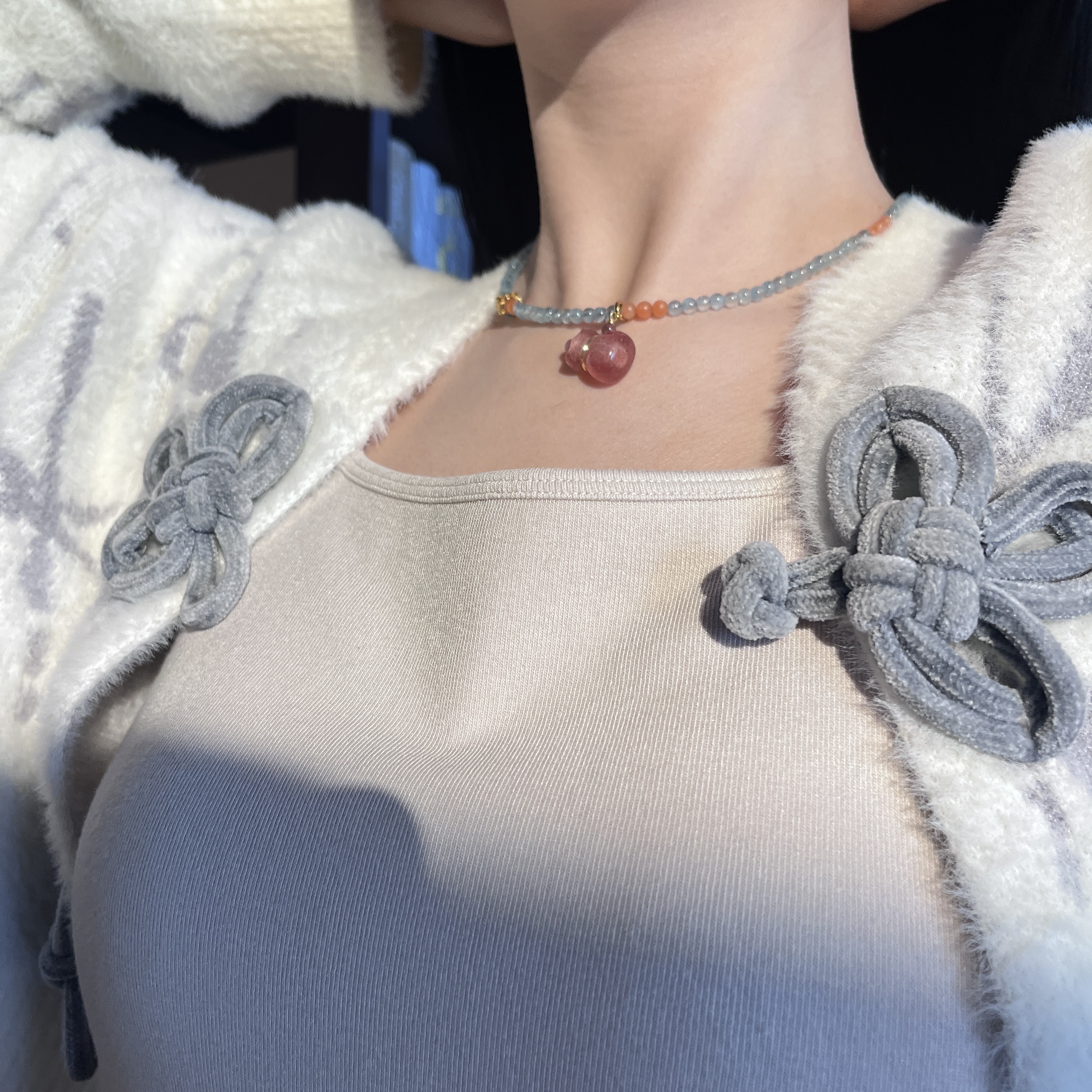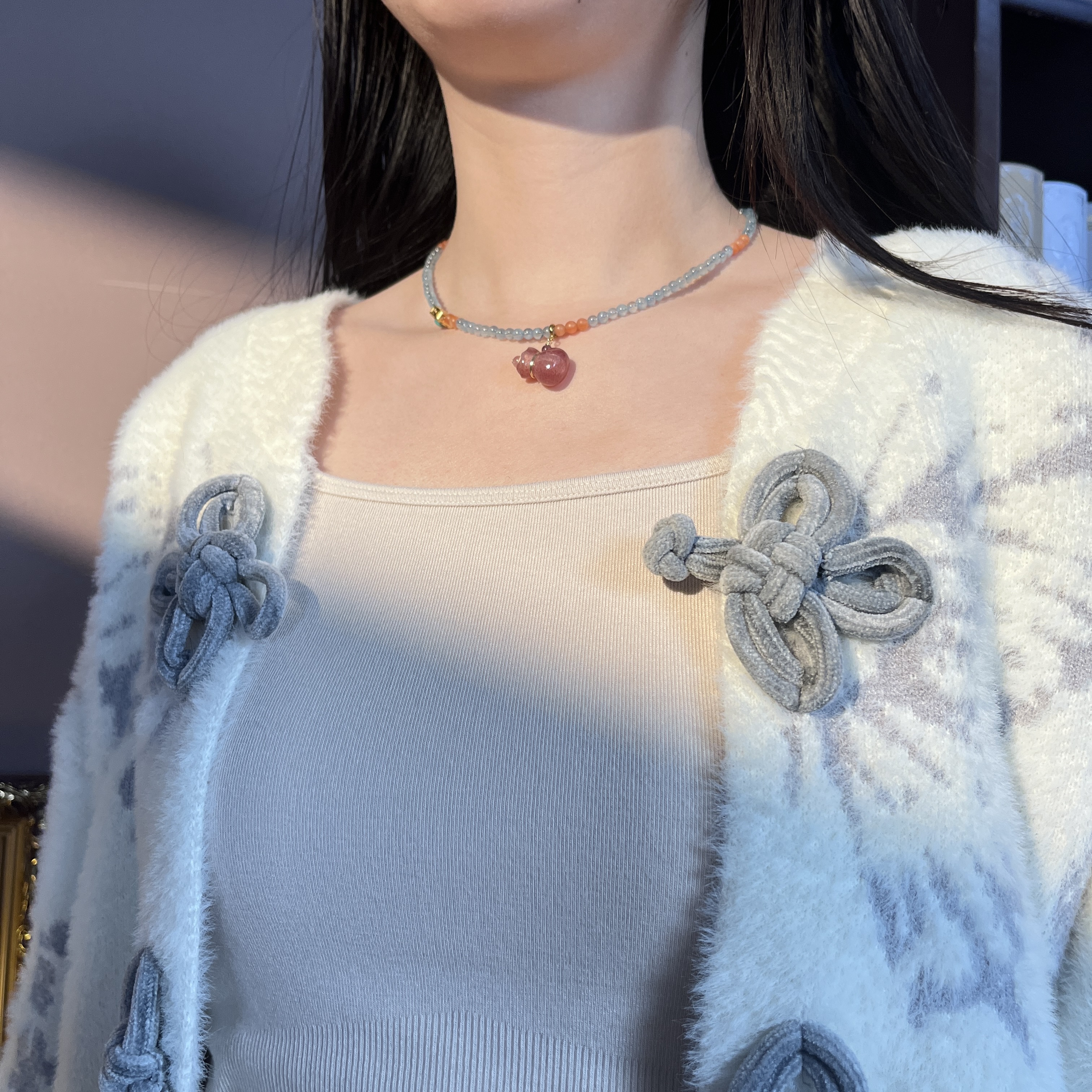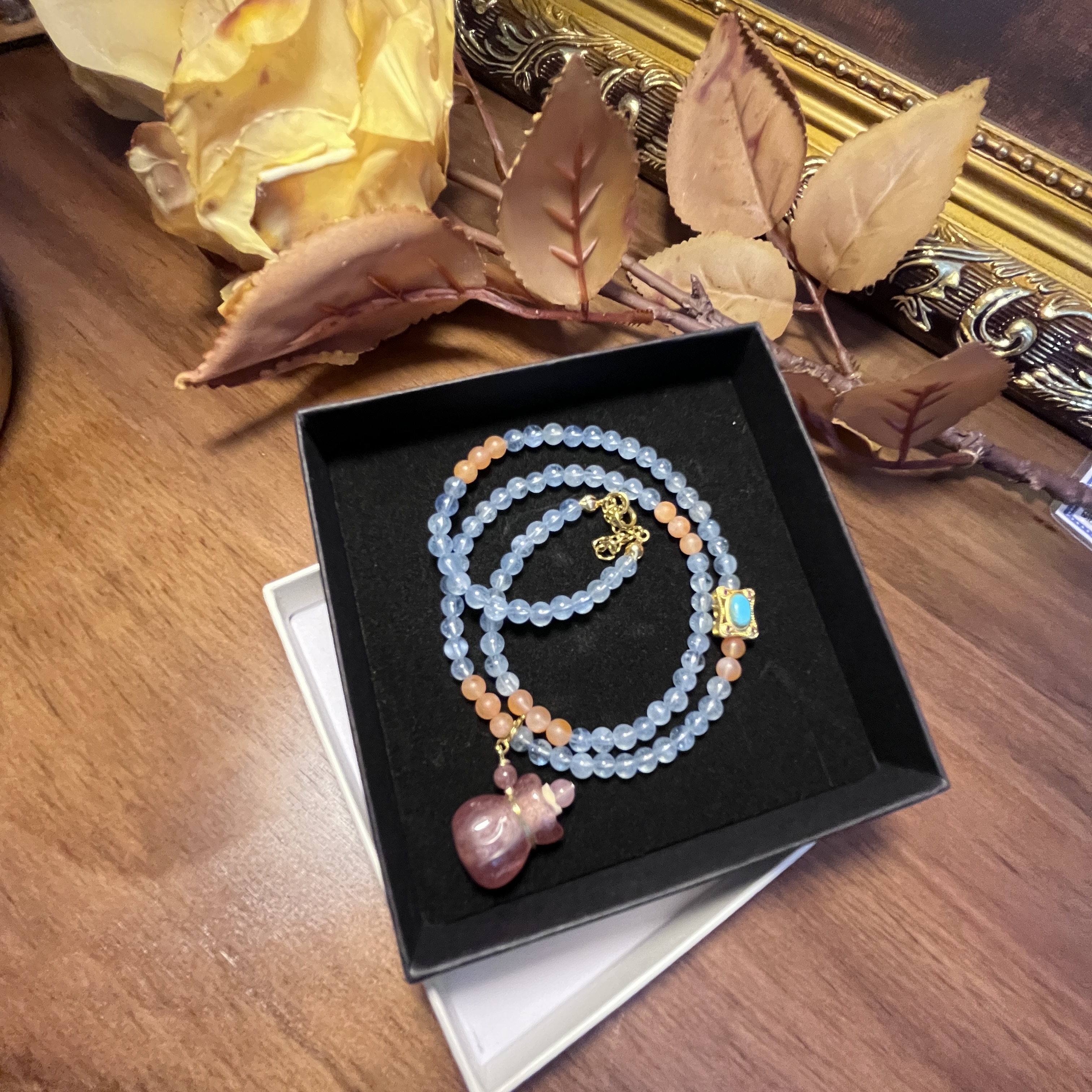 [蓝海幽梦精油香氛项链]通透明媚的天然海蓝宝水晶项链搭配南红和草莓晶香氛瓶【长度(cm):40+3(延长链)】