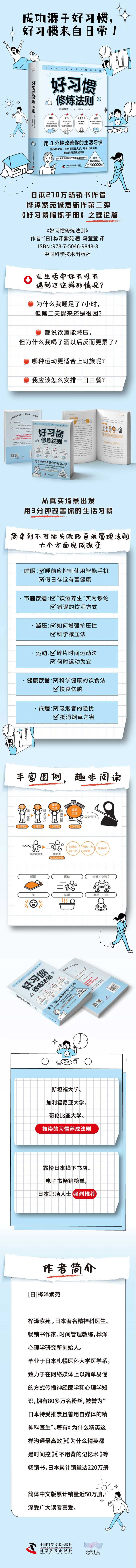成功源于习惯,习惯来自日常! 日本百万畅销书作者、备受推崇的精神科医生桦泽紫苑诚意新作第二弹——《好习惯修炼法则》,集结Z新研究成果,进行专业解读,提出养成好习惯的万能法则! 这个世界上没有解决不了的难事,只有不善于应对难事的人。实践桦泽医生从改善睡眠、运动、健康饮食、戒烟、节制饮酒及减压这六个方面提出的养成习惯法则,坚持并自省,将帮助你去往更远的地方。 ·睡眠 √7小时为Z佳睡眠时间 √定制Z佳睡眠环境 ·运动 √每天至少运动15分钟 √运动可消除疲劳 ·健康饮食 √吃好三餐 √食补为上 ·减压 √适度压力提振状态 √科学减压法