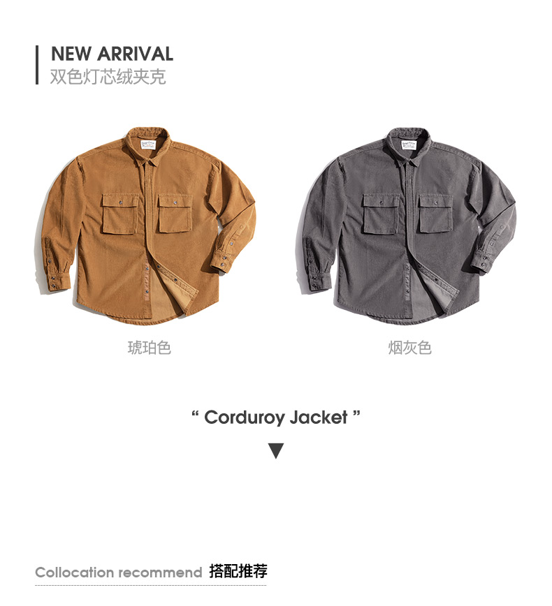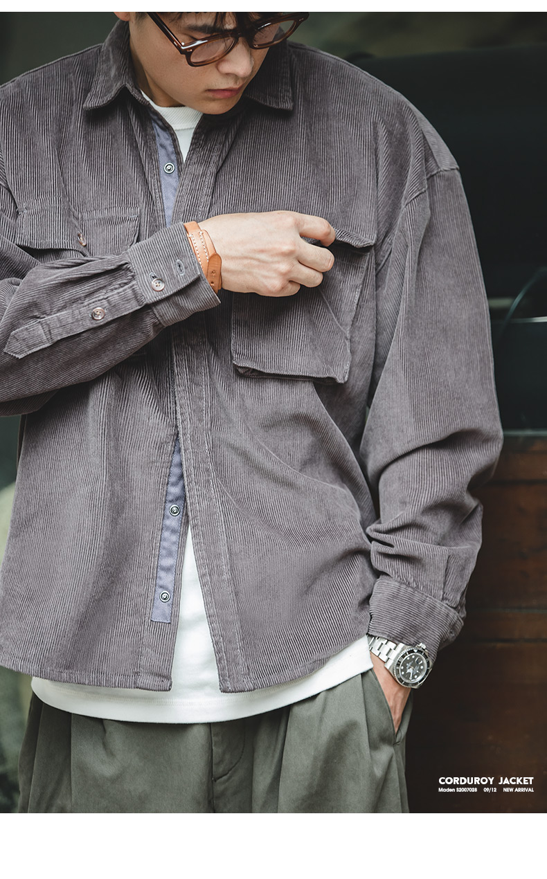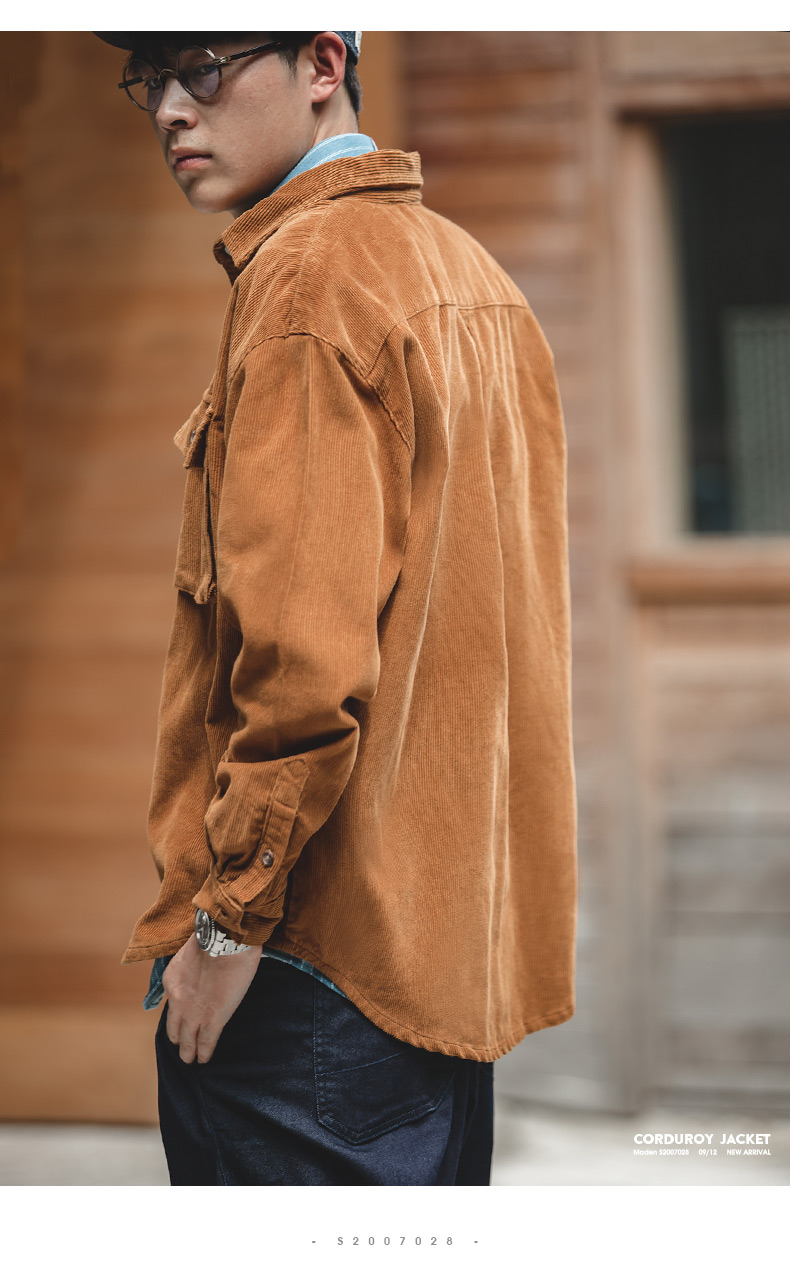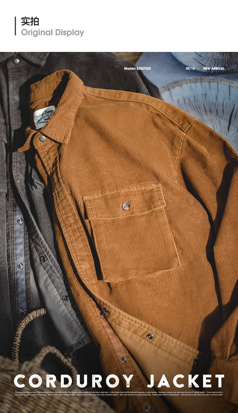 工装优选 美式复古宽松夹克灯芯绒翻领古着痞帅外穿口袋薄衬衫男春