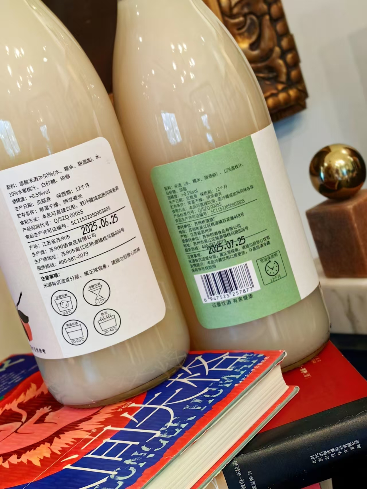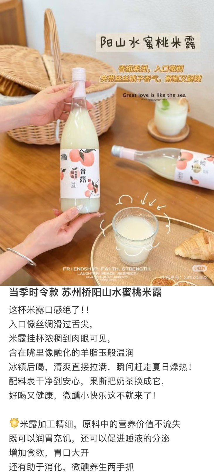 好原料酿好酒,苏州桥米露选用曾为皇家贡米的太湖单季圆糯米,色泽莹白、口感黏糯、米香浓郁,成本远高于普通酿酒米。而水蜜桃米露还加入大名鼎鼎的阳山水蜜桃,果型饱满、汁水丰盈,与米酒融合后醇厚米香与清新桃香交织,余韵悠长令人不舍饮水冲淡。荔枝米露更是用粒大饱满的荔枝蜕壳去核后取果肉榨汁入酒,开盖瞬间米露与荔枝香气的就扑面而来,入口如鲜榨荔枝果汁般清甜,带有一丝发酵的微酸,好过瘾!