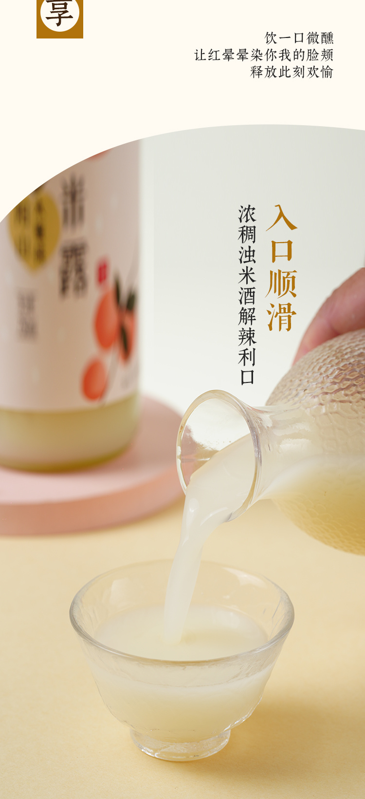 米露堪称米酒升级版,酒体更丝滑,米香更绵长,颜值也更出众,酒精度>0.5%vol,不会喝酒也轻轻松松,冰镇后口感温润稠滑、香甜不腻,宛如冰镇酒酿圆子汤,空口喝都不觉甜腻。两种口味都很清润可口,层次也很丰富,建议冰镇后喝喝,更能激发出米露的香味,炎炎夏日倒上一杯,柔顺爽口,真的解压!