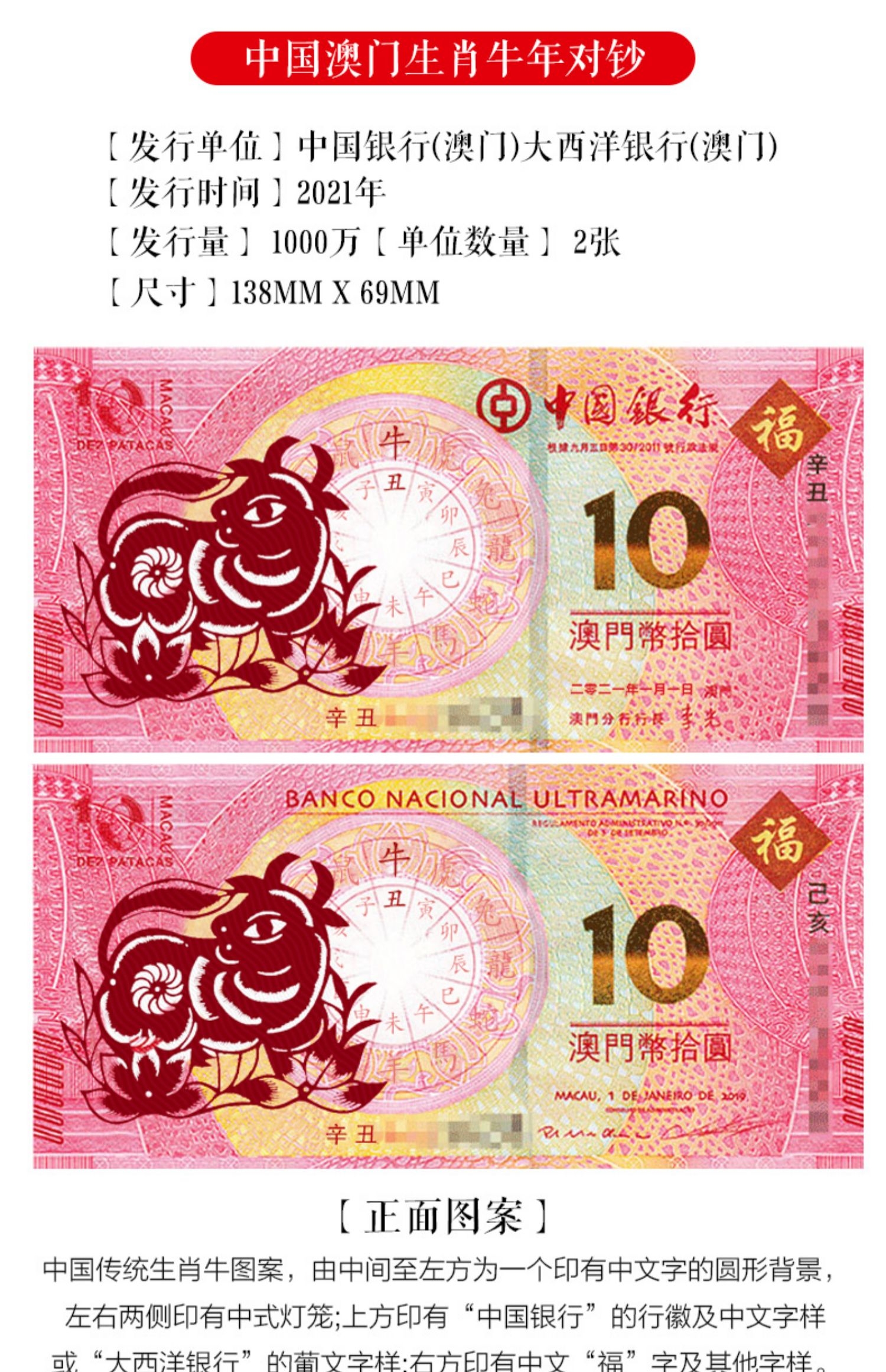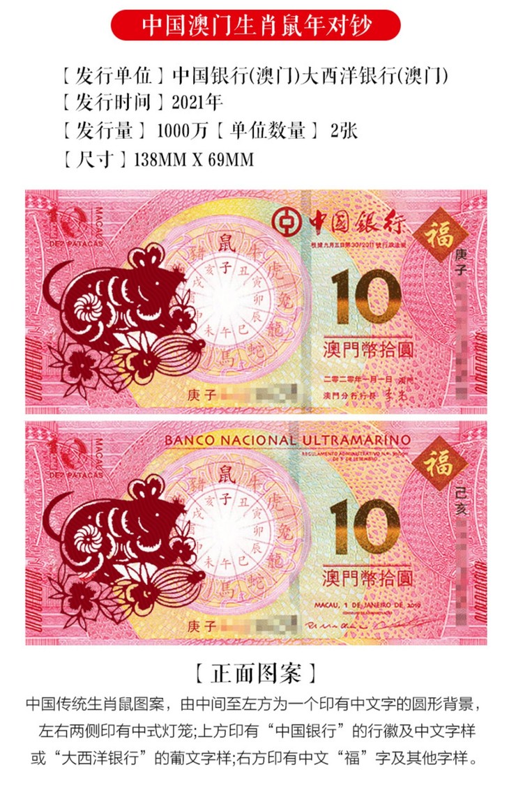 澳门发行的生肖纪念钞每年每家发行银行的发行量只有1000万套,我们特为您挑选后四位号码相同的一配对,更具收藏价值!