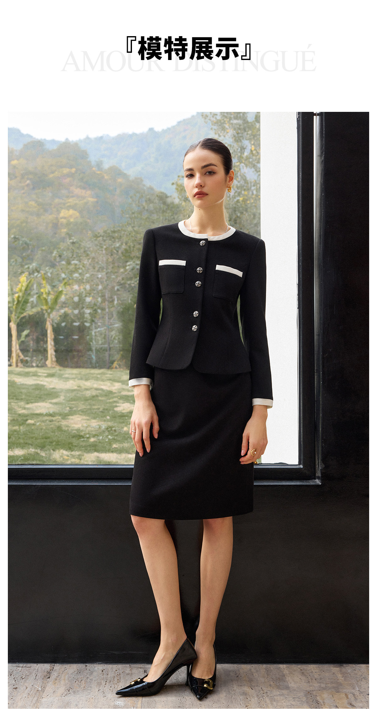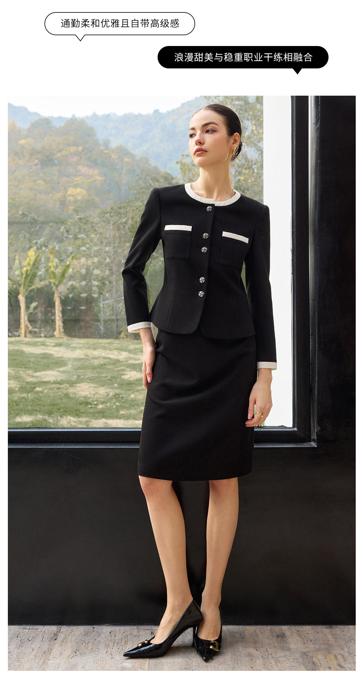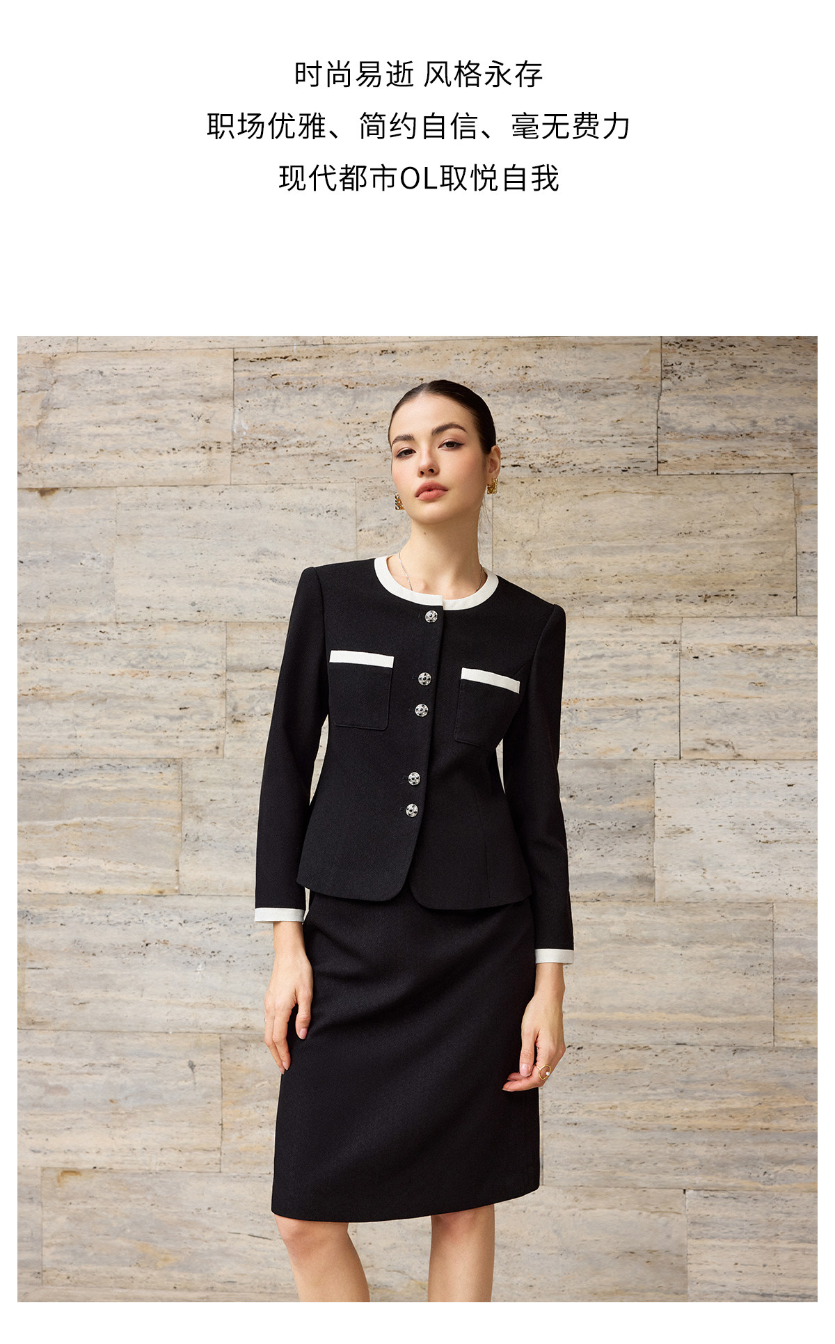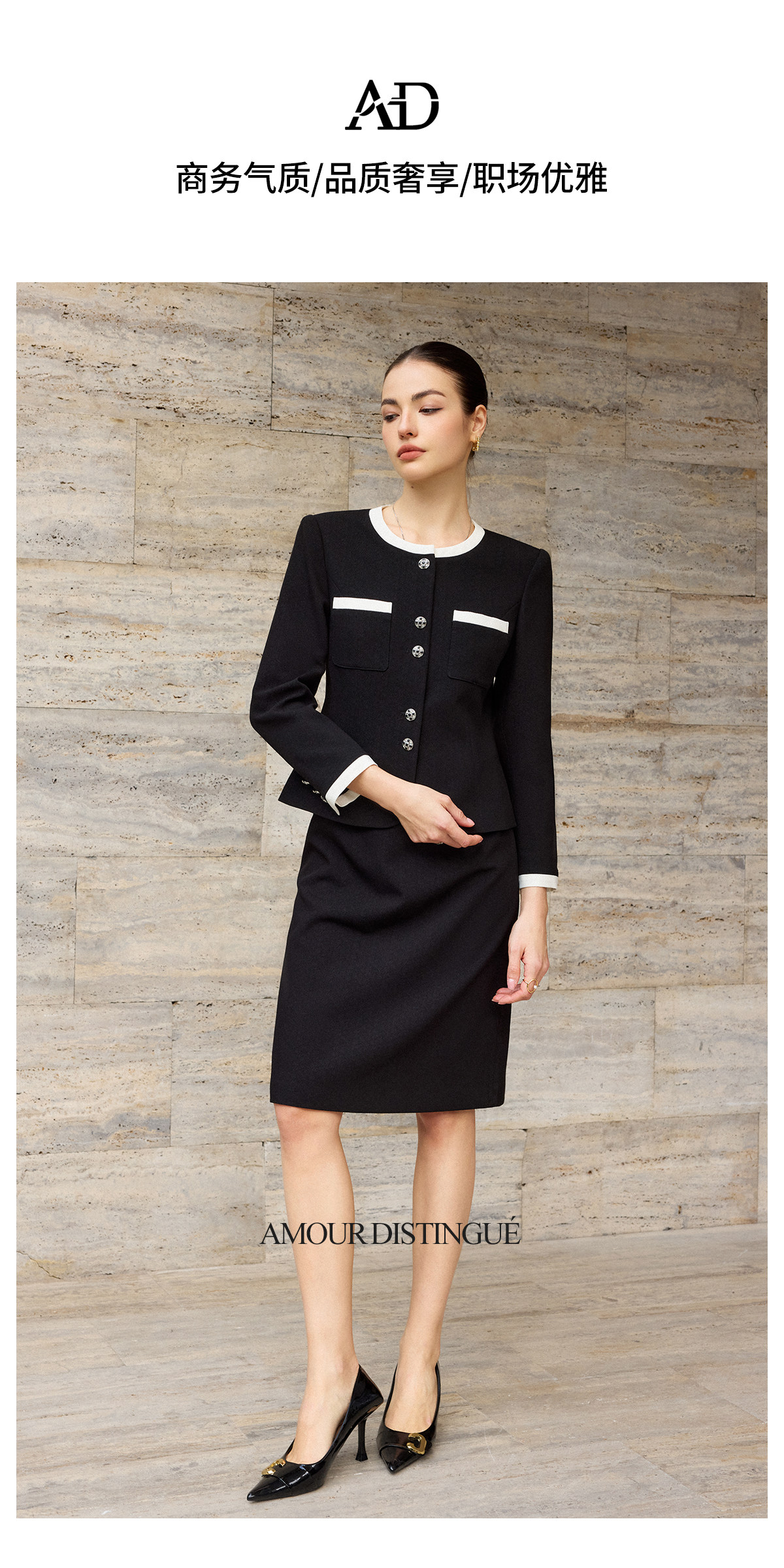 AD高腰显瘦职业装套装2026年春季长袖两件套黑白拼色上衣半身裙子