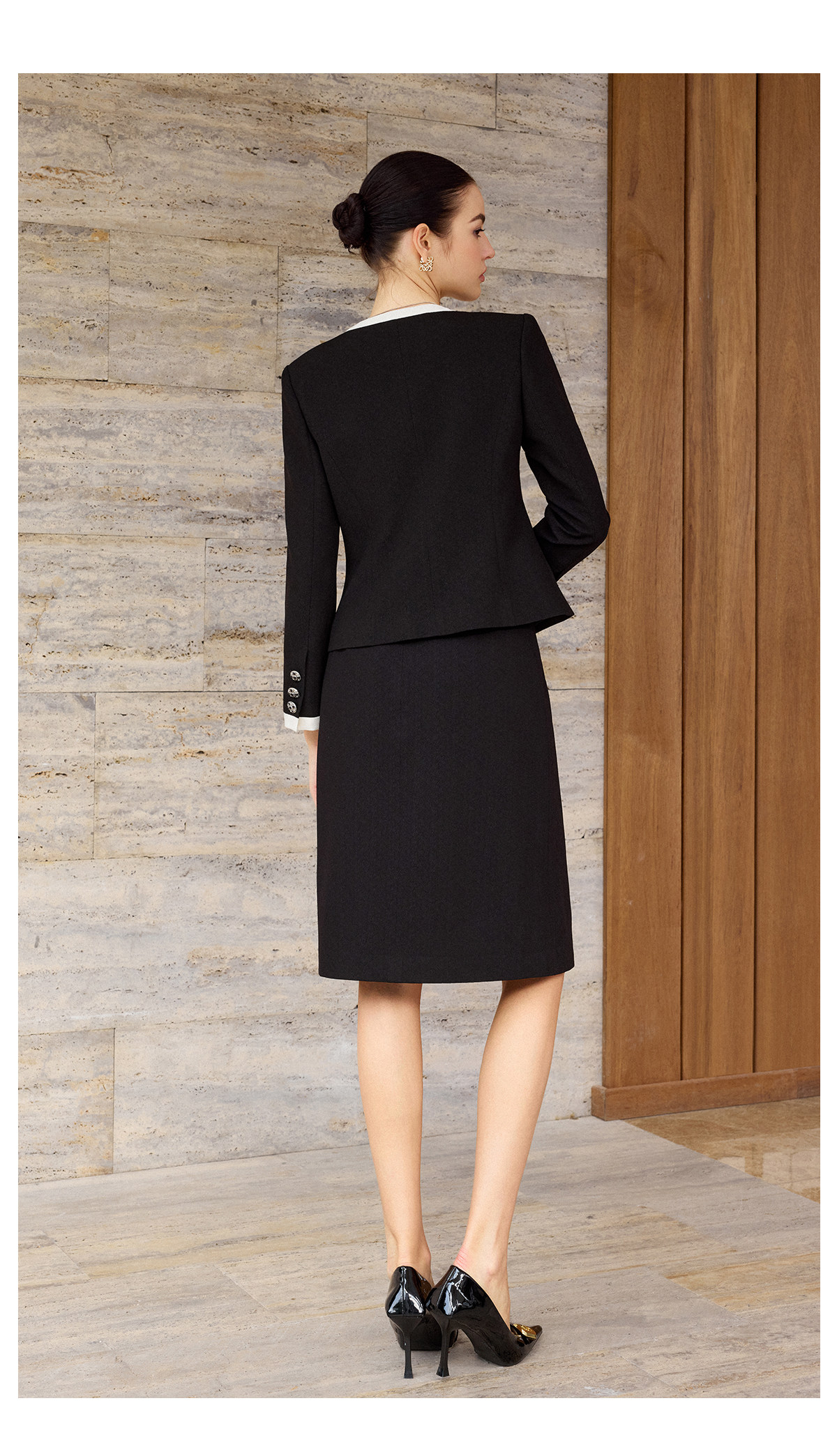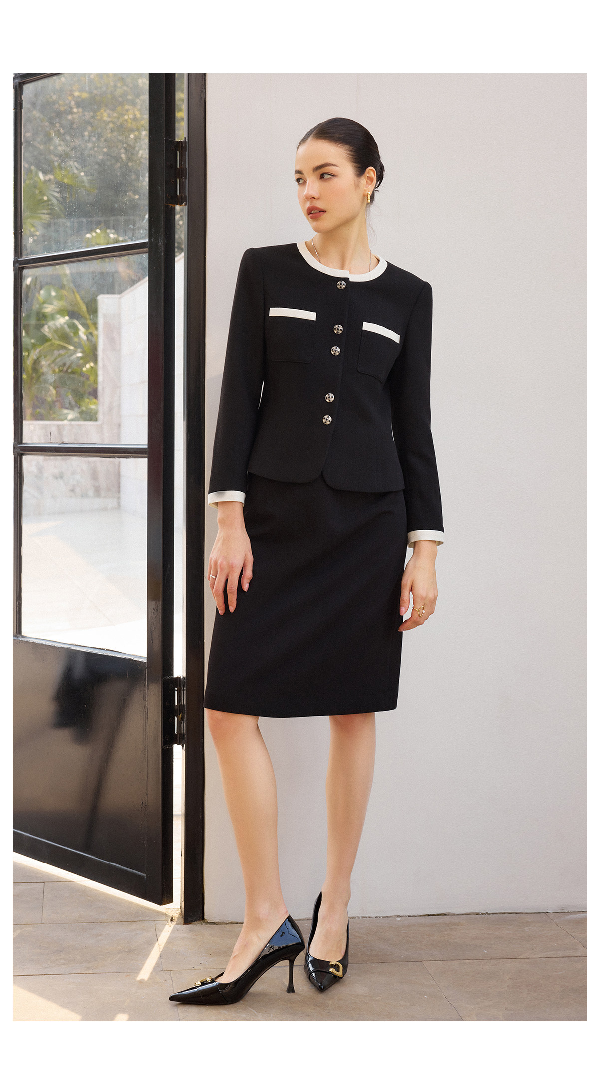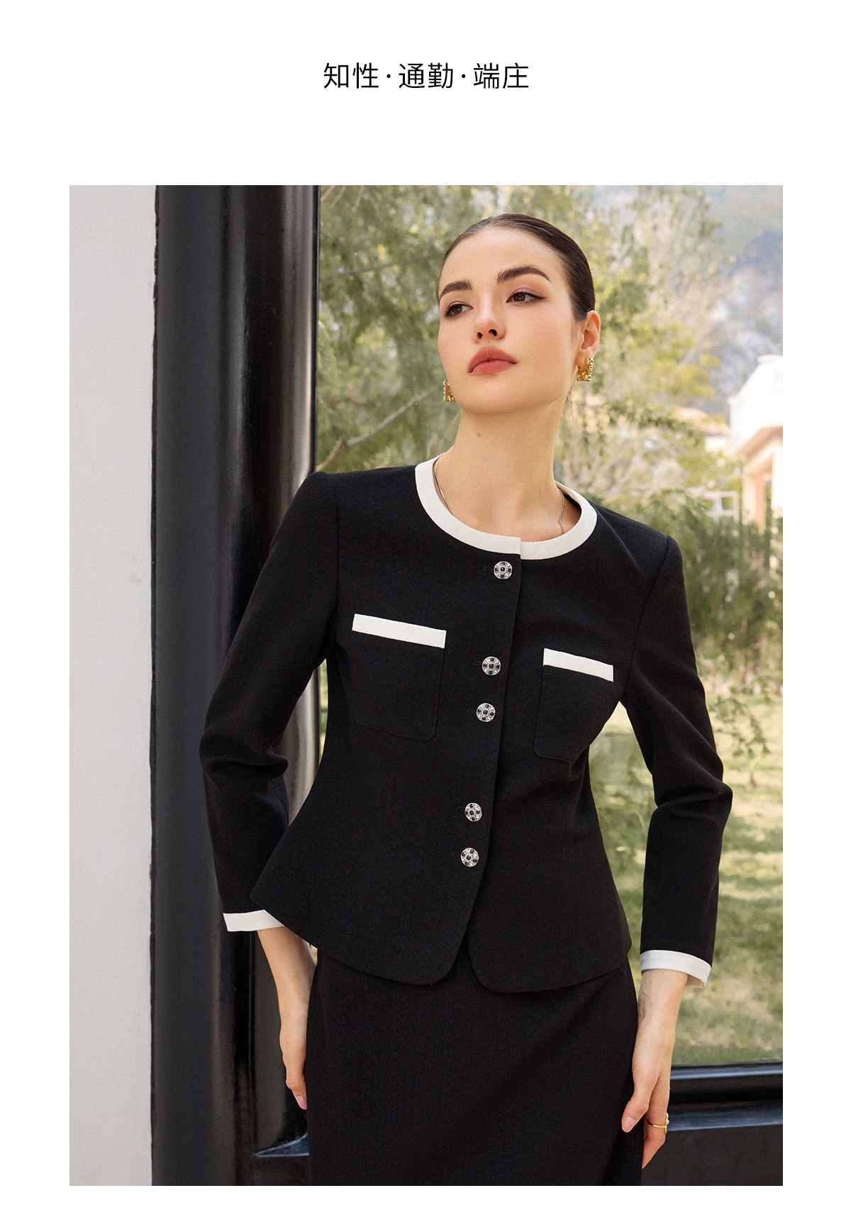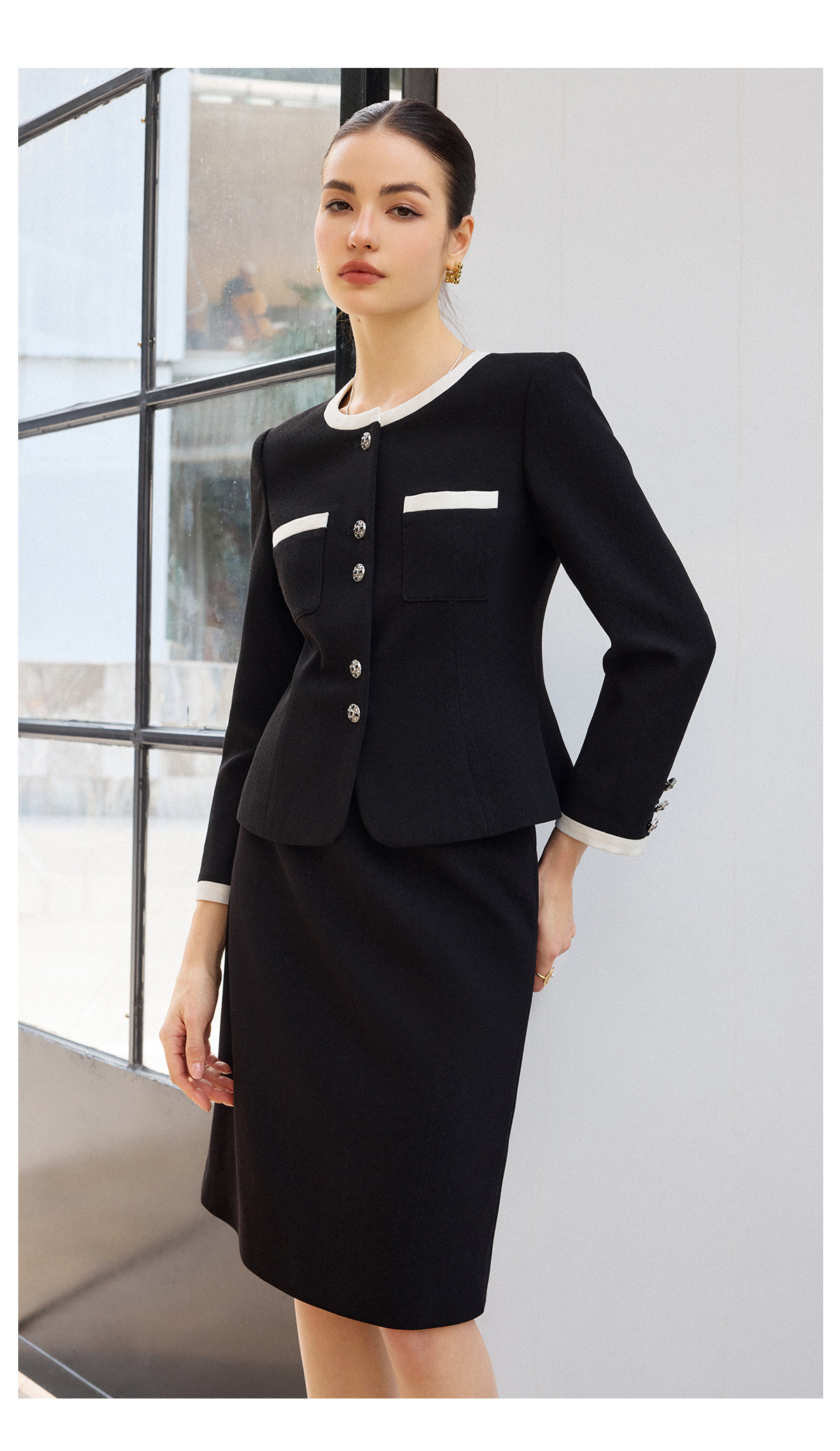 AD高腰显瘦职业装套装2026年春季长袖两件套黑白拼色上衣半身裙子
