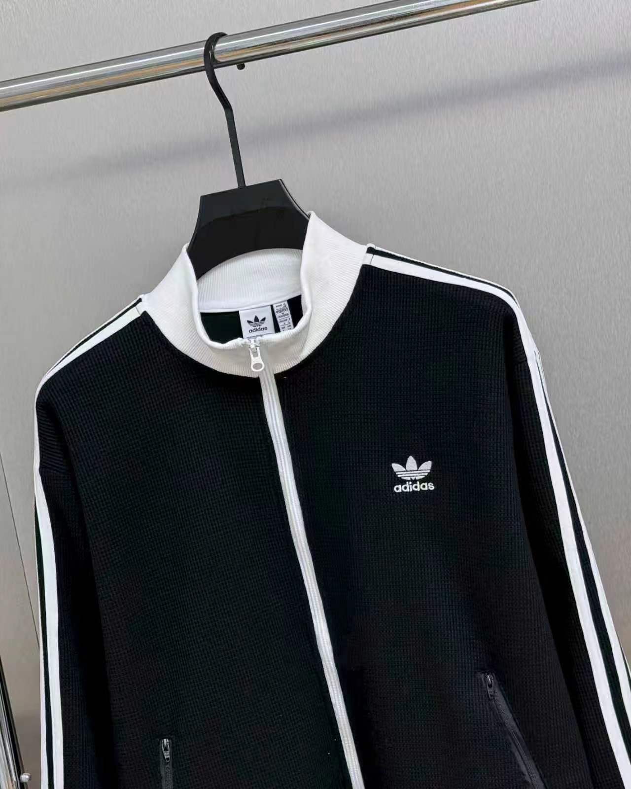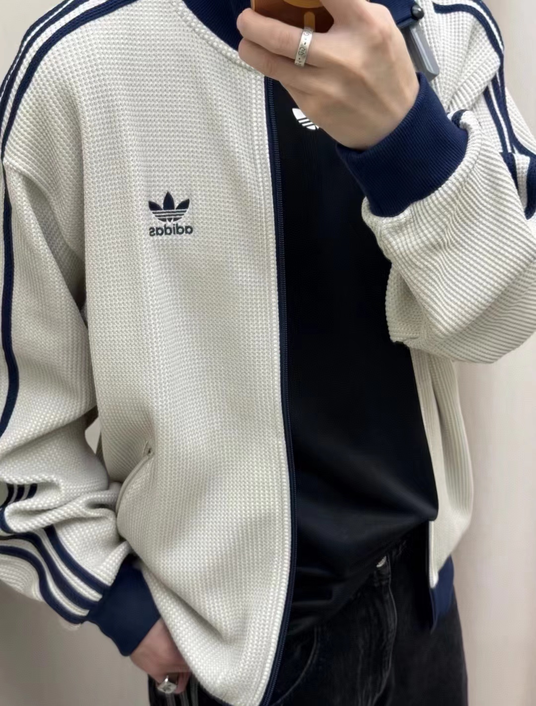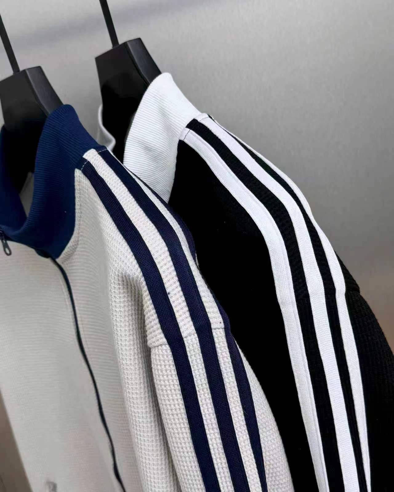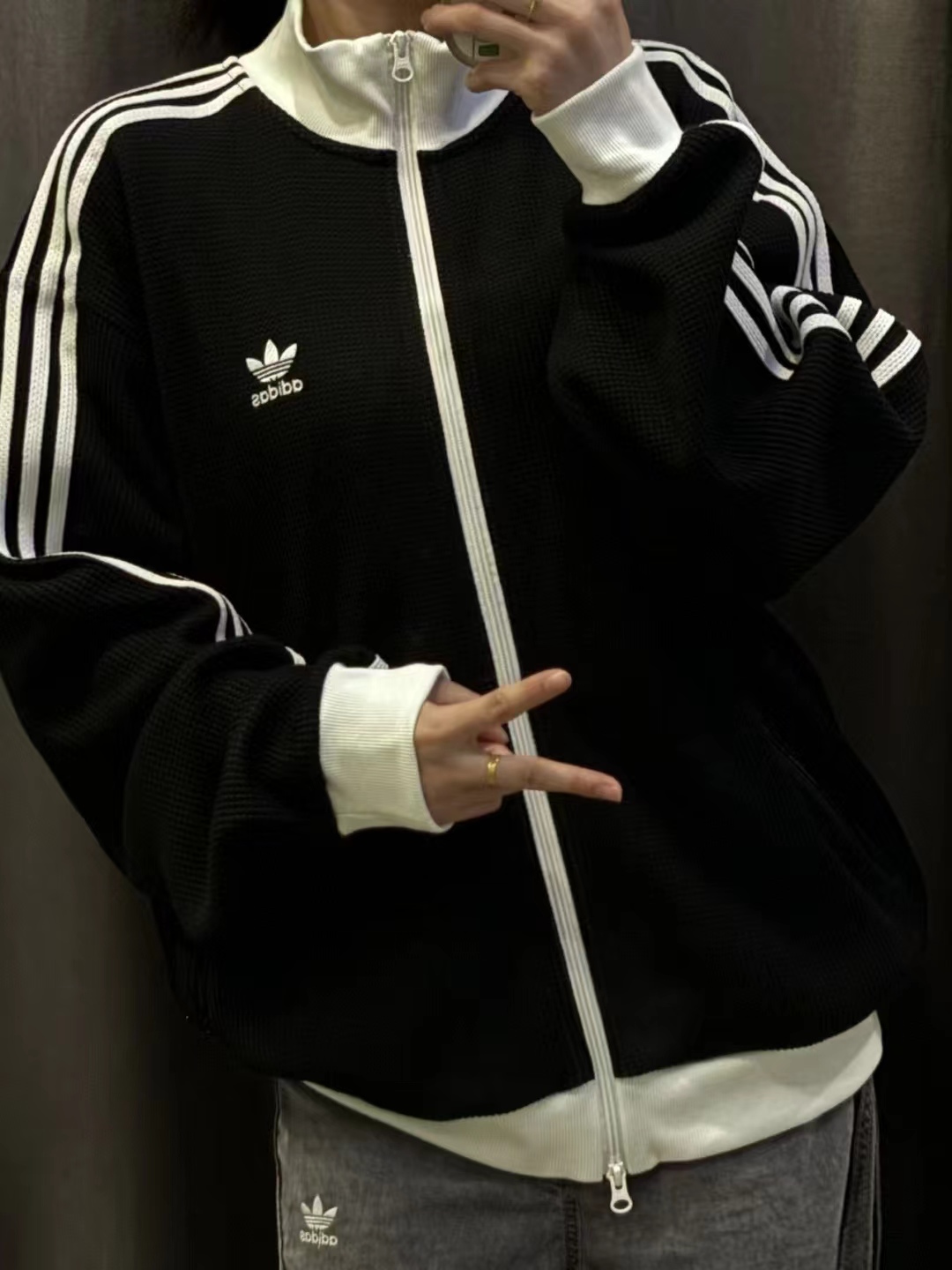 男女同款针织华夫格立领运动宽松夹克外套,华夫格420克复合面料! 同款提花记忆面料硬度适中 上身挺括不拖拉 初秋外穿 男女同款 情侣款 百搭 冬季内搭都适合 精典三杠条纹 定制YKK双开拉链