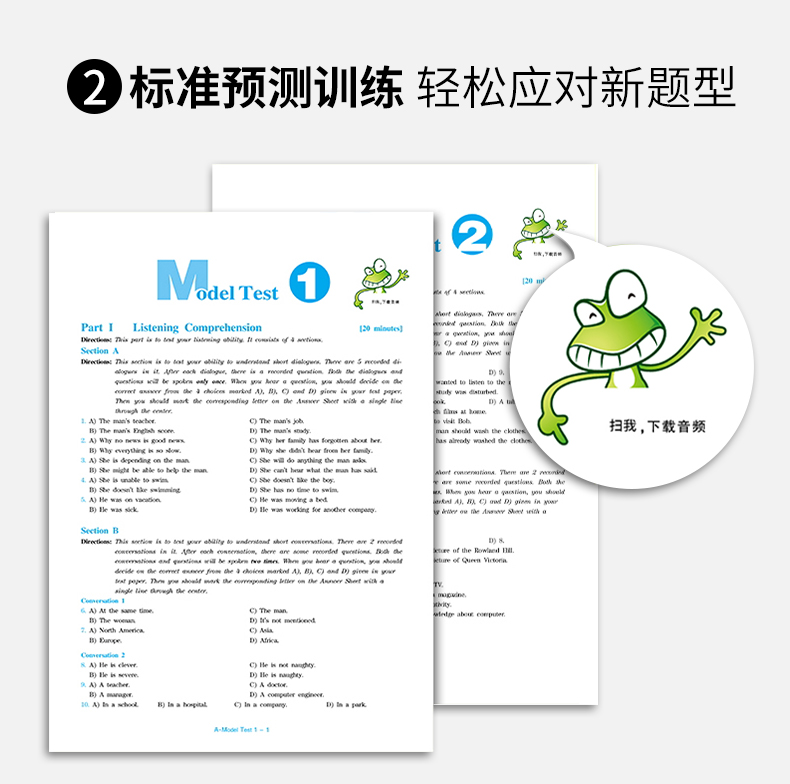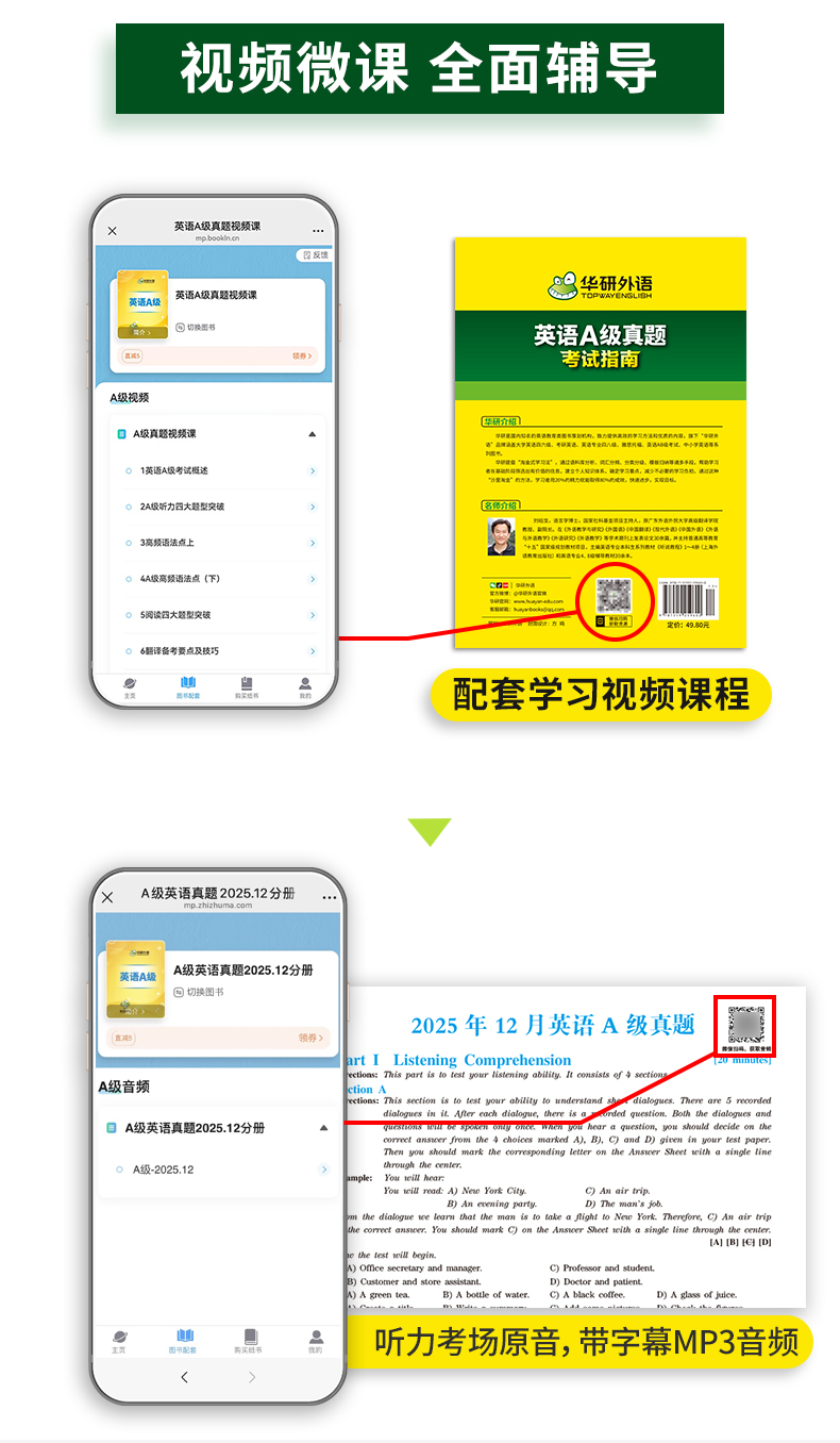 4. 扫码获取音频及字幕,含英语A级真题、预测题、听力专项指导的听力部分,以及高频词汇录音;
