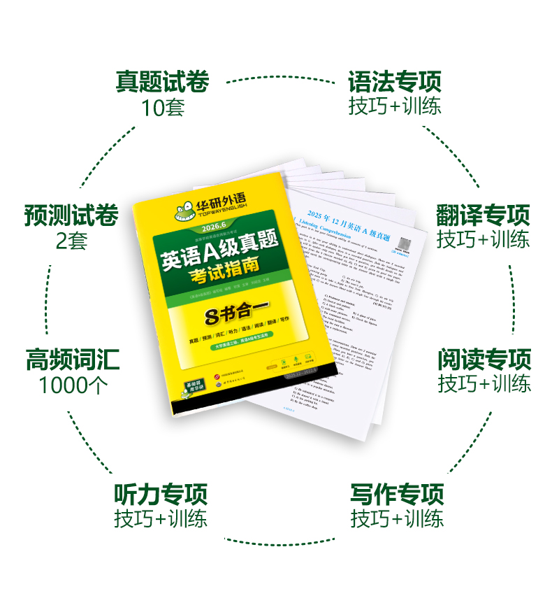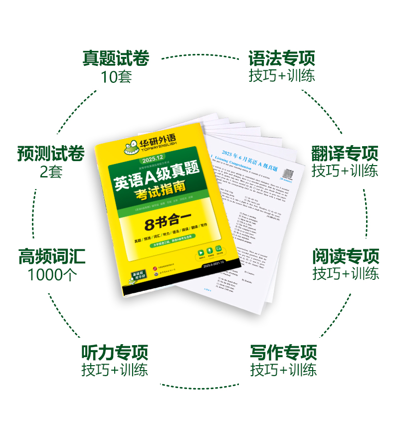 1. 八书合一,含英语A级真题详解+预测试卷+高频词汇+听力专项+阅读专项+语法专项+翻译专项+预测作文,一本过级;