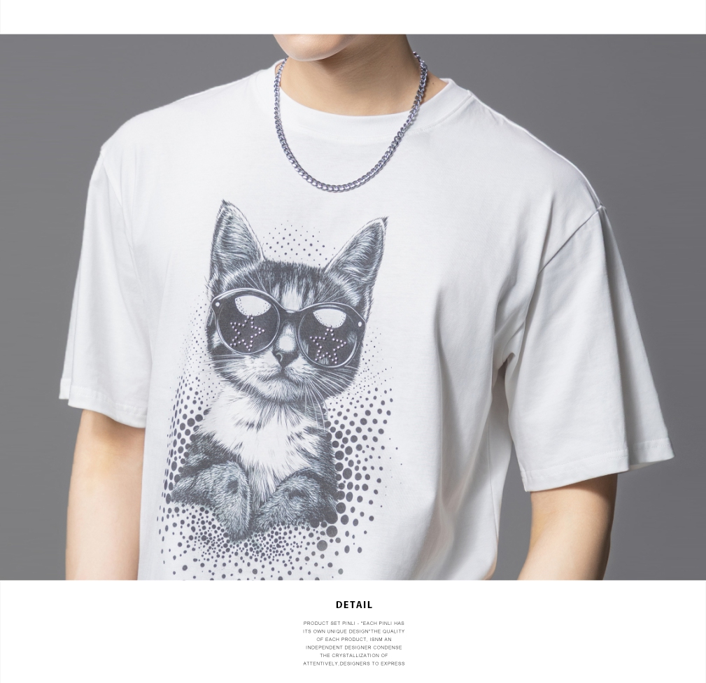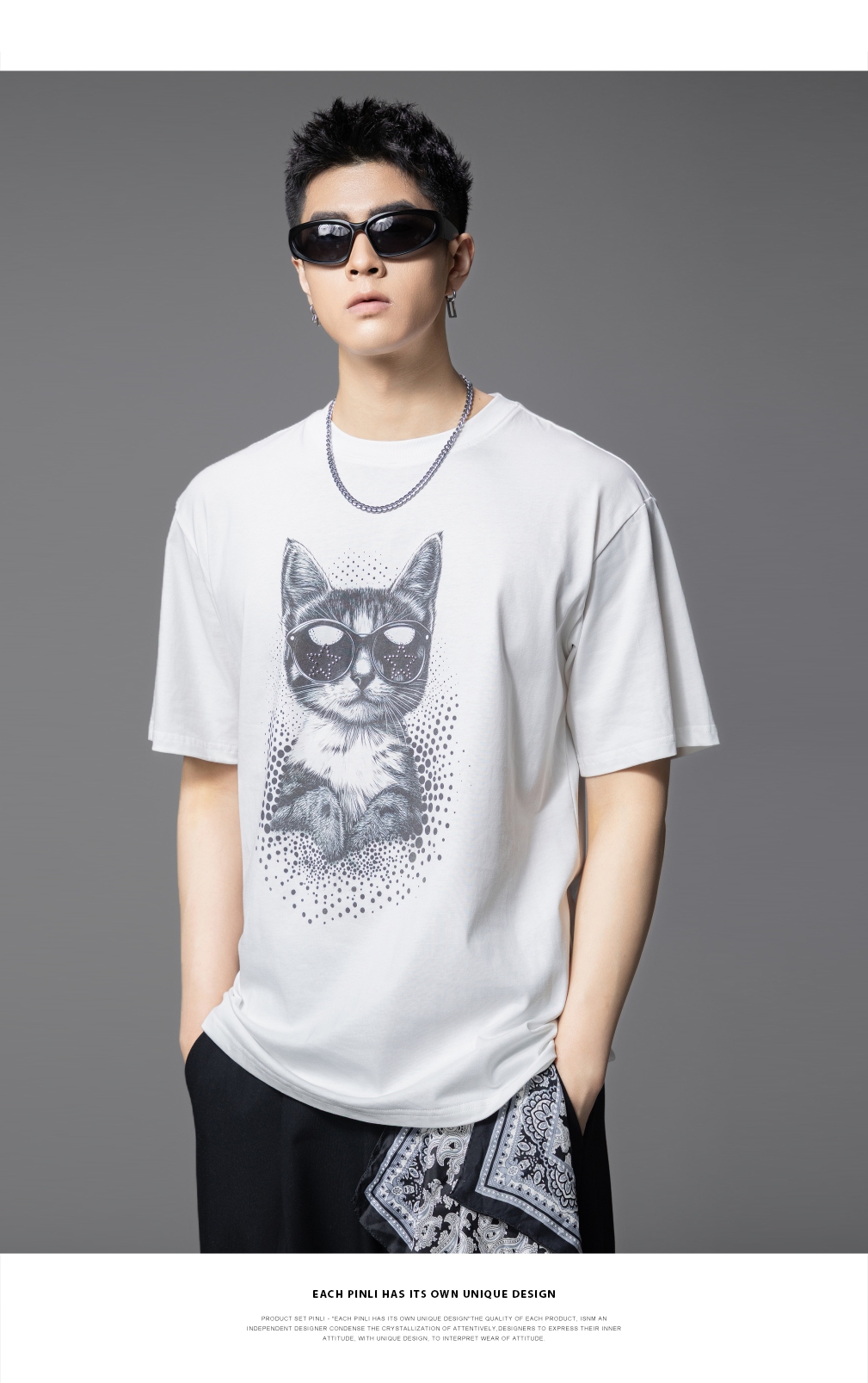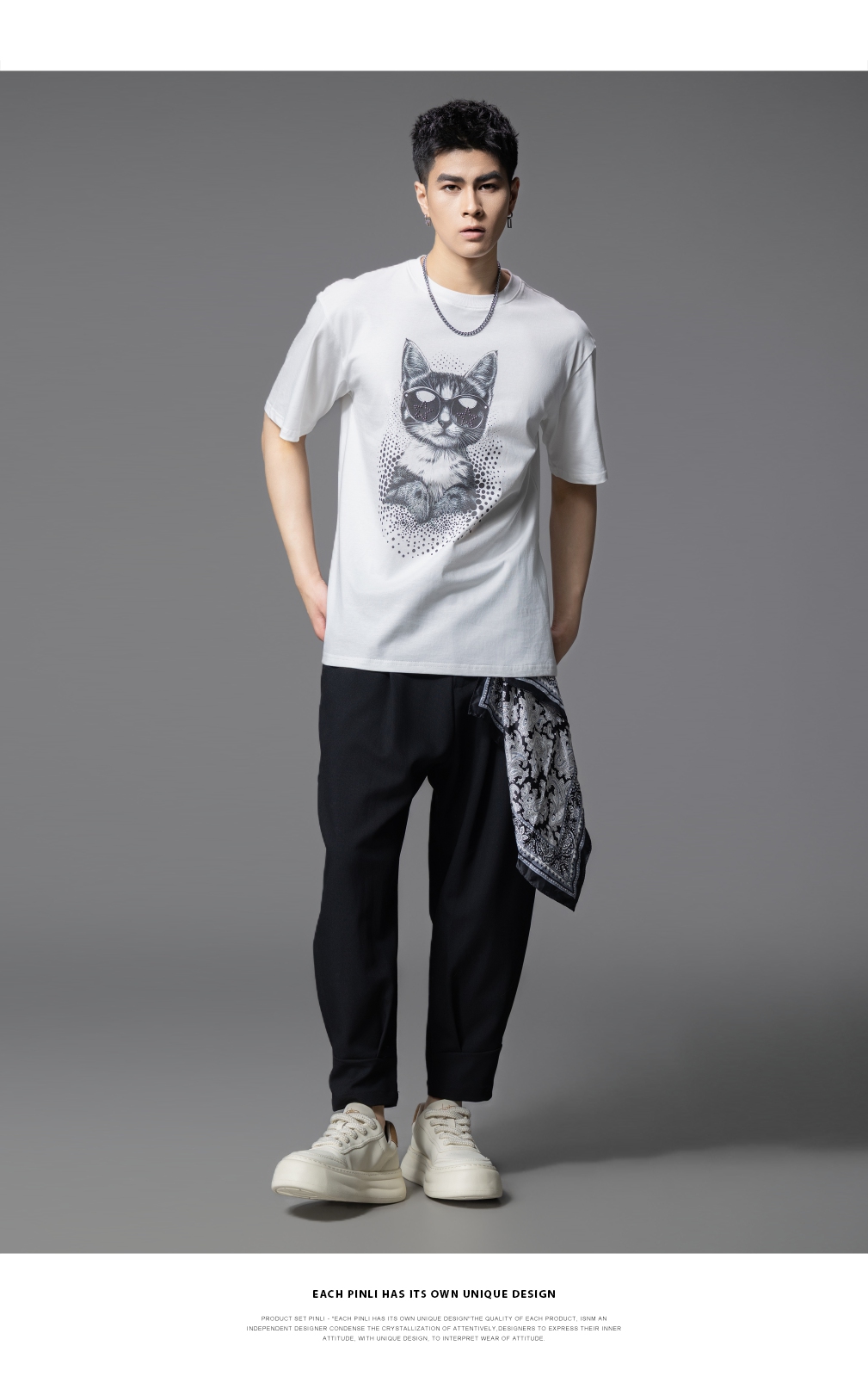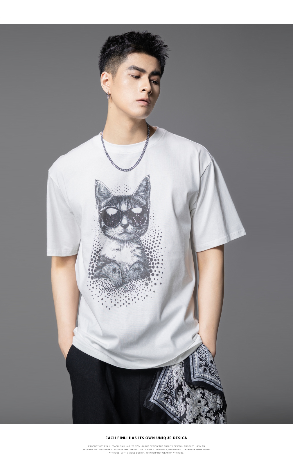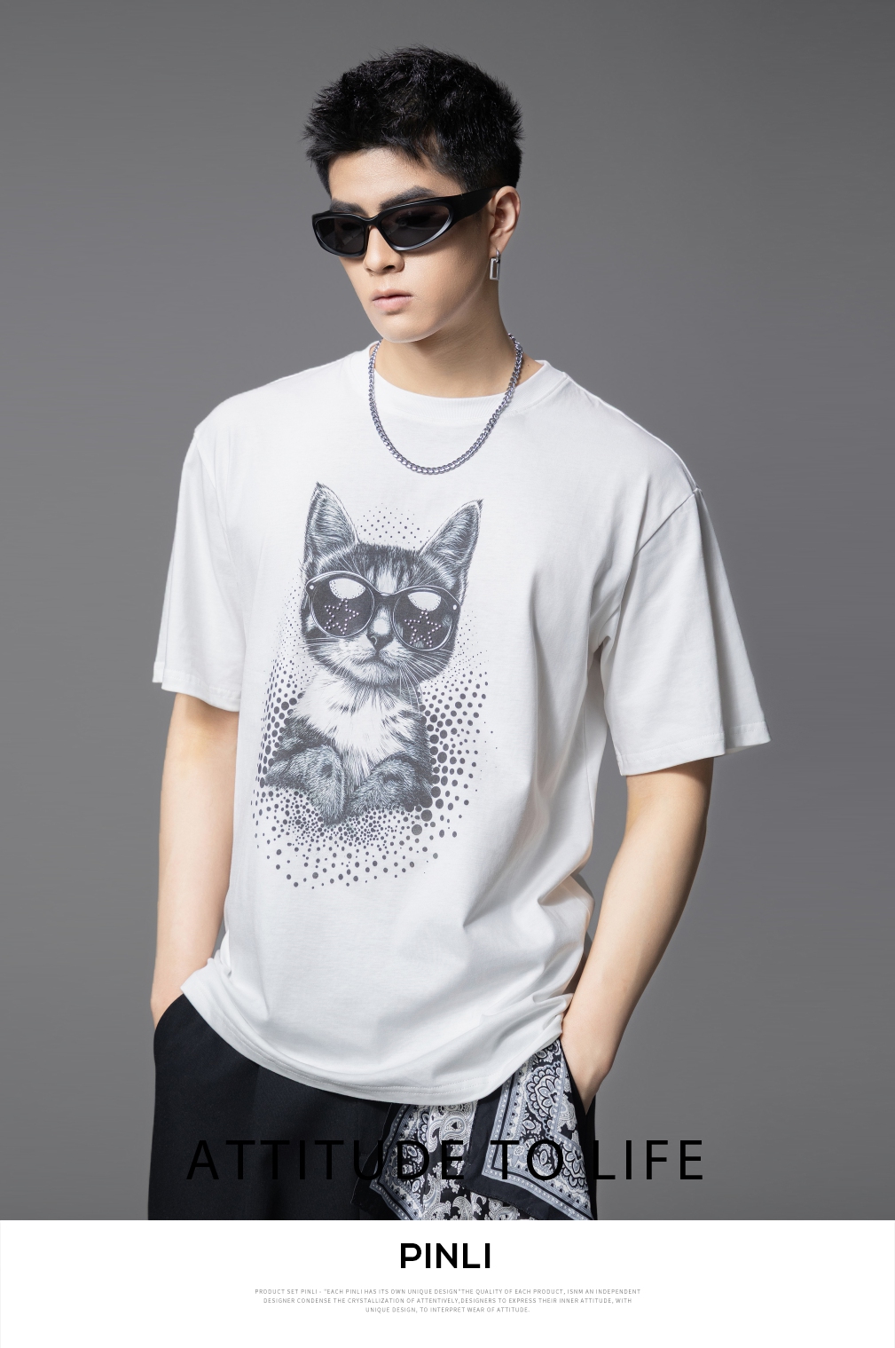 PINLI品立2025夏季新款男士猫咪印花金属烫片圆领短袖T恤上衣潮牌BG252111037