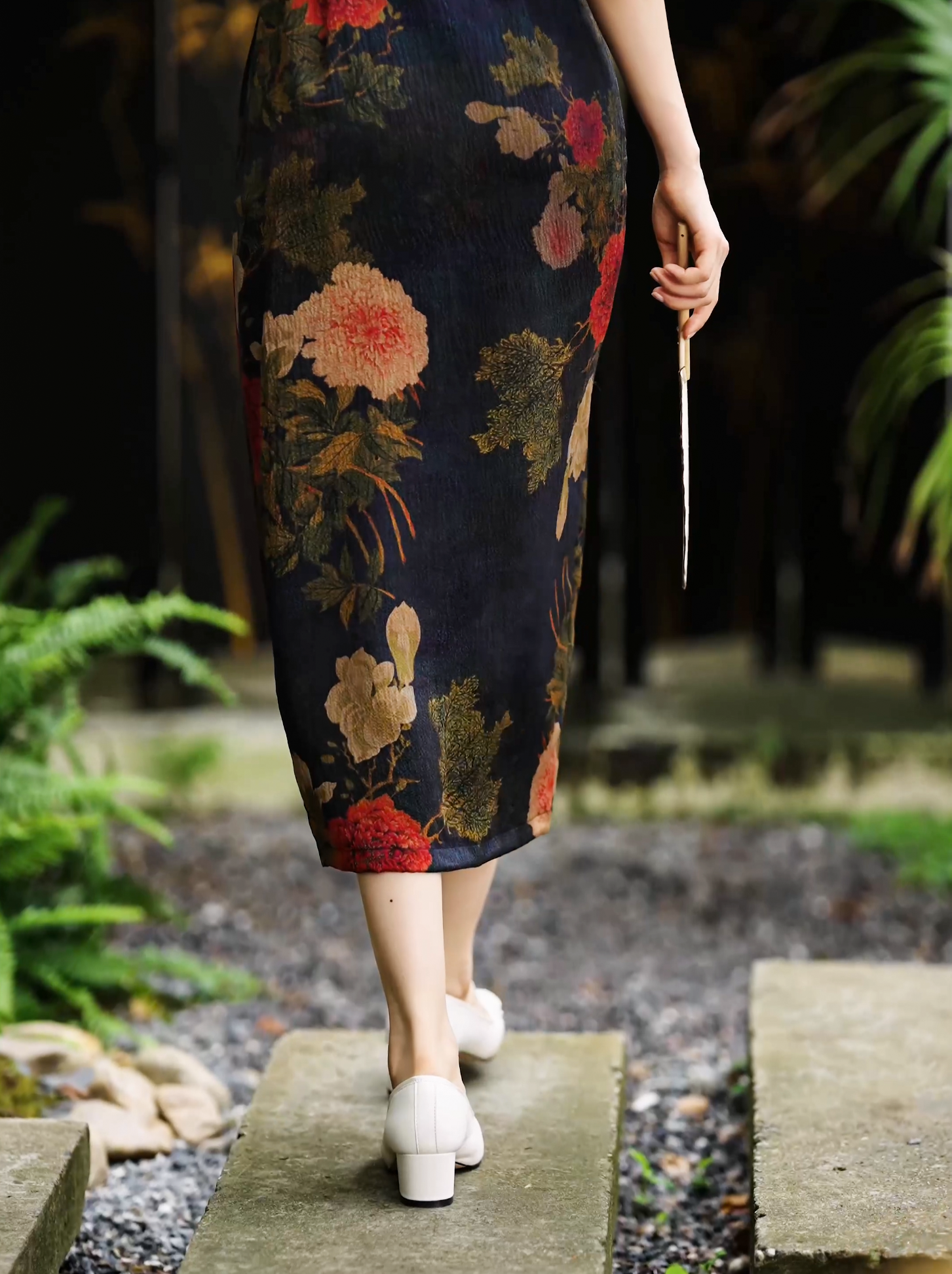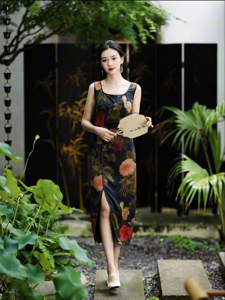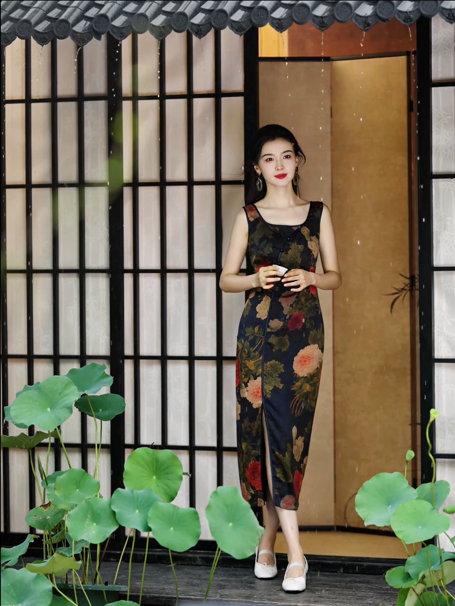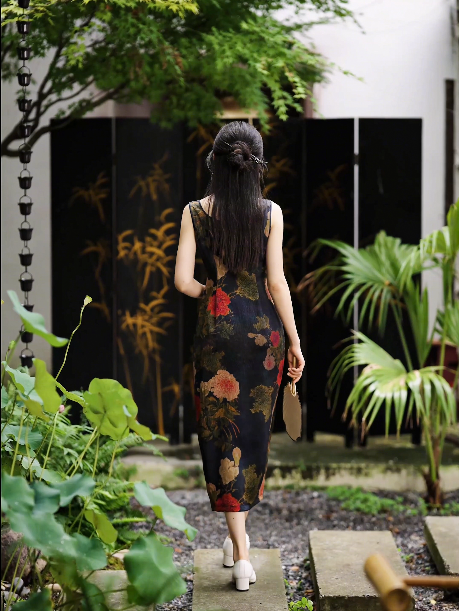 三醉芙蓉花纹的设计,底色为黑色,缓解身材焦虑,穿着更显瘦,更日常~上班通勤,喝茶小聚,都是不同的选择~!