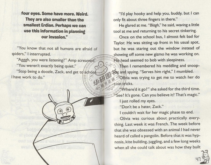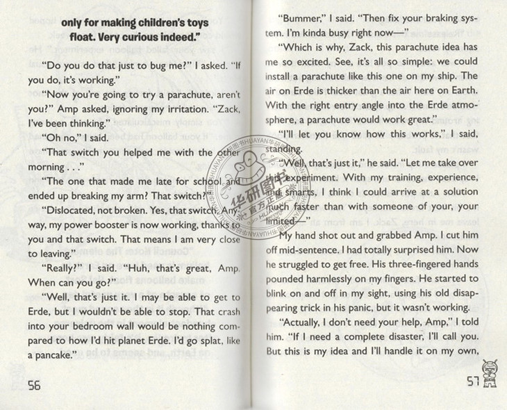 与外星人的奇妙冒险!一套体验科学实验的书!当一个4英寸的外星人安普意外冲进扎克的卧室时,扎克确定他要成为新一轮世界大战的第一个牺牲者了。但之后,他开始保护这个小小外星人并帮他寻找回家的路。除了幽默的冒险故事外,书后还有科学实验等你来做!想要用矿泉水瓶亲手做出会飞的火箭吗?想亲自造出简易电磁铁吗?快来动手吧!
