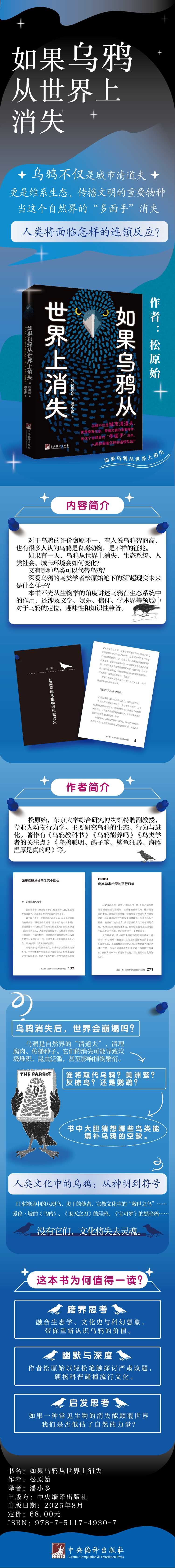 不管在日本还是中国,乌鸦都是常见的鸟类。对于乌鸦的评价褒贬不一,有人说乌鸦智商高,也有很多人认为乌鸦是食腐动物,是不祥的征兆。如果有一天,乌鸦从世界上消失,生态系统、人类社会、城市环境会如何变化?又有哪种鸟类可以代替乌鸦?深爱乌鸦的鸟类学者松原始笔下的SF超现实未来是什么样子?本书不光从生物学的角度讲述乌鸦在生态系统中的作用,还涉及到文学、娱乐、信仰、学术界等领域中对于乌鸦的定位,趣味性和知识性兼备。