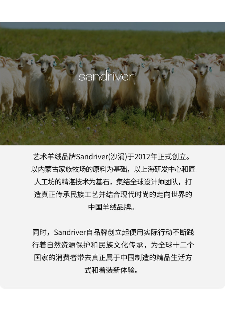 历年在巴黎时装周亮相,享誉世界的艺术羊绒品牌[Sandriver 沙涓]由羊绒布道者郭秀玲女士创立。阿拉善自有牧场纯种羔羊绒,日本国宝设计师小筱顺子,上海自有基地精工细作。承载羊绒情怀,坚持匠人品质。